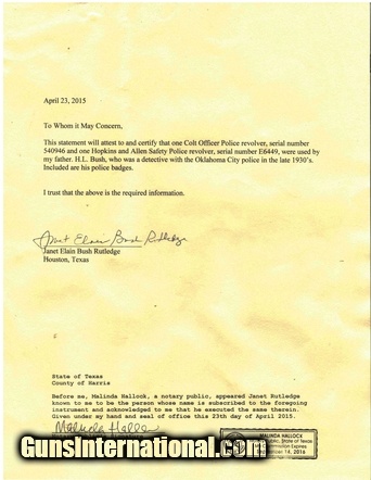 Description: " Hopkins & Allen Safety Police .38 S&W caliber revolver. Oklahoma City Police Detective revolver. Holster and badge with letter from the Detective’s Daughter. In the letter she states her father H.L. Bush. Was an Oklahoma City Police Detective in the 1930’s. Action works fine, Bore is very good and comes with a holster and his sergeants badge and his patrol cap badge from before he was made detective.