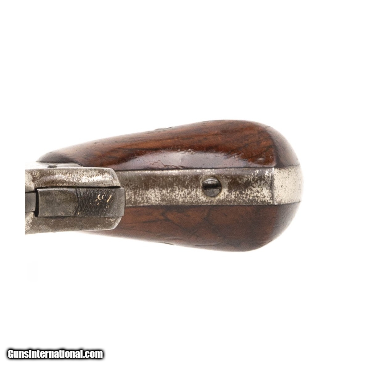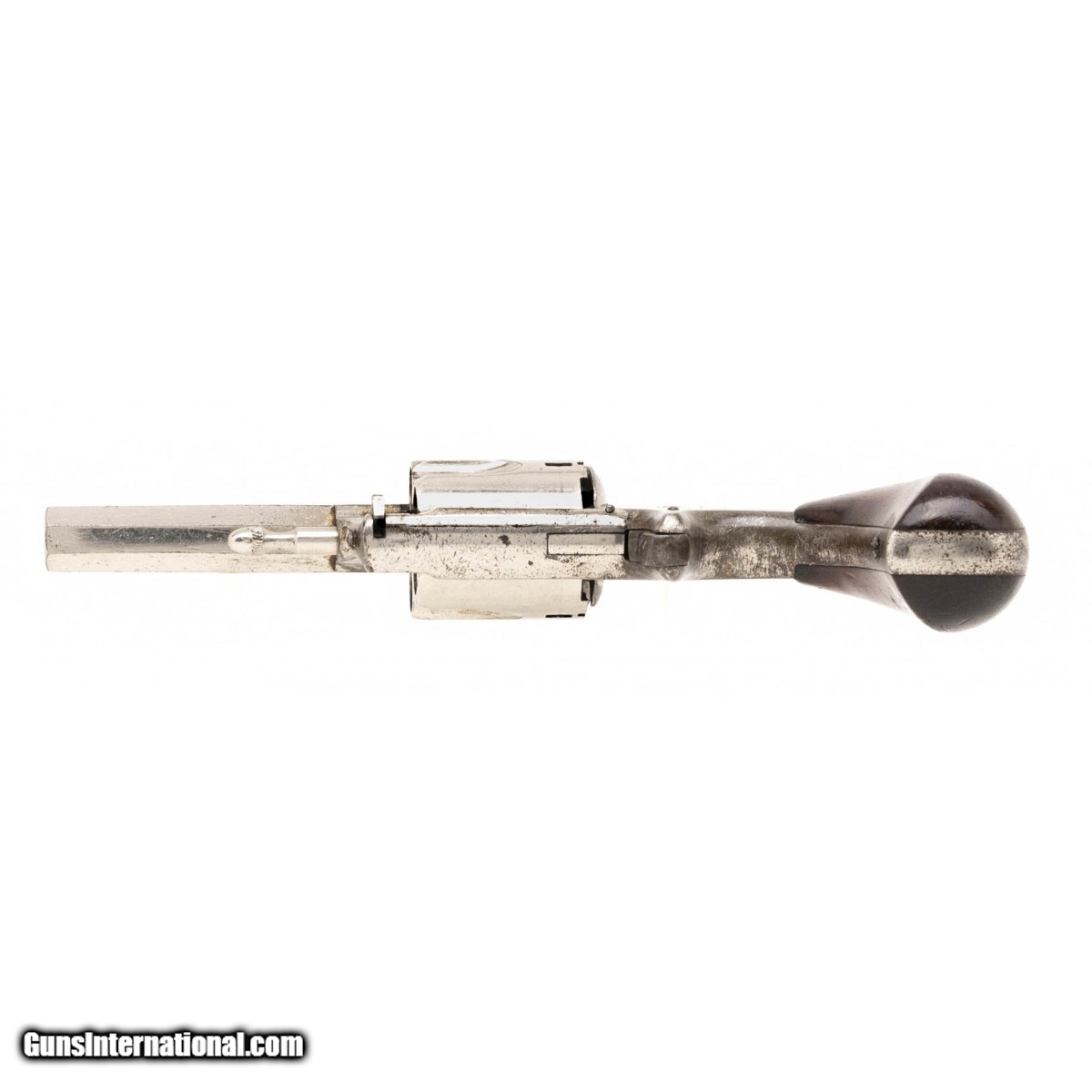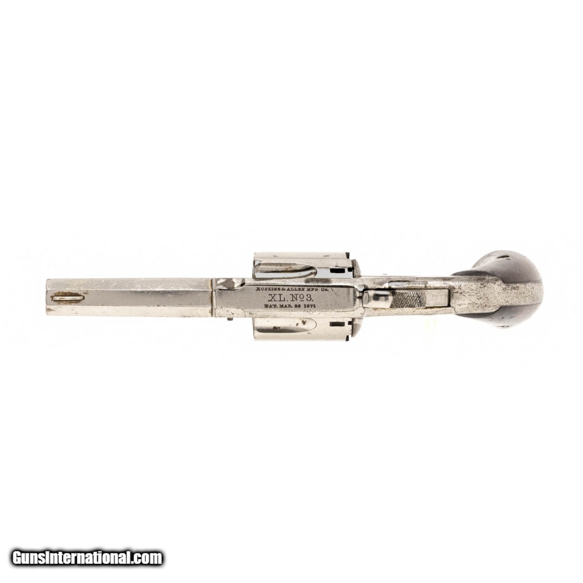 Description: " This 32 rimfire caliber Hopkins & Allen spur trigger revolver has approx. 85% of its original nickel finish with much of the loss on the right above the trigger. The 2 5/8"" octagon barrel has a fine bore with strong rifling and light erosion. The top strap is marked HOPKINS & ALLEN MFG. Co. over XL. No 3. over PAT. MAR. 23 1871. The grips are fine with most of their original varnish and no cracks or chips. The action functions but does not properly rotate the cylinder (but you're not going to shoot it anyway!). This is a nice looking H&A XL No. 3. SOLD Antique: Yes |
