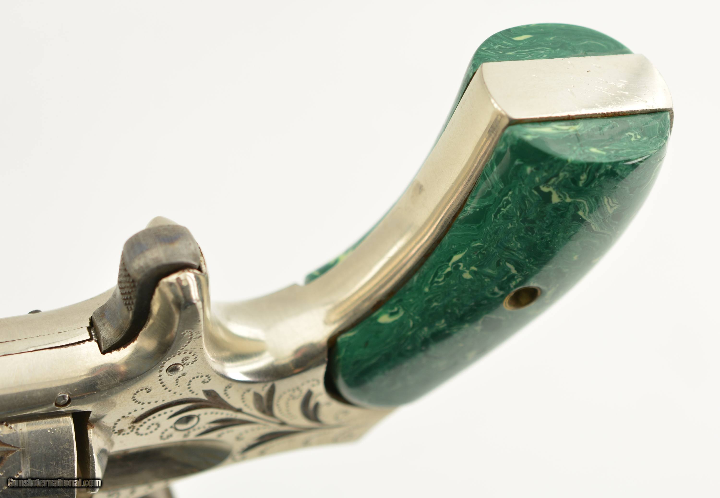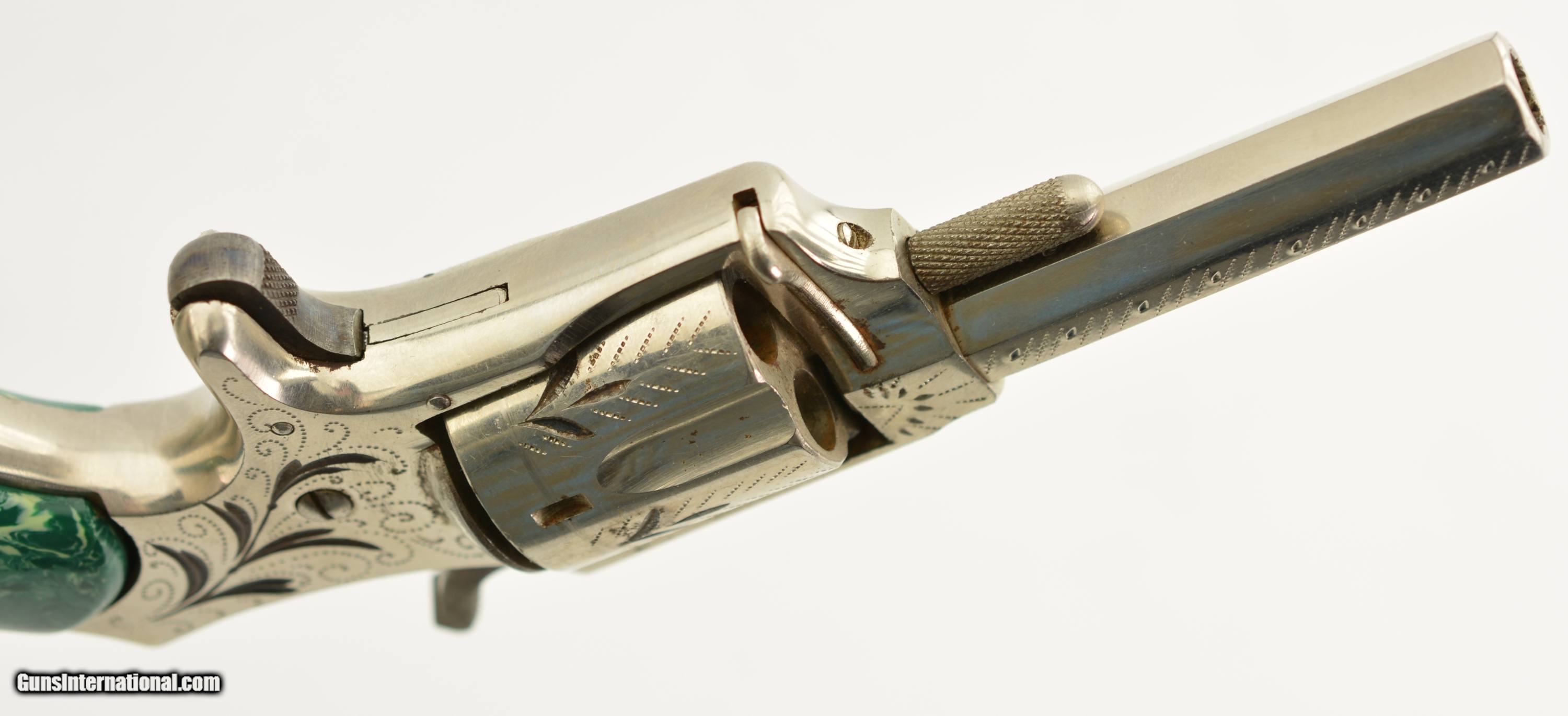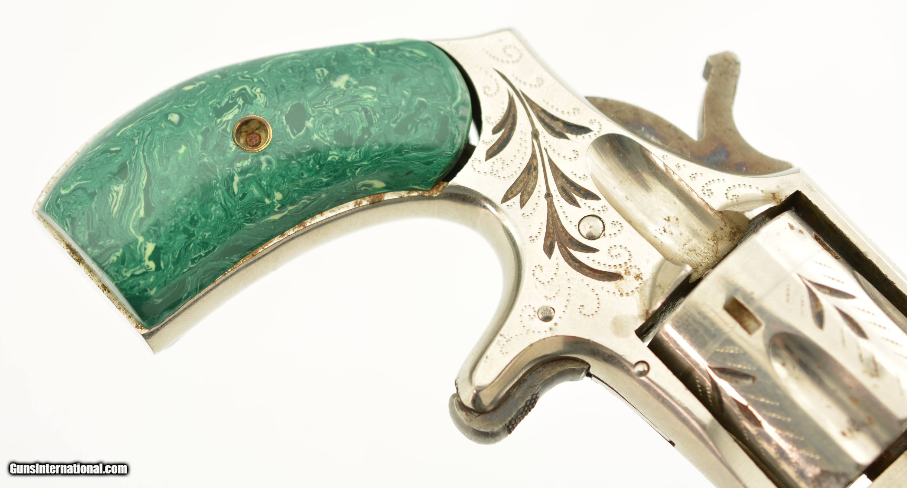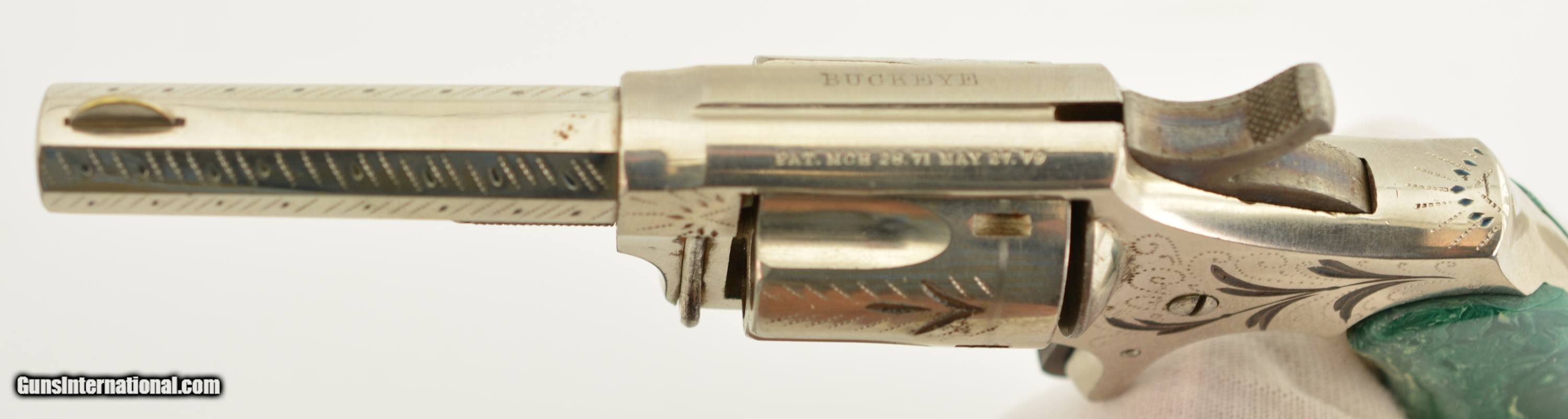Description: Serial #6096, .32 Rim Fire, 2 ¾ inch octagonal barrel with a very fine bore with strong rifling and several areas of roughness. This is the “Buckeye" revolver manufactured by Hopkins and Allen with only the patent dates “PAT. MCH 29, 71 MAY 27, 79" and name on the barrel. Manufactured prior to 1884, the year that caliber was discontinued form this line of revolver, this high grade presentation example features enamel highlighted engraving, case colored hammer and trigger along with fancy green “Malachite" celluloid grips. The gun is in excellent condition retaining about 95-98% of the original bright nickel finish with some tiny spots of flaking mostly on the cylinder. The celluloid grips have shrunk over time leaving a slight consistent gap near the frame with a tight overall fit showing light use and wear marks. Mechanically it functions properly with tight lock up and proper timing. An excellent example of this presentation grade “Buckeye" revolver that would add to any spur trigger collection. Antique SOLD Antique: Yes Manufacturer: H&A Model: Buckeye Caliber Info: .32 RF Gauge Info: .32 RF |