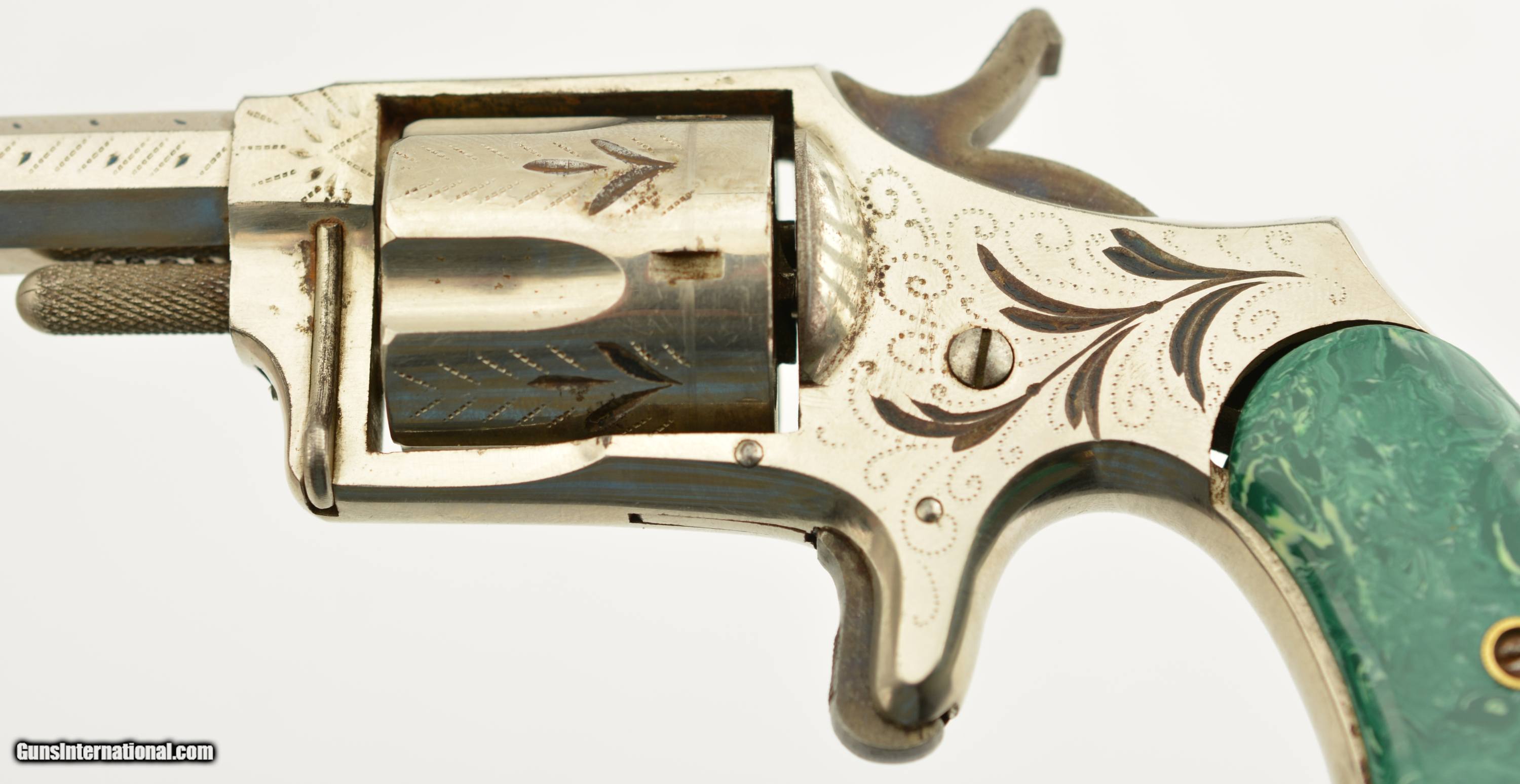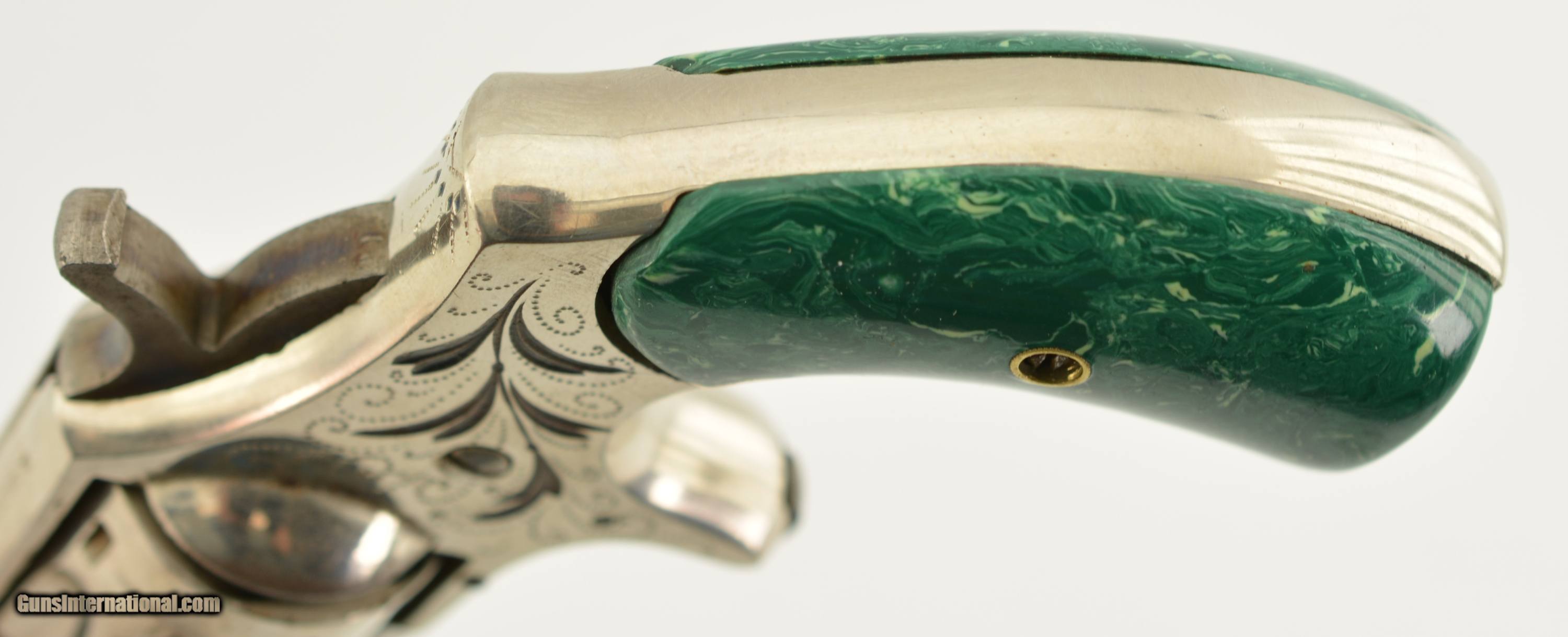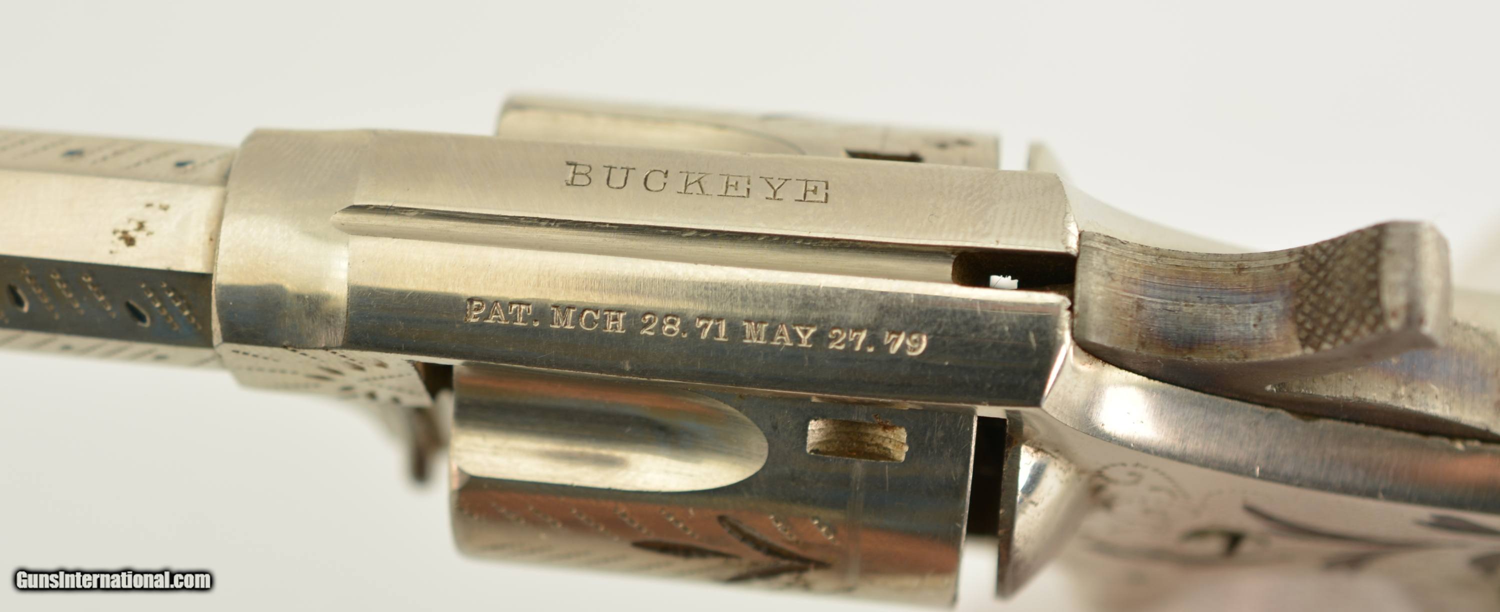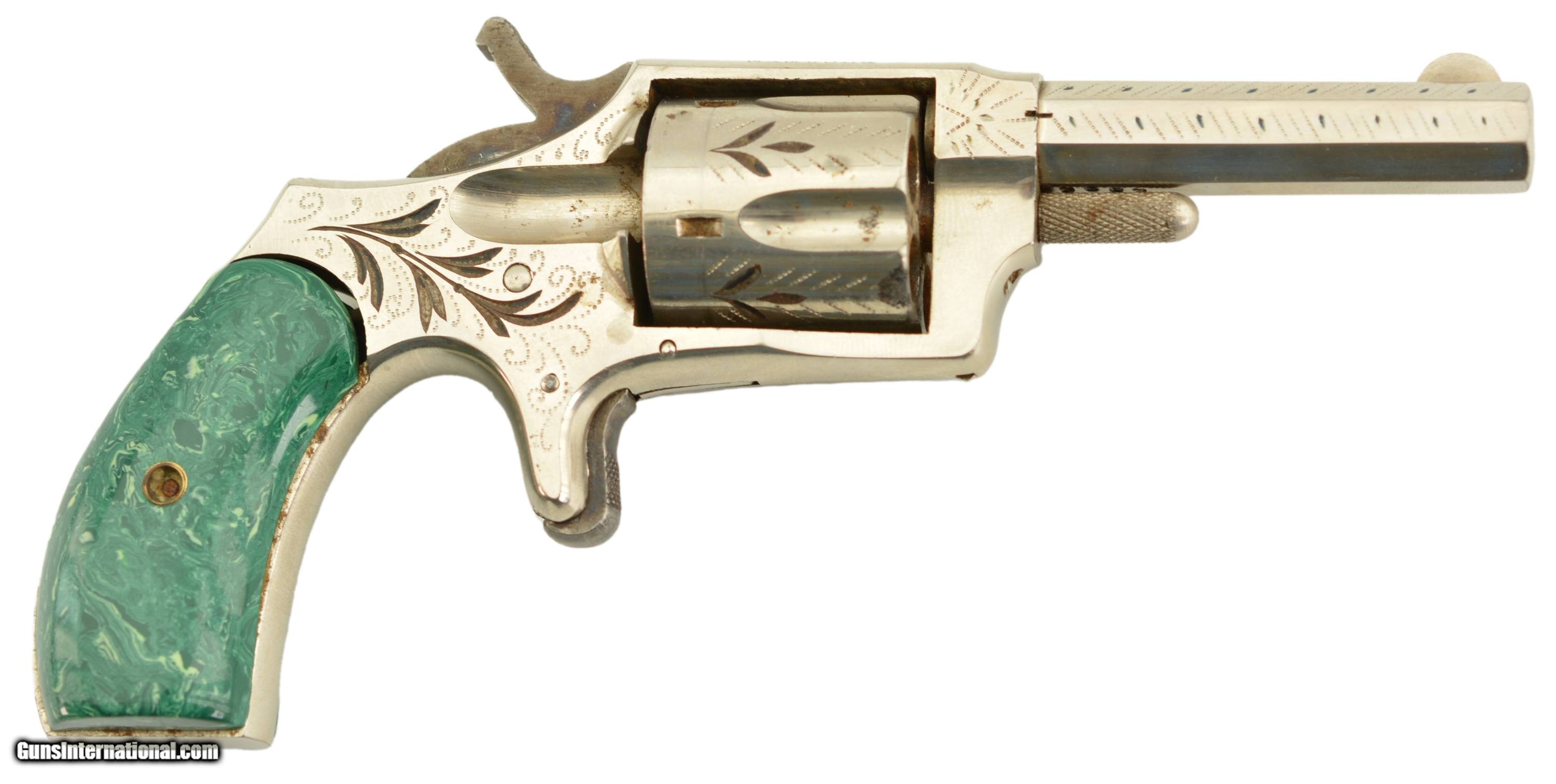 Description: Serial #6096, .32 Rim Fire, 2 ¾ inch octagonal barrel with a very fine bore with strong rifling and several areas of roughness. This is the “Buckeye" revolver manufactured by Hopkins and Allen with only the patent dates “PAT. MCH 29, 71 MAY 27, 79" and name on the barrel. Manufactured prior to 1884, the year that caliber was discontinued form this line of revolver, this high grade presentation example features enamel highlighted engraving, case colored hammer and trigger along with fancy green “Malachite" celluloid grips. The gun is in excellent condition retaining about 95-98% of the original bright nickel finish with some tiny spots of flaking mostly on the cylinder. The celluloid grips have shrunk over time leaving a slight consistent gap near the frame with a tight overall fit showing light use and wear marks. Mechanically it functions properly with tight lock up and proper timing. An excellent example of this presentation grade “Buckeye" revolver that would add to any spur trigger collection. Antique SOLD Antique: Yes Manufacturer: H&A Model: Buckeye Caliber Info: .32 RF Gauge Info: .32 RF |