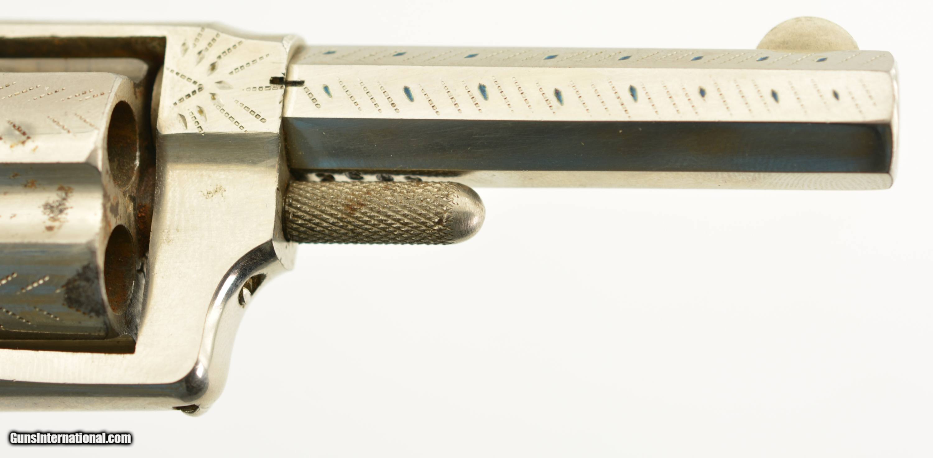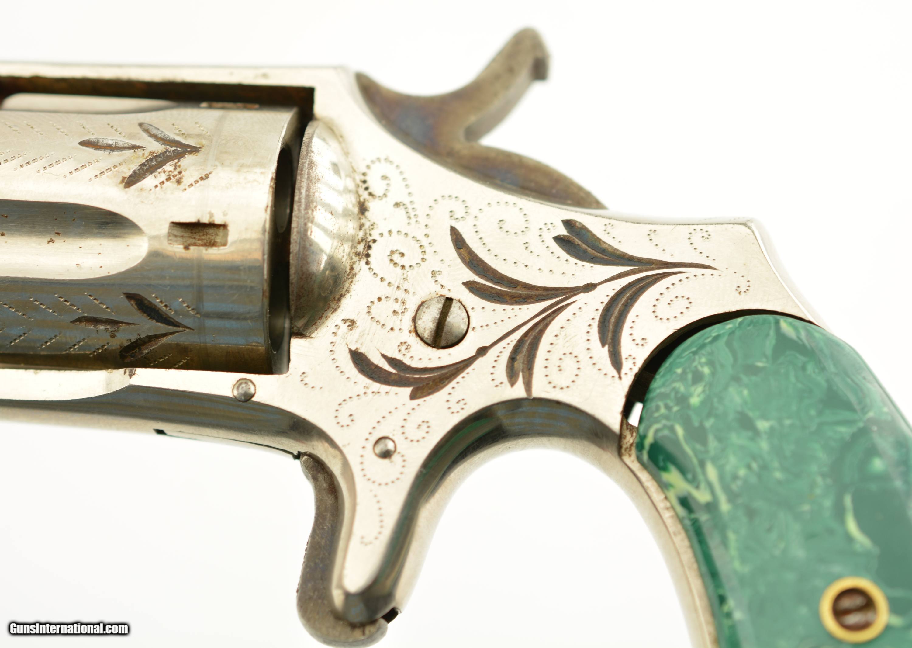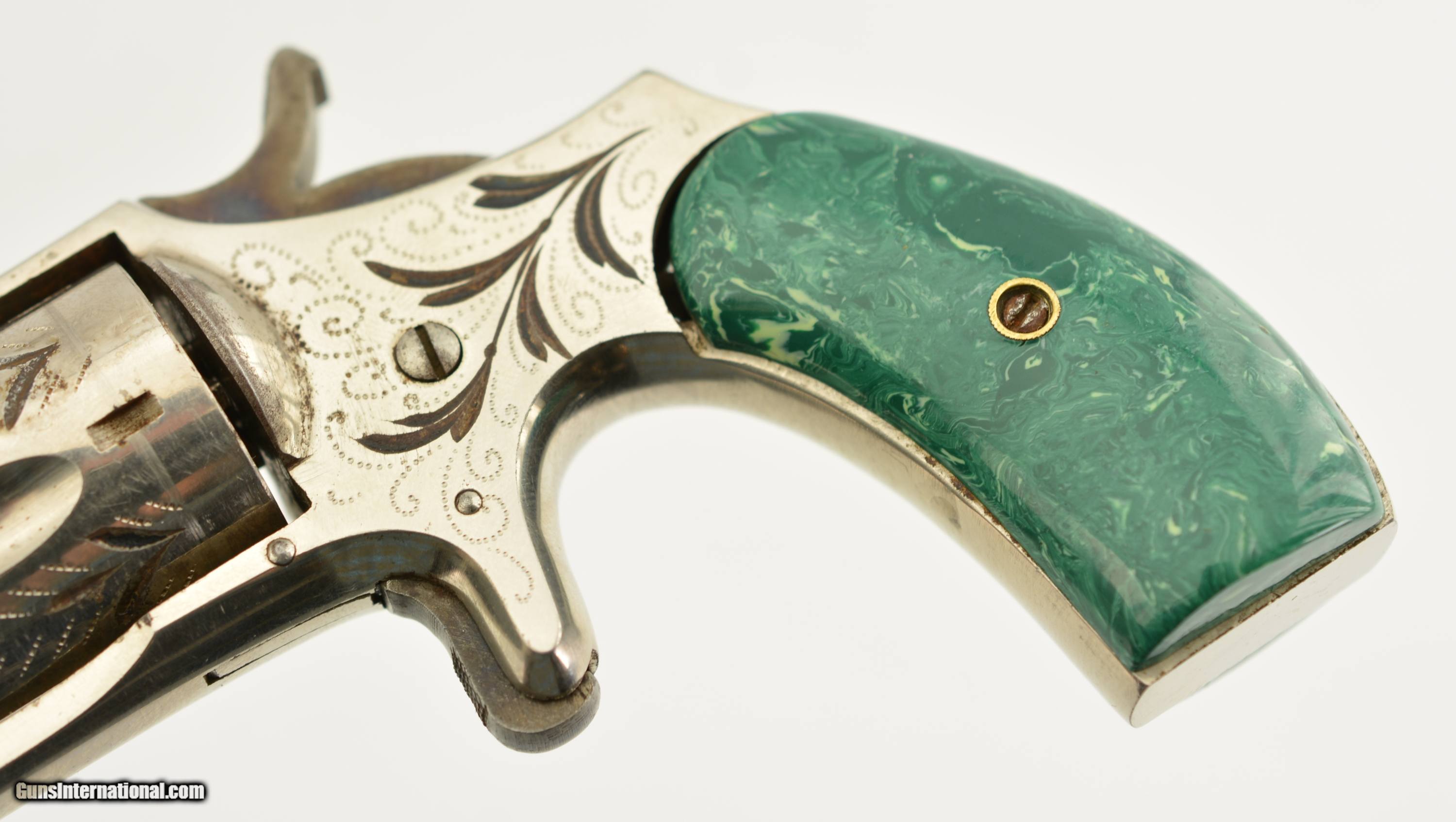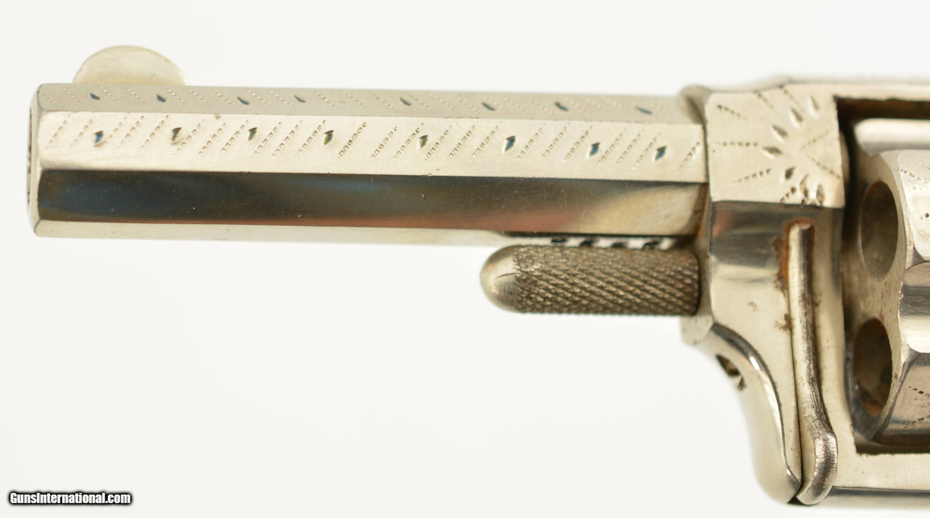 Description: Serial #6096, .32 Rim Fire, 2 ¾ inch octagonal barrel with a very fine bore with strong rifling and several areas of roughness. This is the “Buckeye" revolver manufactured by Hopkins and Allen with only the patent dates “PAT. MCH 29, 71 MAY 27, 79" and name on the barrel. Manufactured prior to 1884, the year that caliber was discontinued form this line of revolver, this high grade presentation example features enamel highlighted engraving, case colored hammer and trigger along with fancy green “Malachite" celluloid grips. The gun is in excellent condition retaining about 95-98% of the original bright nickel finish with some tiny spots of flaking mostly on the cylinder. The celluloid grips have shrunk over time leaving a slight consistent gap near the frame with a tight overall fit showing light use and wear marks. Mechanically it functions properly with tight lock up and proper timing. An excellent example of this presentation grade “Buckeye" revolver that would add to any spur trigger collection. Antique SOLD Antique: Yes Manufacturer: H&A Model: Buckeye Caliber Info: .32 RF Gauge Info: .32 RF |