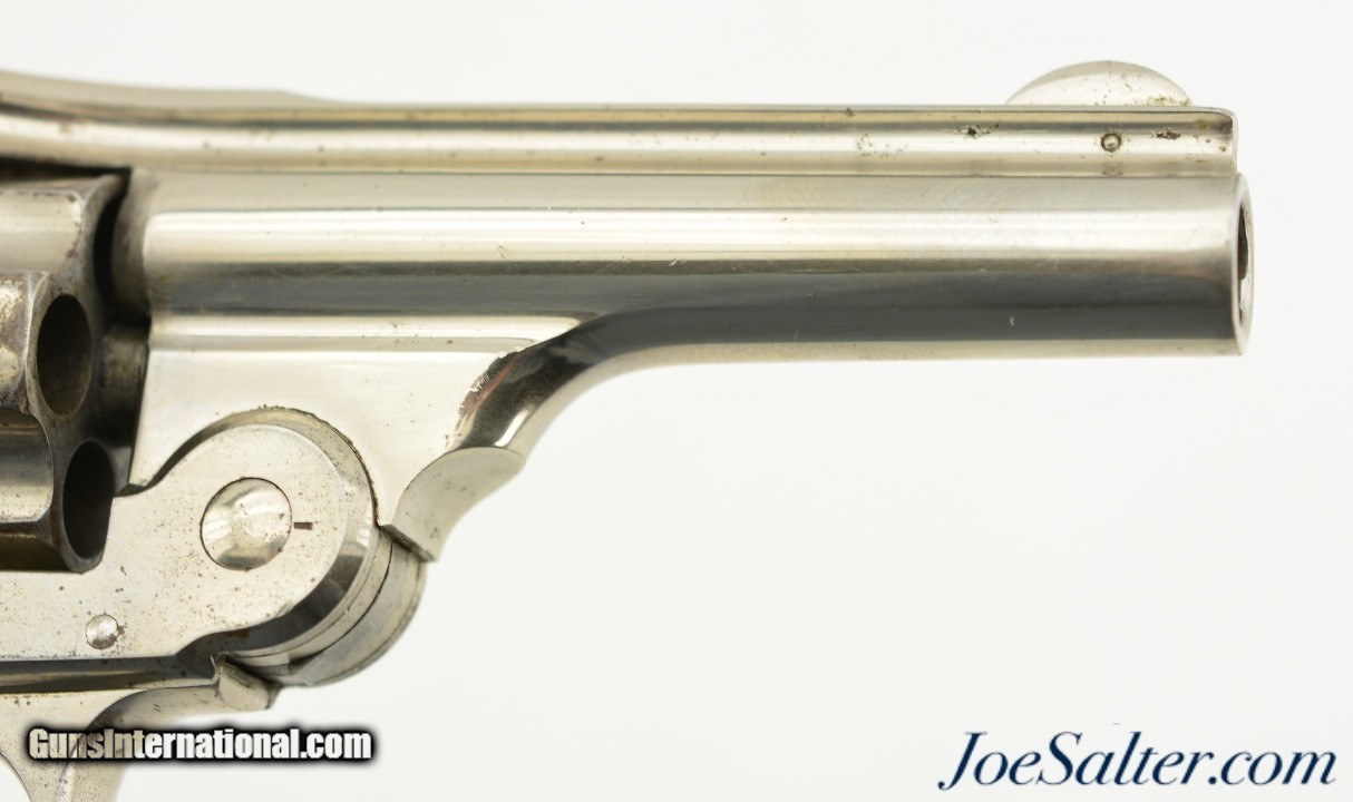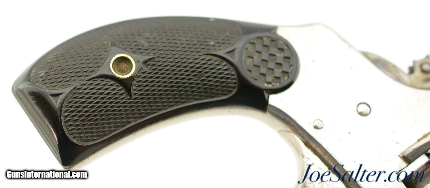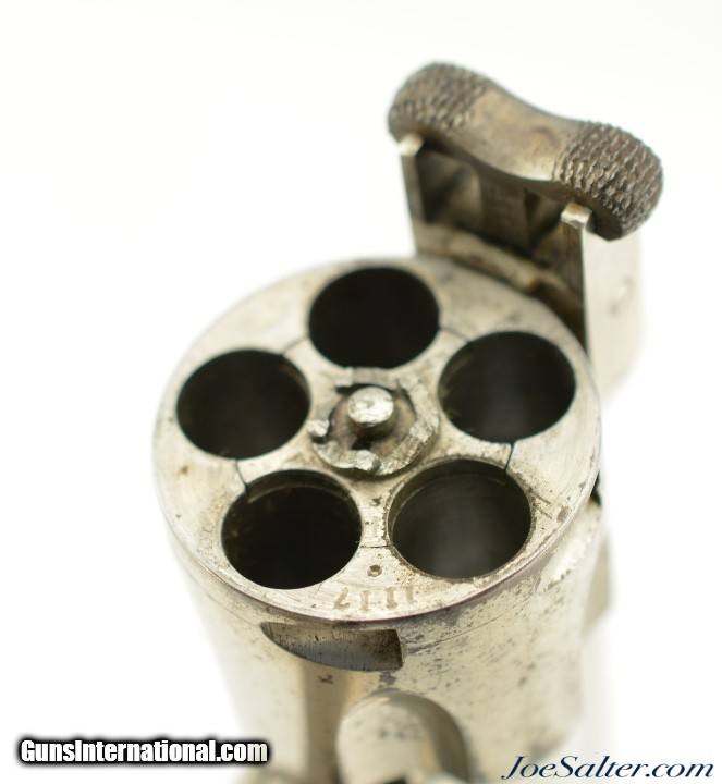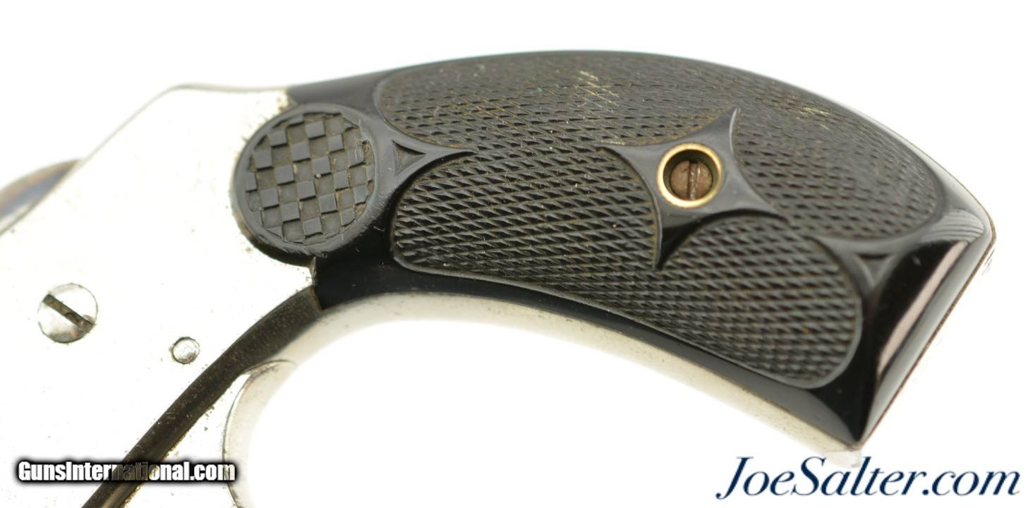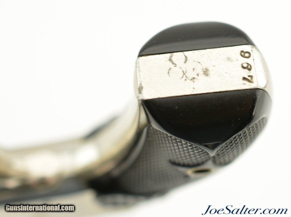 Description: Serial #1117, .32 S&W (black powder low pressure loads), 3 inch round ribbed barrel with a very fine bore with some light pitting near the breech. This is a Hopkins & Allen Manufacturing Company top break revolver manufactured circa late 1880's featuring their patented folding hammer. In excellent condition the barrel and frame and cylinder show about 85-90% of the original bright nickel finish with most of the loss on the cylinder which has areas of plum-brown. The trigger, hammer and latch show much of the original case-colors. The checker pattern hard rubber grips rate excellent and are scratch numbered to the gun which has all matching numbers. A excellent example of an early H&A top break revolver. Antique Antique: Yes Price: $495.00 Contact Seller |