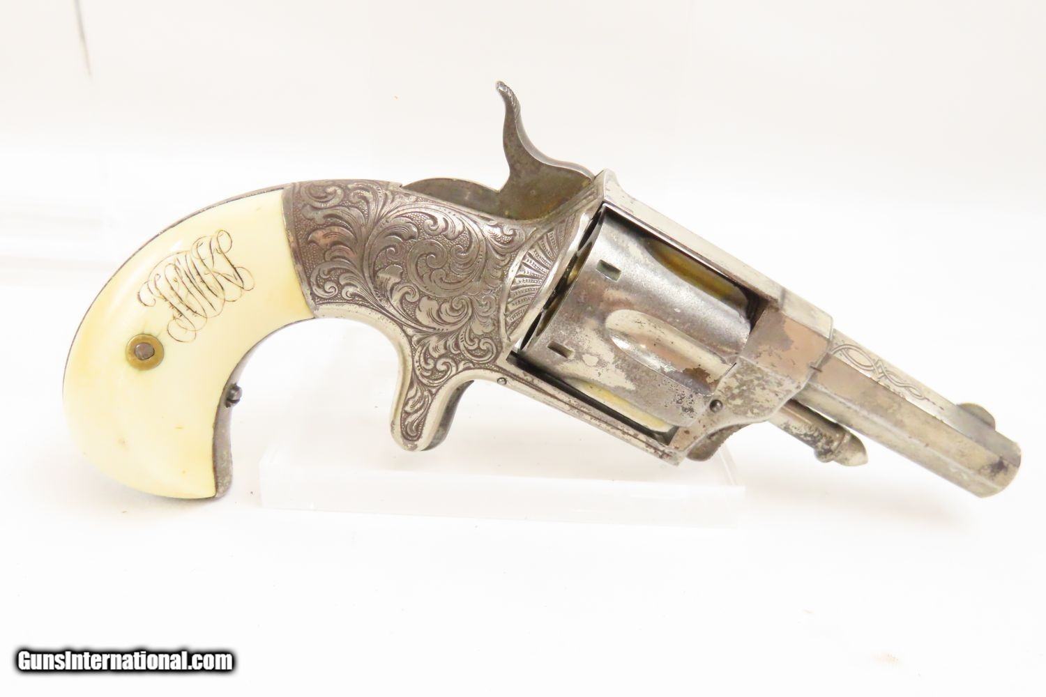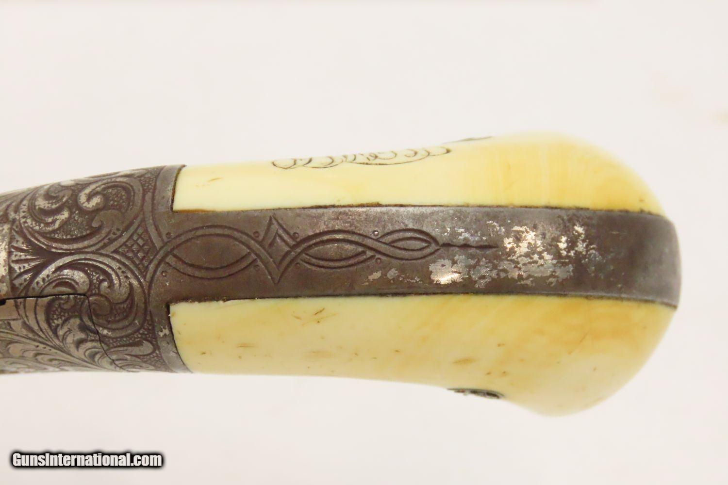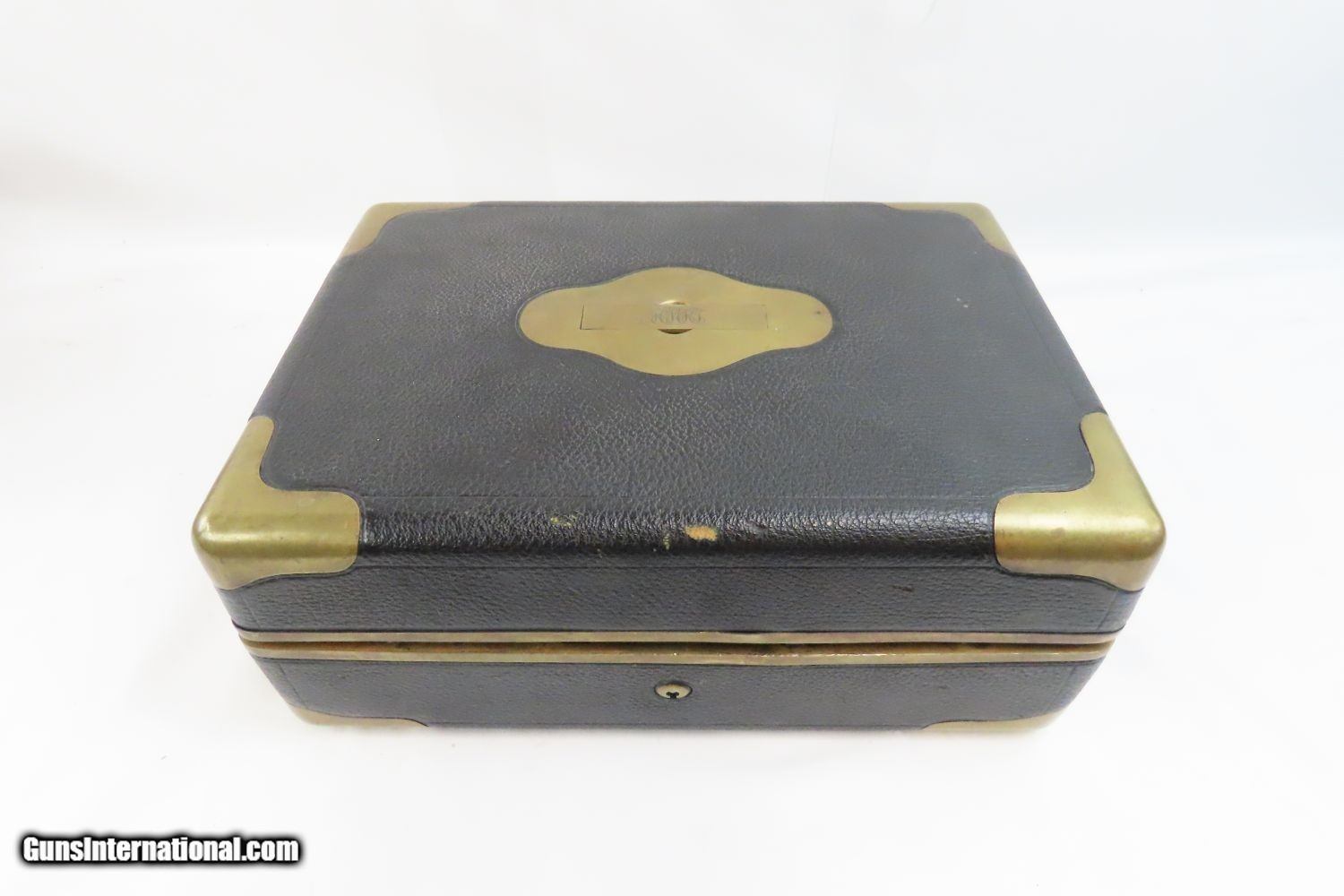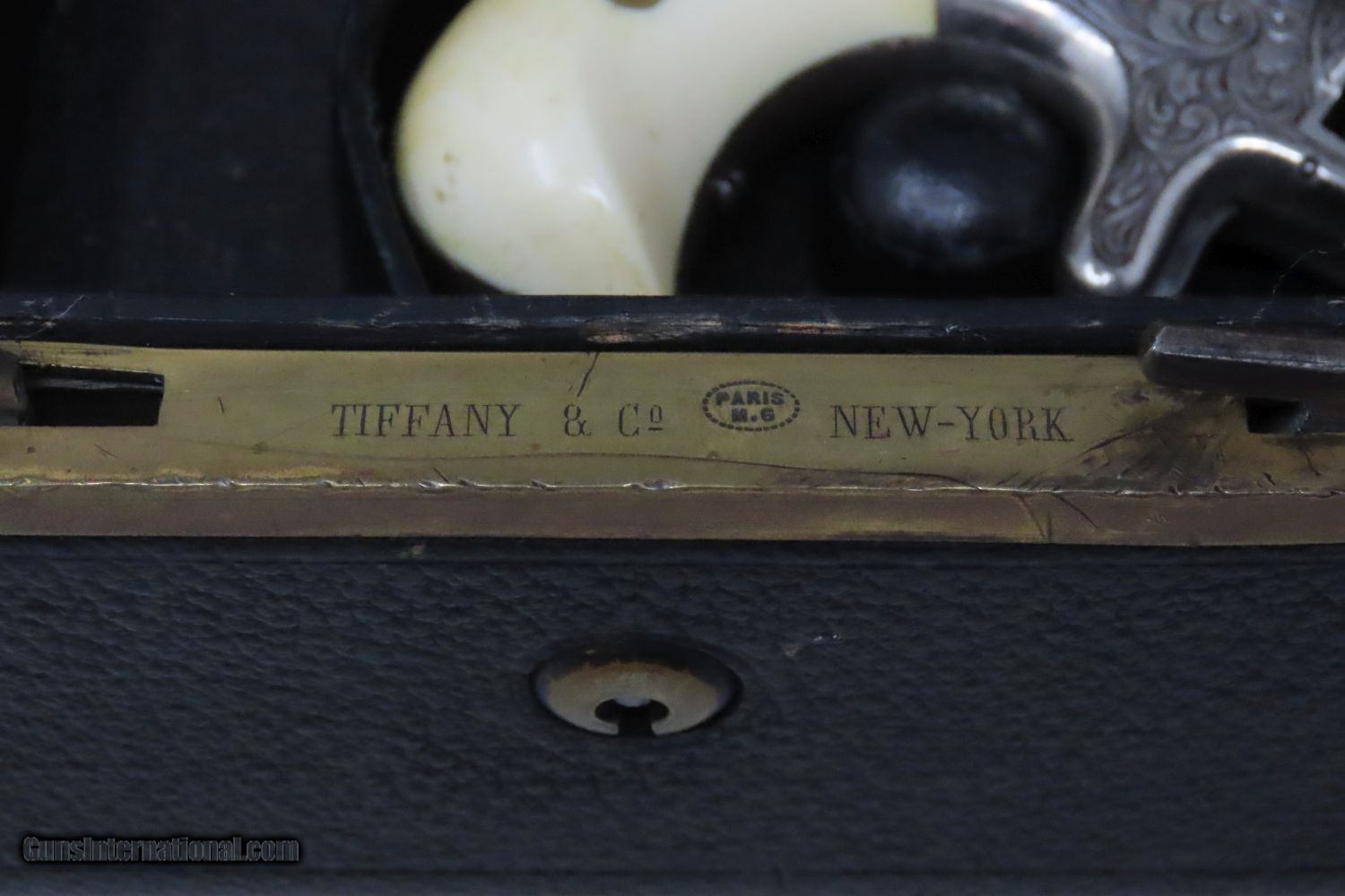 Description: CUSTOM TIFFANY & Co. GENTLEMAN’S SET w Engraved HOPKINS & ALLEN XL Revolver Amazing Personalized Tiffany Traveling Kit! Here we present a Very Rare Tiffany & Co. Customized Gentleman’s Traveling Kit, including an Engraved Hopkins & Allen XL Revolver, made in Norwich, Connecticut circa the 1870s-1880s. This kit is something that an upper-middle class businessman might have purchased or been gifted to carry around his effects while traveling by horse, carriage, railroad or steamer in the late-19th Century. The case is trimmed in black pebble-grain leather with brass hardware. Being made by Tiffany & Co., you know this is high-quality merchandise. The case itself appears to have been made in Paris. The case is marked “TIFFANY & Co. NEW-YORK”. Each piece is monogrammed with the initials “HMKS”: the disappearing handle on the top of the case, the lid to each container, as well as the right grip panel. Each lid is silver plated and there are glass containers for everything from soap to cologne to shaving supplies. Everything is fitted and everything is in its place: even the revolver has a fitted and somewhat hidden compartment under the front flat compartment. This also houses a now empty cartridge box and there is room for another. The set is entirely personalized. This XL Revolver is dressed to the nines with New York style scroll engraving, monogrammed ivory grips and a silver-plate finish with gold-plate accents on the hammer and within the cylinder flutes. Additional items within include a small folding knife as well as a straight razor The overall condition of this set is fine. The action of the revolver is strong and tight. The bore remains in good shape with strong rifling. Nice, original silver finish with a good amount of gold plating. The grips are smooth and solid and in great condition. The Tiffany case and vessels are very fine. The key is absent. The straight razor’s handle has deteriorated and does not appear to have been original to the set as sold by Tiffany. However, it is still sharp. This is an epic set by Tiffany & Co. that is a wonderful heirloom from a time gone by, when one traveled by literal horsepower and steam. This is a legitimate antique and not a reproduction. Barrel is 2-1/2 inches. Caliber: .32 Rimfire Overall condition as seen in photos. Very Fast. Very Safe. FREE SHIPPING WORLDWIDE. Delivered directly to your door by express mail! Guaranteed AUTHENTIC & Includes CERTIFICATE OF AUTHENTICITY. ancestryguns $4850 #20060 SOLD Antique: Yes |