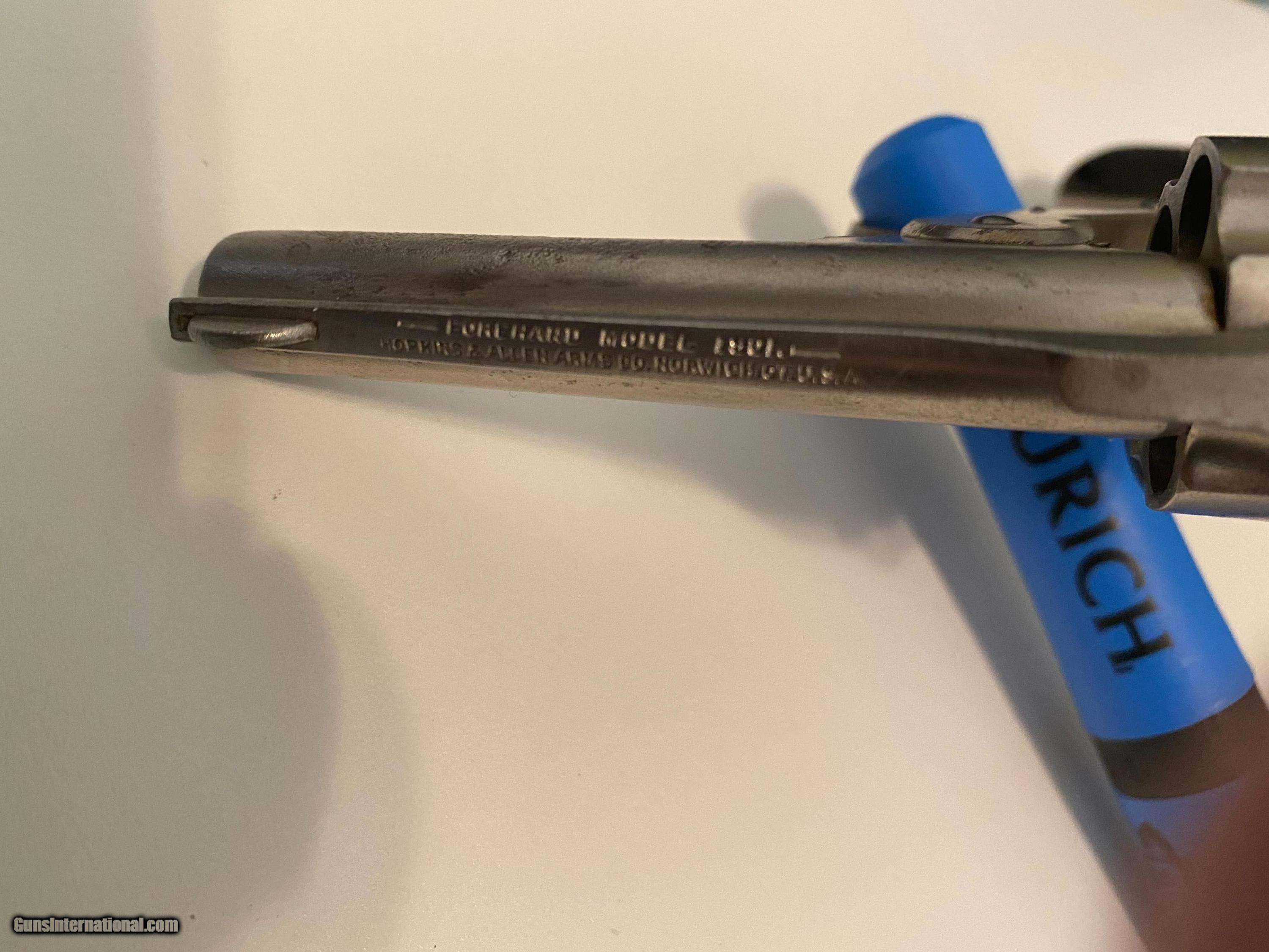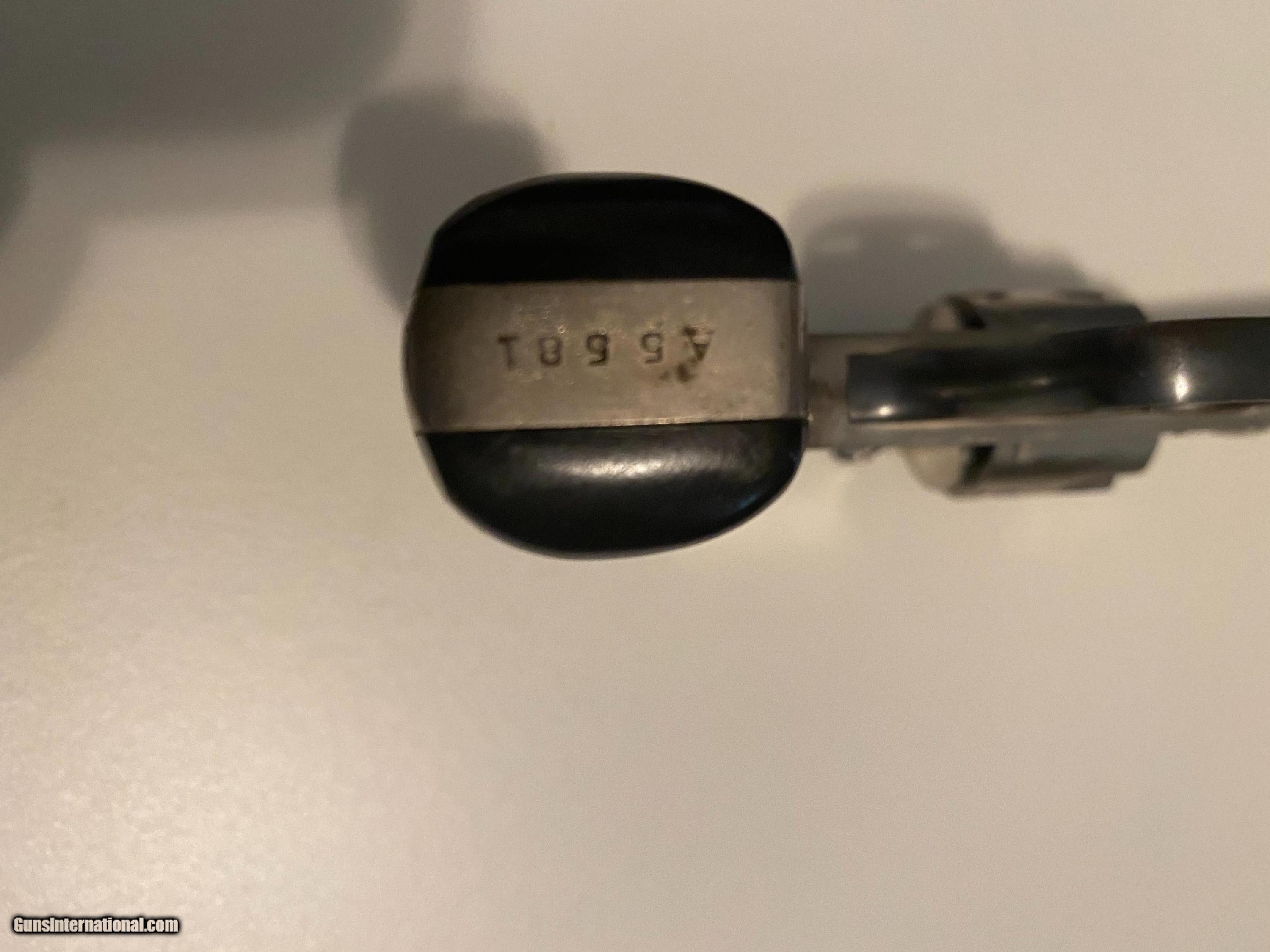 Description: Description: This is a Hopkins & Allen Forehand Model 1801, Serial number A 5581 five-shot revolver top break, double action in .32 S&W caliber and in very good condition. The nickel plating is in 80-95% some pitting on the barrel, The action is strong and the cylinder revolves and locks up properly. The rifled bore is clean and bright. The black hard rubber grips are in very good condition. Offered as a collectible- don't shoot modern ammunition unless your gunsmith says it is safe to do so. Spent shells eject automatically when the action is opened. Manufacturer: Hopkins & AllenArms Co, Norwick, CT USA Model: Forehand Model 1801 Top Break Revolver Serial Number: A5581 Caliber Info: .32 S&W (88grain Lead bullet, centerfire, smokeless powder) Chambers: 5 Bore Info: Rifled, Very Good Metal Condition: Very Good Grips: Hard Rubber- Very good condition Finish: Nickel Manufacture Date: 1901-1915 Item Location: Cape Coral, FL 33990 SOLD Curio/Relic: Yes |