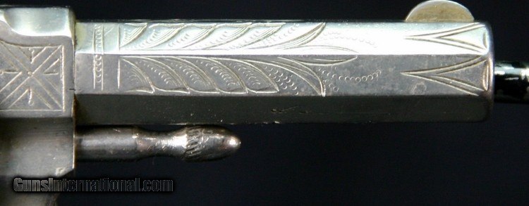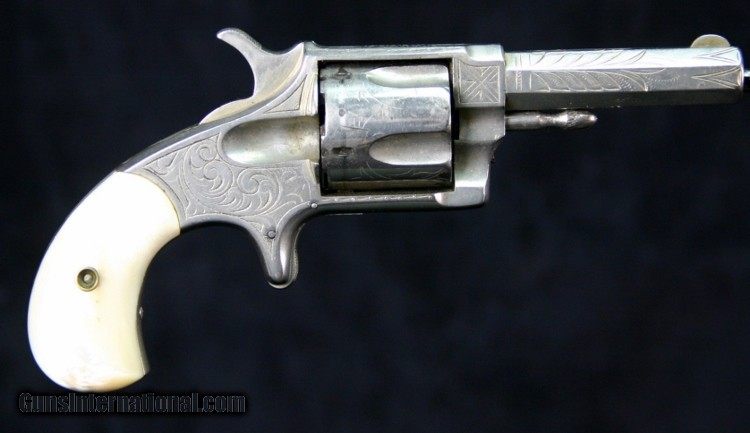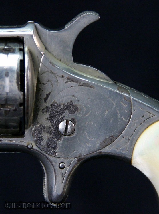Description: 38rf, 3 inch barrel, nickel finish, 2 piece pearl grips, leaf and scroll engraving, cover plate on left side has been buffed so engraving is "thin", circa 1870's. Condition: strong rifling, 90% nickel over all, some flaking on cylinder, excellent grips, factory marking excellent, mechanically excellent. SOLD Antique: Yes |