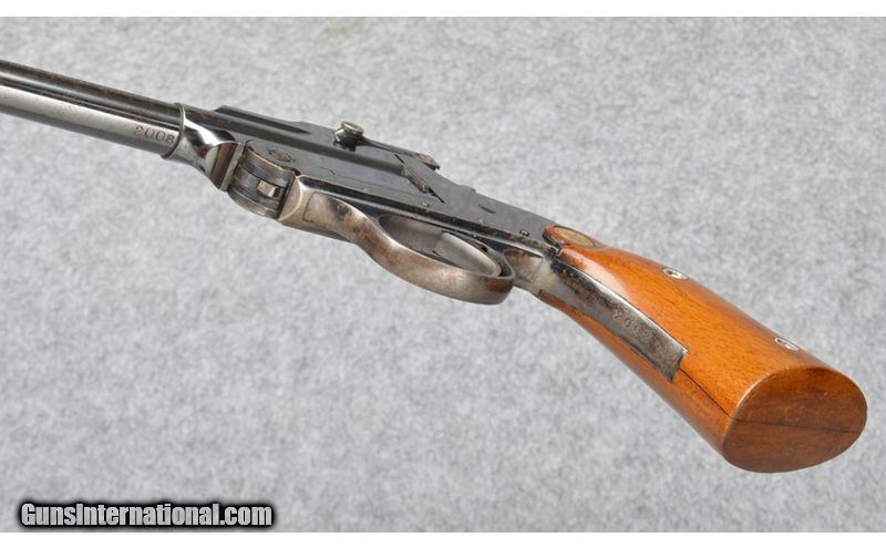 Description: Shorter barrel version of H&A s Tip-up single shot pistol. Solid pistol shows scattered spotting and areas turning patina. .22 Long Rifle SOLD Metal Condition: Polished Blue Wood Condition: Smooth Wood with factory medallion Bore Condition: "Sharp rifling, some roughness Barrels: 6 Inch Triggers: Single action Weight: 1 lb. 4 Oz. Sights: Missing rear sight blade Item Location: Buda, TX |