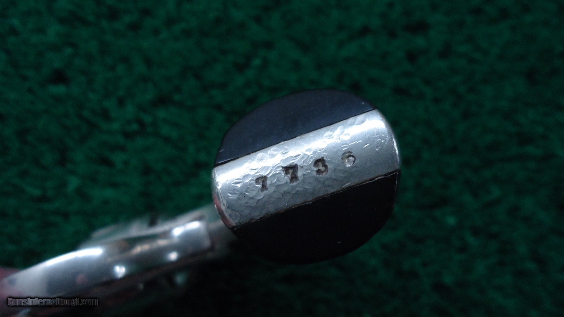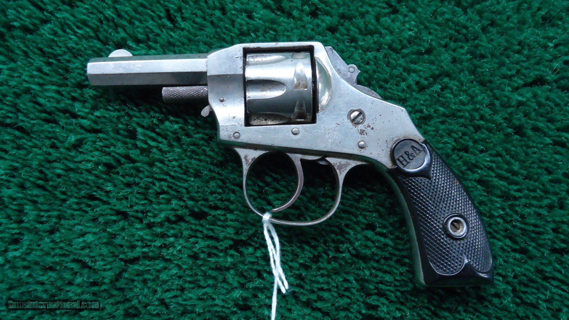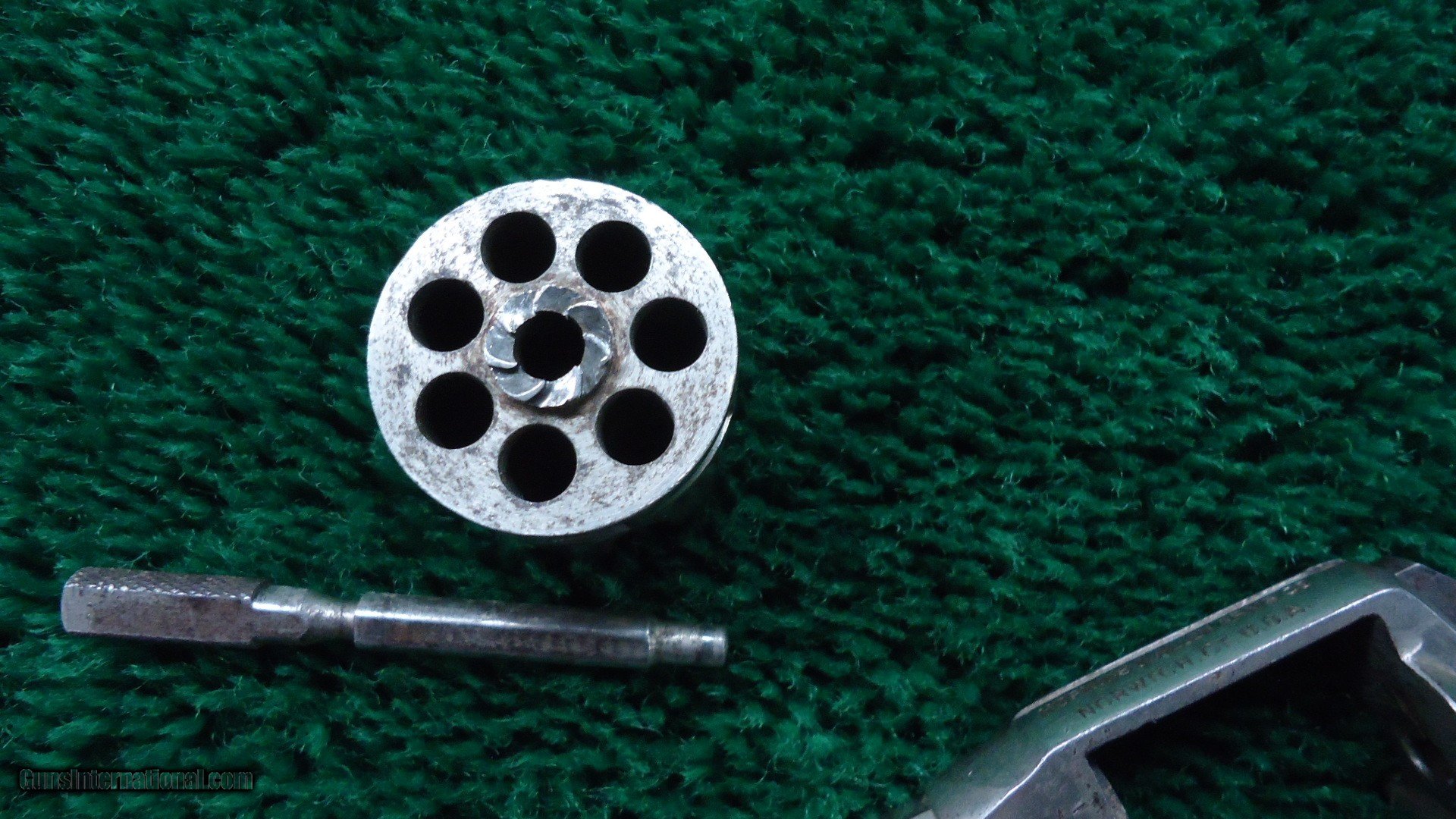 Description: 2-1/2 inch octagon barrel, 7 Shot fluted cylinder and solid frame with about 70% nickel finish remaining showing freckles and wear. Partially bright bore with scattered light pitting and decent rifling throughout. H&A marked checkered hard rubber grips. Works in single and double action but difficult to cock because folding hammer spur is missing. Leroy Merz Antique Firearms specializes in antique and vintage Winchesters and other fine American firearms. Since 1965 Mr. Merz has taken part in the world of firearms and has been a contributor to many well known reference books. We have hundreds of additional guns in every price range at our home online. Search for Merz Antiques in google. SOLD Curio/Relic: Yes |