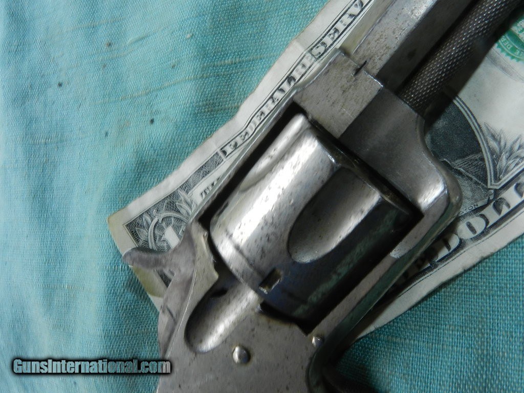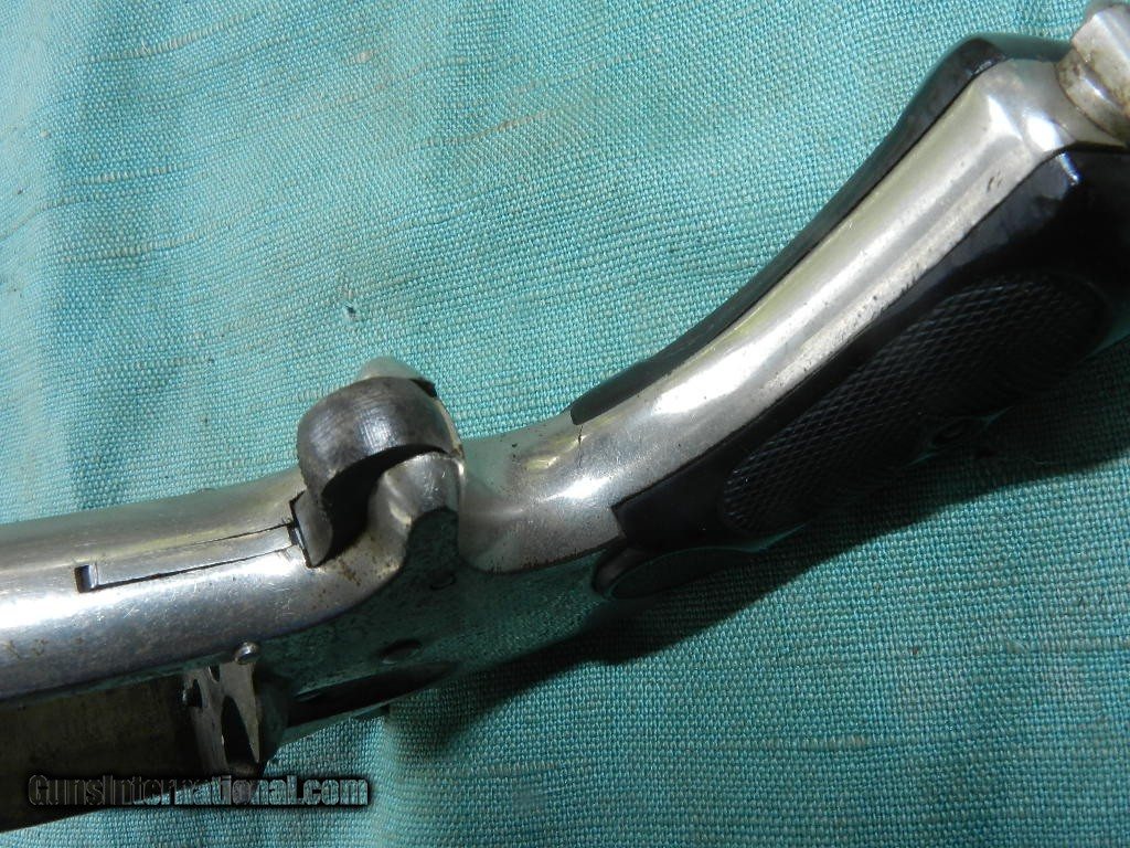 Description: SOLD A wonderfull SA Hopkins and Allen revolver with a serial #6298, 38 S&W, 5” long octagon barrel with a mostly bright very good bore showing some scattered mild oxidation and strong rifling throughout. The metal surfaces retain about 80% original nickel finish showing fine flaking to gray and oxidation staining mostly along the right side and cylinder. There are some scratches along the frame and dings around the pins on the left side. The hammer shows faded remnants of case-hardened colors and there is a small void through the frame on the right side loading lever cutout. The black checkered hard rubber grips remain in very fine condition showing some scattered light handling marks. The revolver is equipped with a factory lanyard ring and the action hammer will pull back and lock, with the cylinder advances, and sometimes over-times, as the cylinder stop is low. Overall a scarce gun. When buying a gun always have it examined by a competent gunsmith before shooting. To buy a gun from me you must get a direct email for me, with details, and shipping cost. We don’t have a web site .I prefer money orders or a check. Item ships when funds come in. I try to keep guns affordable, which means I make less money than most dealers. You won’t get altitude sickness, or nose bleed, with my prices! I consistently have the best selection of older guns If you attempt to buy, you must still contact us for details . Best to email to buy. Sometimes a local person can stop buy and purchase before the gun is removed. Sometimes not home to get calls. Some guns are required shipment to a gun dealer near you for a transfer to you when it arrives. Otherwise many older or black powder guns ship to your door. With the widest selection of older guns at great prices, We don’t have a store, and sell on the internet only. I’m easy to get along with. Thank You SOLD Antique: Yes |