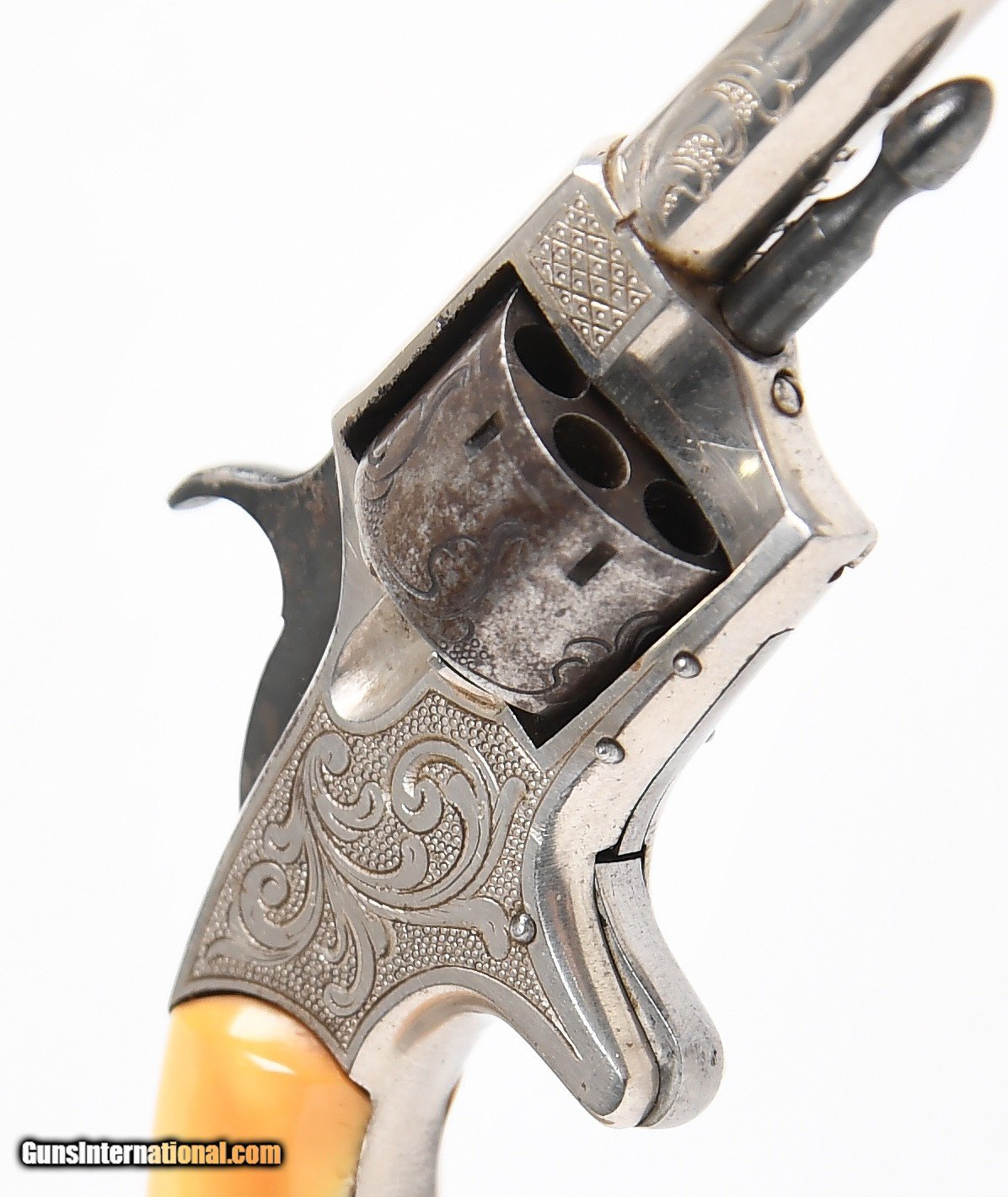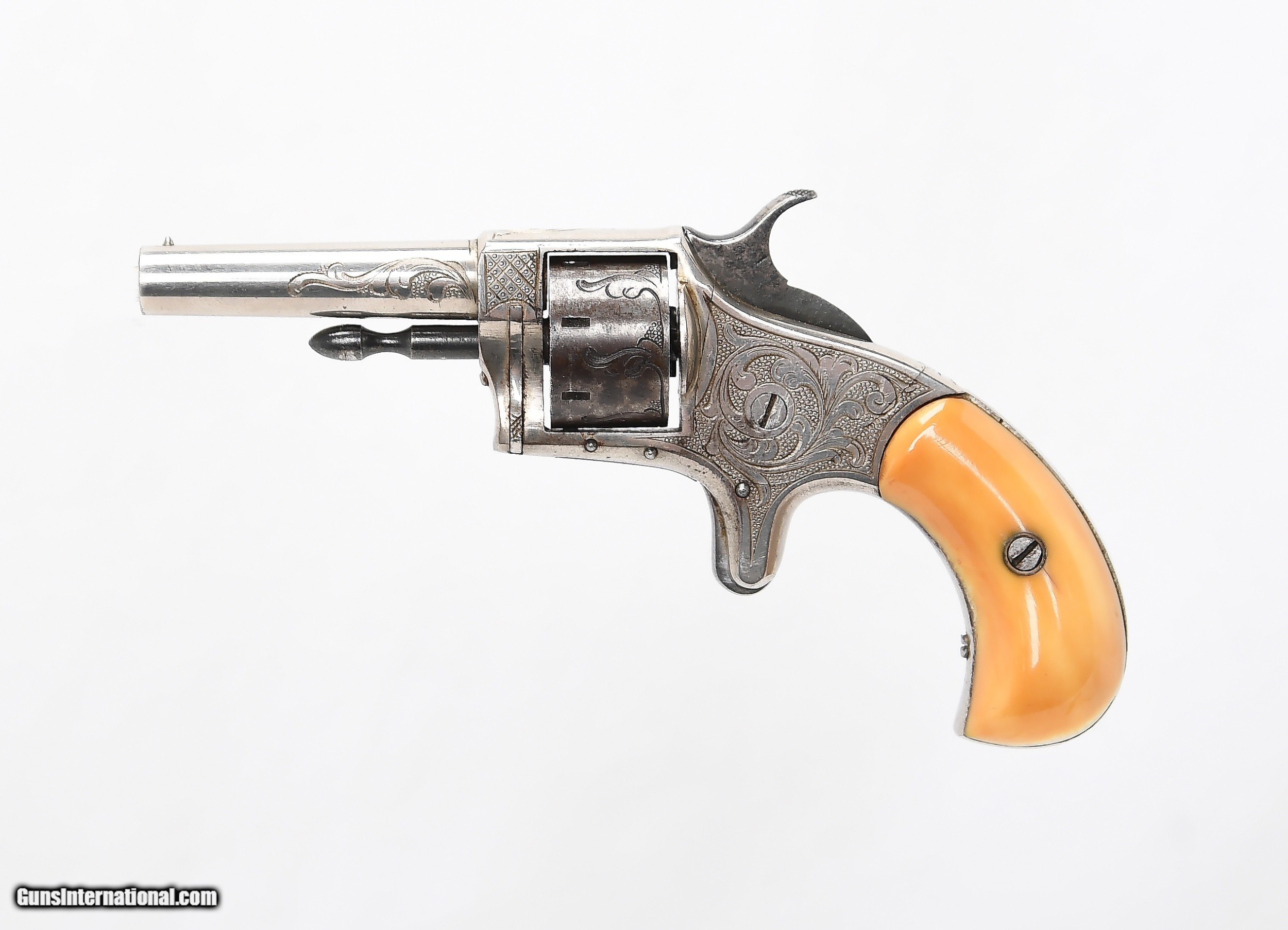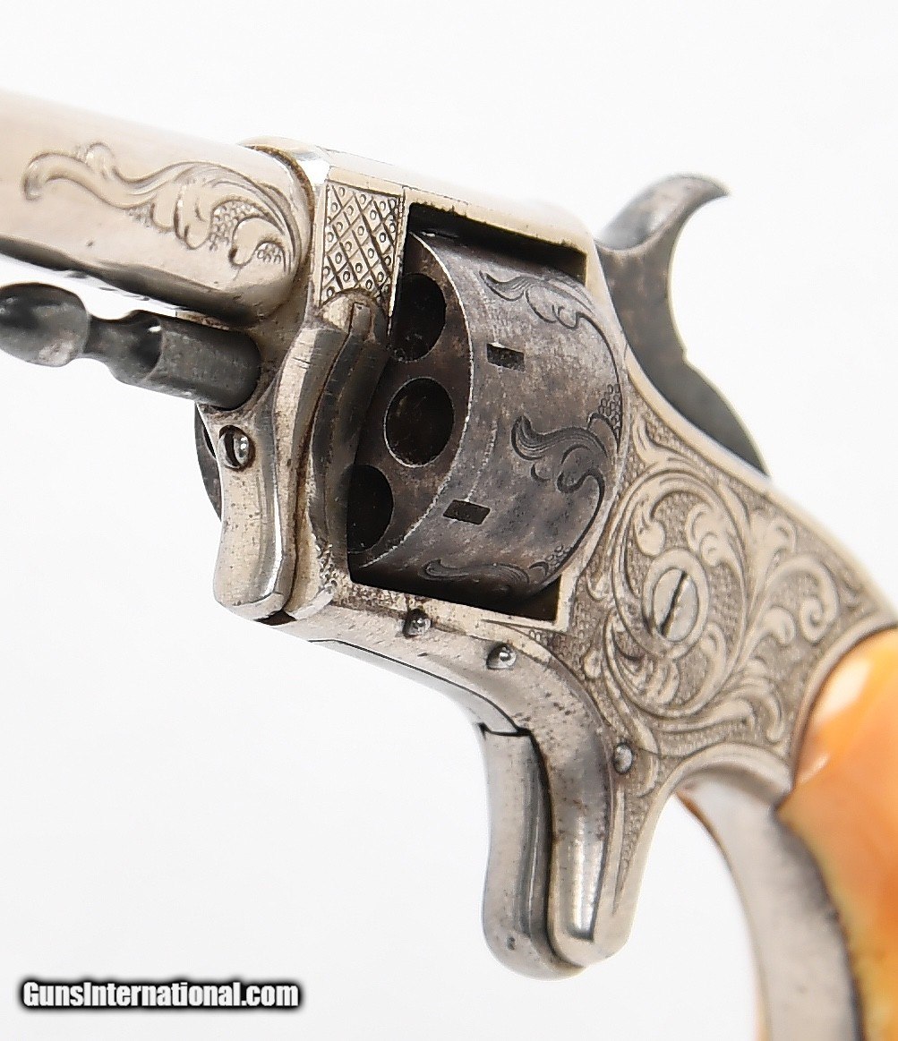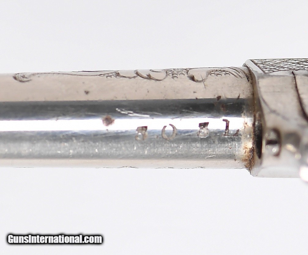 Description: Hopkins & Allen, Blue Jack 1871 patented .22 revolver. #1 frame, spur trigger and fine original nickel and blue finishes, factory engraving and ivory birds head grips are features of this tiny revolver. 2 ¼” barrel and 5 ½” overall length. All matching numbers gun; frame, barrel, cylinder and cylinder pin. Excellent mechanics, good bore and a scarce antique revolver. Condition: Antique Fine to Very Fine SN: 303 SOLD Antique: Yes |
