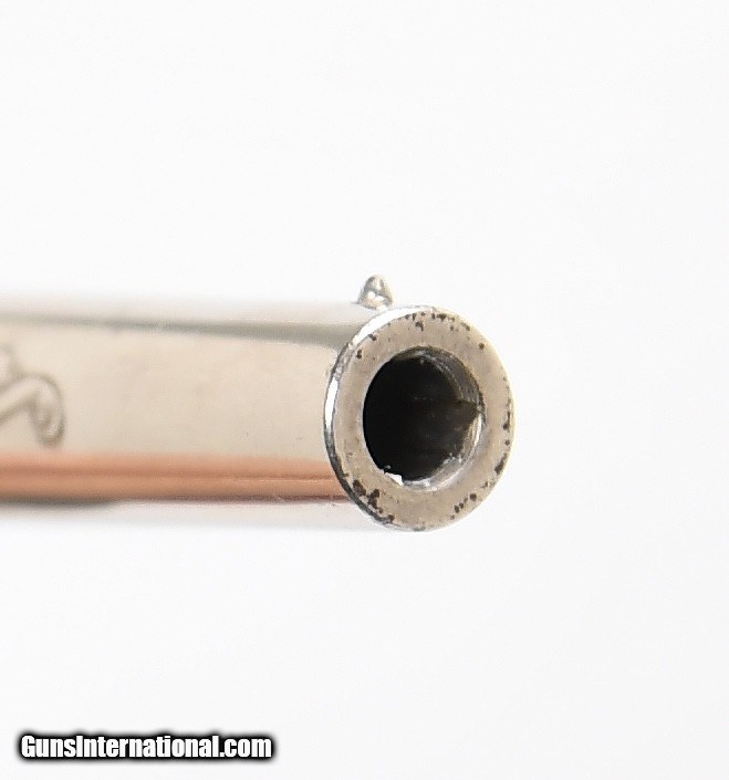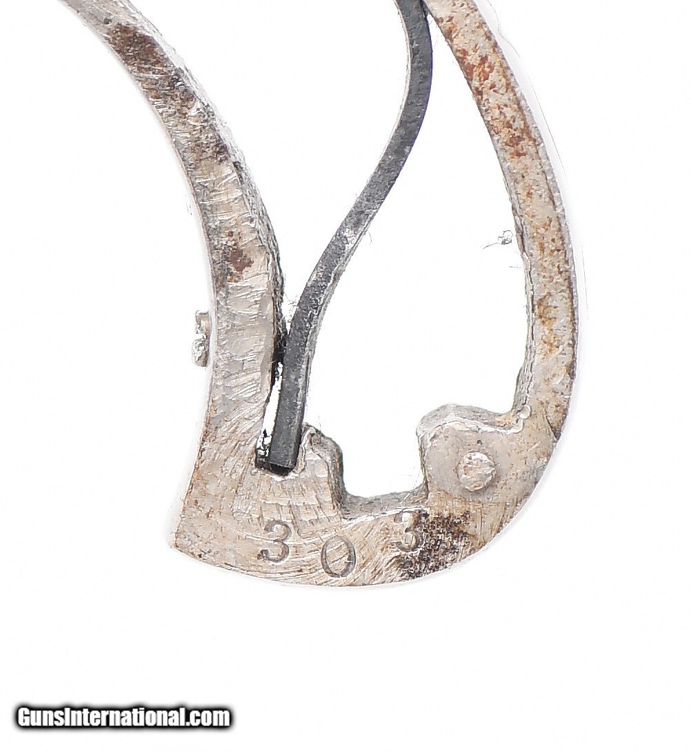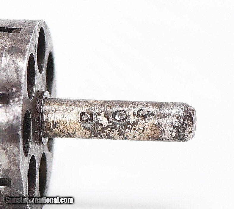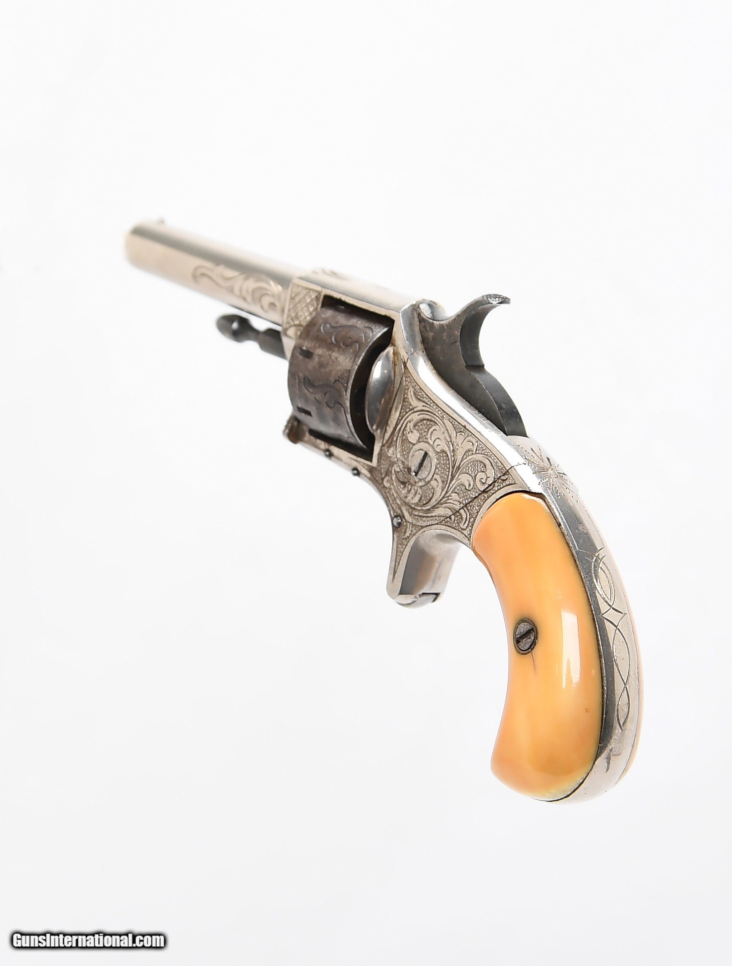 Description: Hopkins & Allen, Blue Jack 1871 patented .22 revolver. #1 frame, spur trigger and fine original nickel and blue finishes, factory engraving and ivory birds head grips are features of this tiny revolver. 2 ¼” barrel and 5 ½” overall length. All matching numbers gun; frame, barrel, cylinder and cylinder pin. Excellent mechanics, good bore and a scarce antique revolver. Condition: Antique Fine to Very Fine SN: 303 SOLD Antique: Yes |