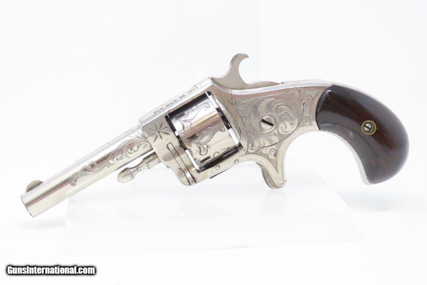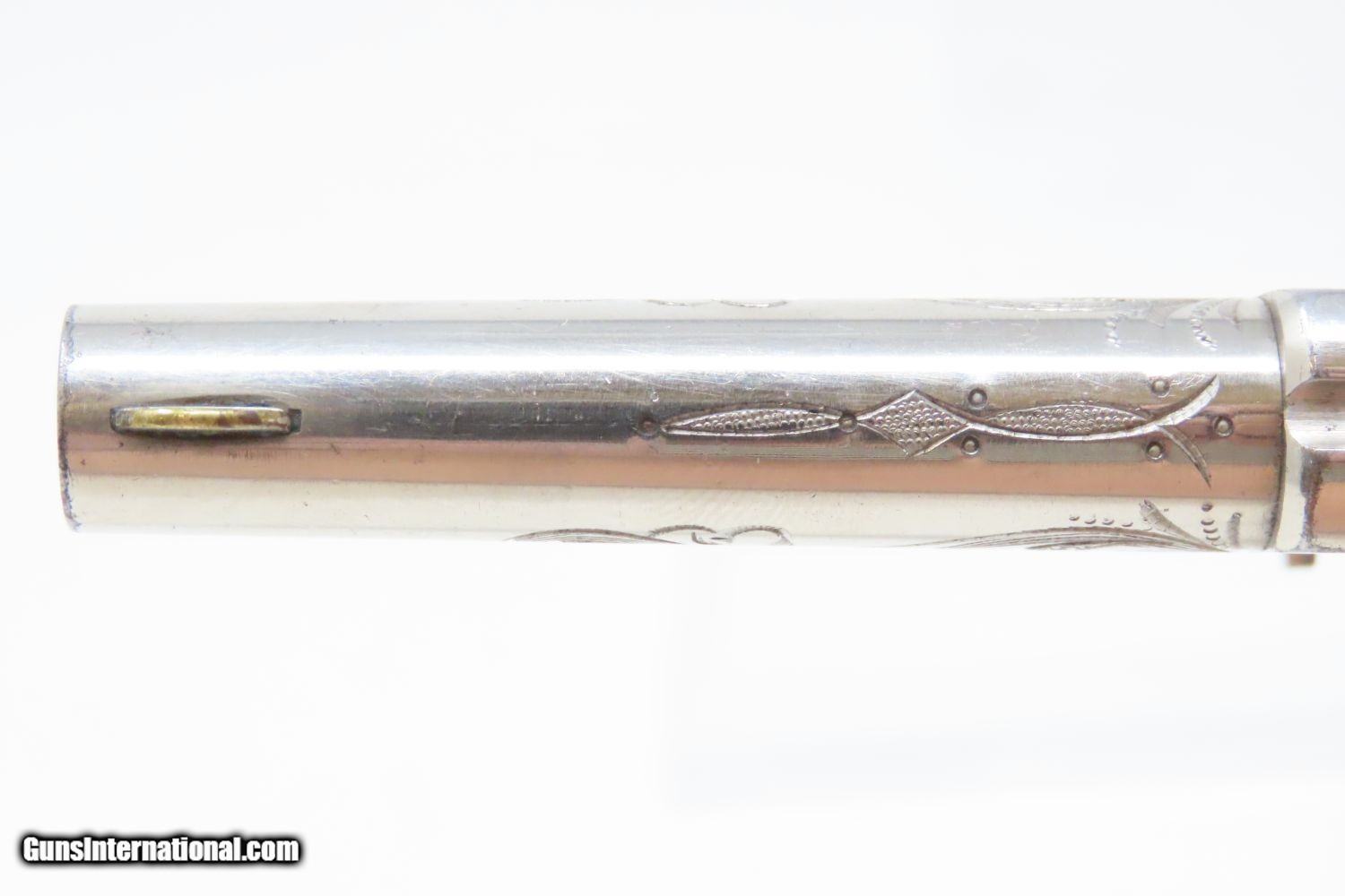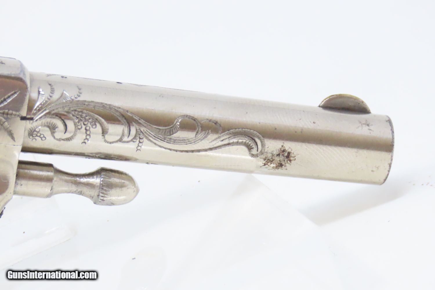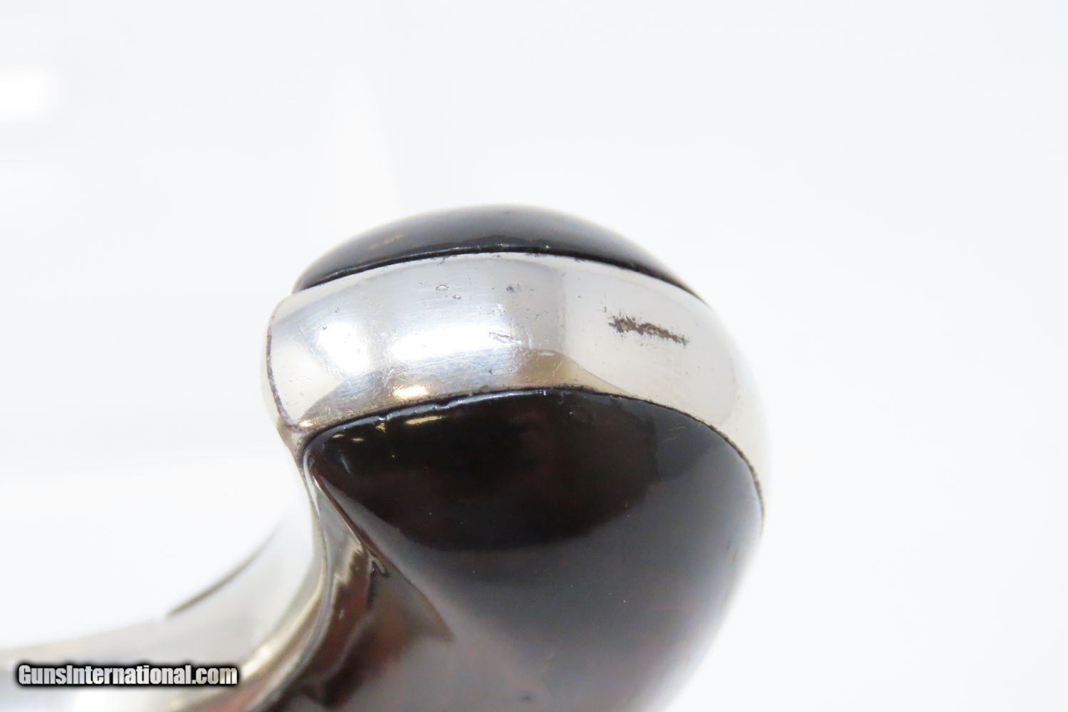 Description: SWEET LITTLE 7-Shot .22 Hopkins & Allen BLUE JACKET Single Action Revolver c1880s ENGRAVED, NICKEL, ROSEWOOD Here we present an antique Hopkins & Allen “BLUE JACKET No. 2” Spur Trigger Revolver in .22 Rimfire (short), made circa the 1870s-80s. These pocket-sized revolvers and many like them were made by various companies such that the price easily undercut better known and established companies like Colt. As a result, many of Colt’s similar lines were shut down for their inability to compete. During a time when many, if not most people carried a firearm, these affordable little revolvers were small enough to conceal and carry, yet provide some level of protection or peace of mind, even when the town did not allow firearms within its limits. Hopkins & Allen used two different patent dates on this model, Mar. 28, 1871 and May 27, 1879. This revolver has the later Patent date, making it manufactured between the early to mid-1880s. The overall condition is excellent. Strong and tight action. Reflective bore. Firm, smooth rosewood grips. Sharp engravings. Numbers match. A little gem of a hideout gun from the late-1800s! Own the original! This is a legitimate antique and not a reproduction. Barrel is 2-1/2 inches. Caliber: .22 Rimfire (short) Overall condition as seen in photos. Very Fast. Very Safe. FREE SHIPPING WORLDWIDE. Delivered directly to your door by express mail! Guaranteed AUTHENTIC & Includes CERTIFICATE OF AUTHENTICITY. ancestryguns $1145 #210873 SOLD Antique: Yes |