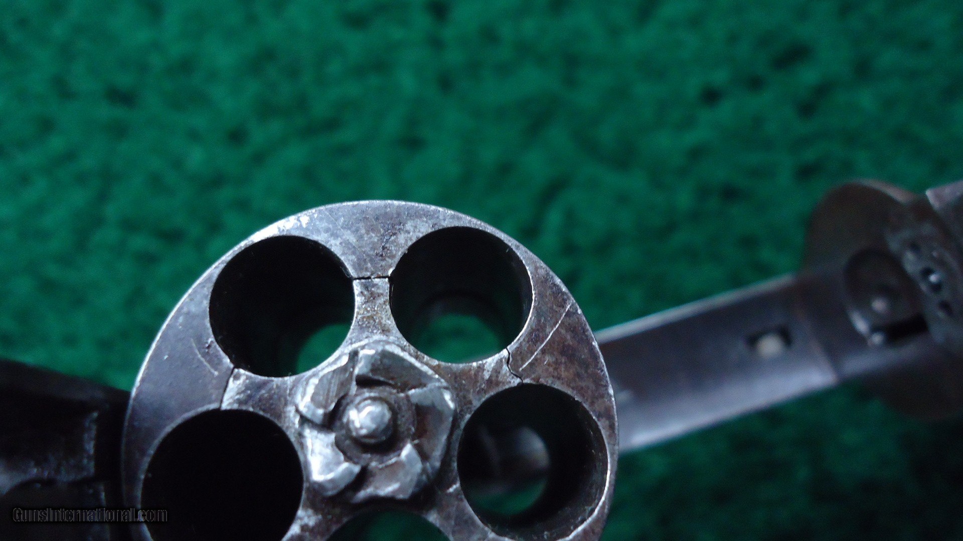 Description: 4 inch barrel, 5 Shot fluted cylinder. Finish on metal surfaces is thinning to a gray patina with traces of darker finish in protected areas. Bore is fairly bright with scattered light pitting and decent rifling. Action seems to work. Hard rubber checkered owl head grips. Leroy Merz Antique Firearms specializes in antique and vintage Winchesters and other fine American firearms. Since 1965 Mr. Merz has taken part in the world of firearms and has been a contributor to many well known reference books. We have hundreds of additional guns in every price range at our home online. Search for Merz Antiques in google. SOLD Curio/Relic: Yes |