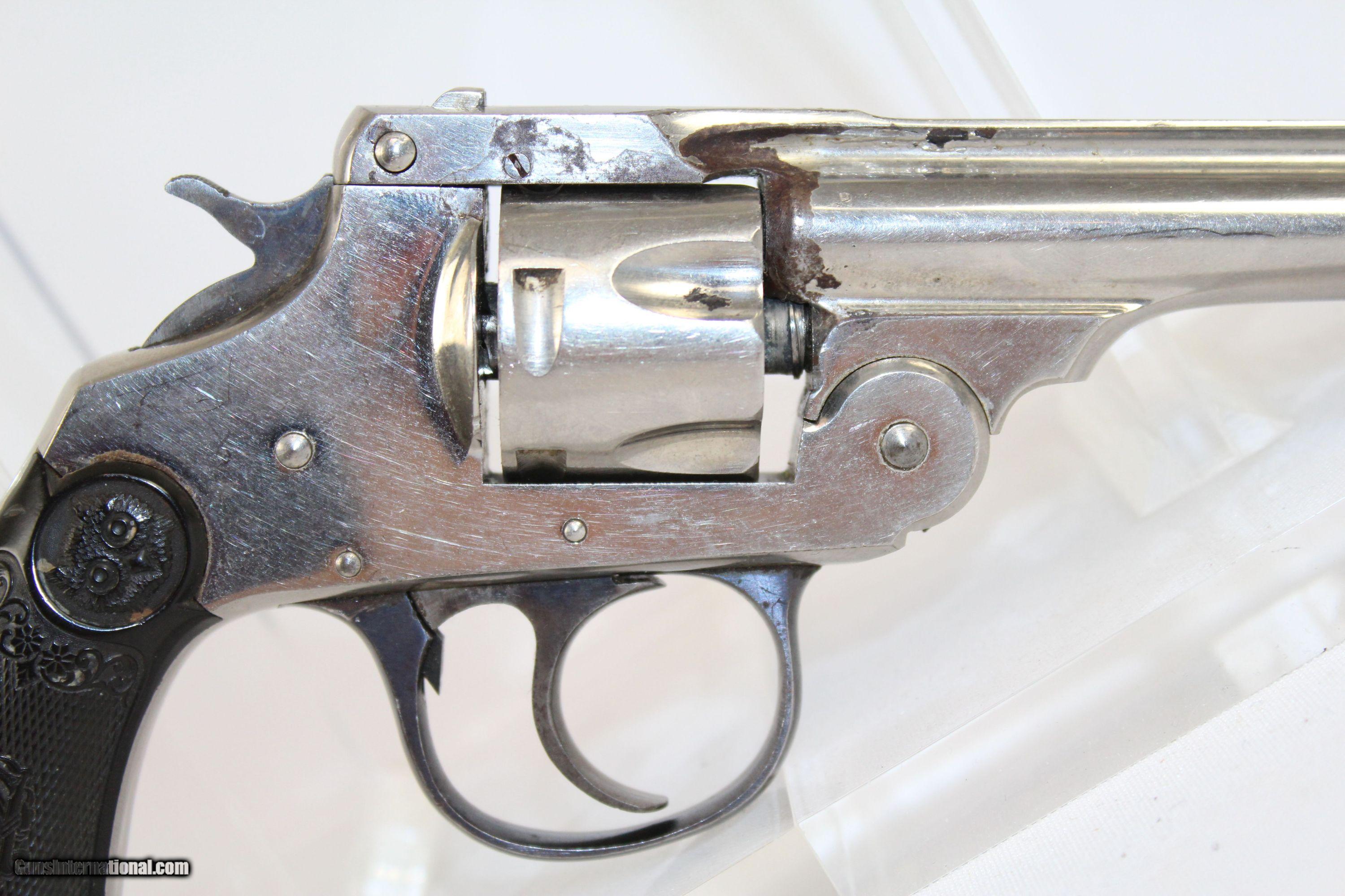 Description: Antique IVER JOHNSON ARMS & CYCLE WORKS Revolver Fine First Model Safety Automatic Double Action Here we present an antique Iver Johnson Arms & Cycle Works First Model Safety Automatic Double Action Revolver in .32 S&W, made circa 1898 in Fitchburg, Massachusetts. Iver Johnson & Martin Bye both cut their teeth with Ethan Allen, then started their own company in 1871. The company continued to operate until 1993. This revolver was designed to be small and concealable for self-defense. This revolver is chambered for 5 shots of .32 S&W. The action works in both double and single action. The top of the barrel is marked “IVER JOHNSON ARMS & CYCLE WORKS/FITCHBURG, MASS. U.S.A.” The grip panels feature an owl on each side. The overall condition is fine. The original nickel finish is 95%. Blue finish on the trigger guard is virtually complete. Nice case colors. The markings are clear and legible. The original hard rubber grips are in good shape, with just a chip off the bottom of the left panel. The bore is sharp and in good condition. The action is excellent. Here is a sharp little revolver from the late-19th Century! Own the original! This is a legitimate antique and not a reproduction. Barrel is 3 inches. Caliber: .32 S&W Overall condition as seen in photos. Very Fast. Very Safe. FREE SHIPPING WORLDWIDE. Delivered directly to your door by express mail! Guaranteed AUTHENTIC & Includes CERTIFICATE OF AUTHENTICITY. ancestryguns $550 #5009 SOLD Antique: Yes |