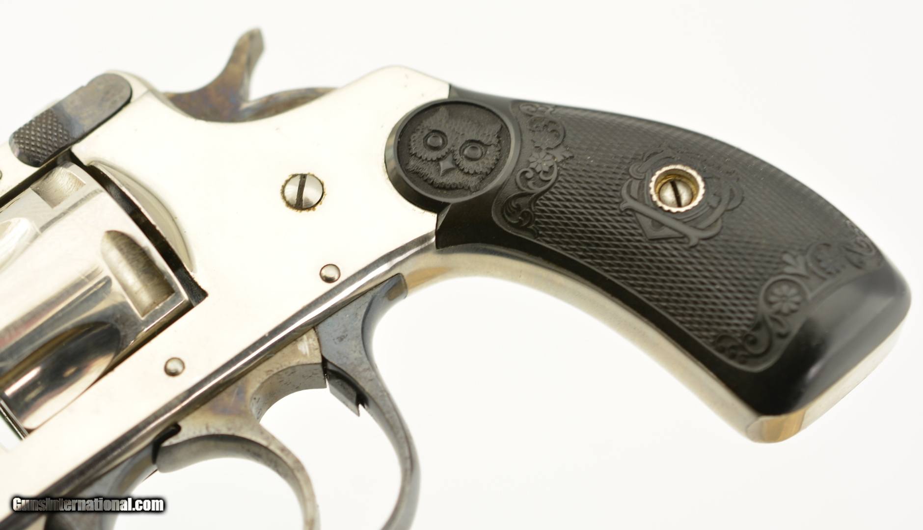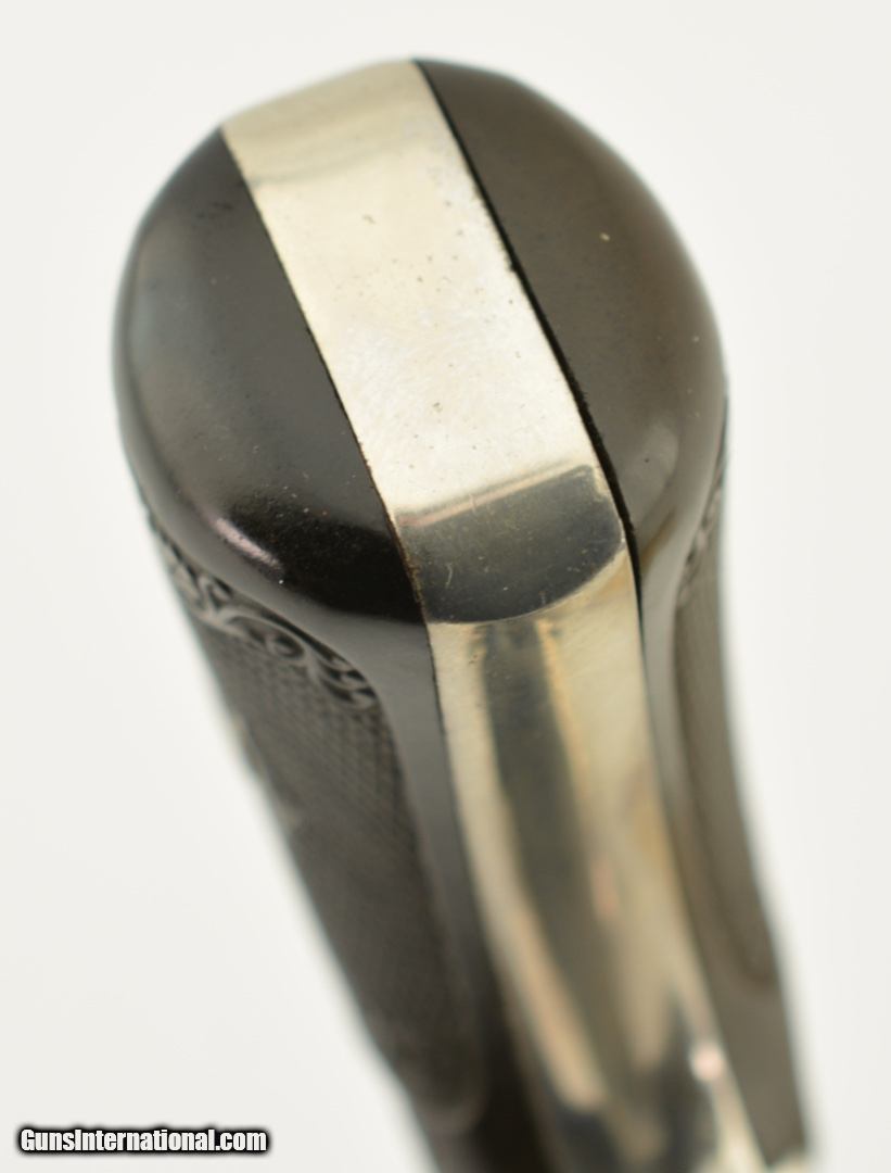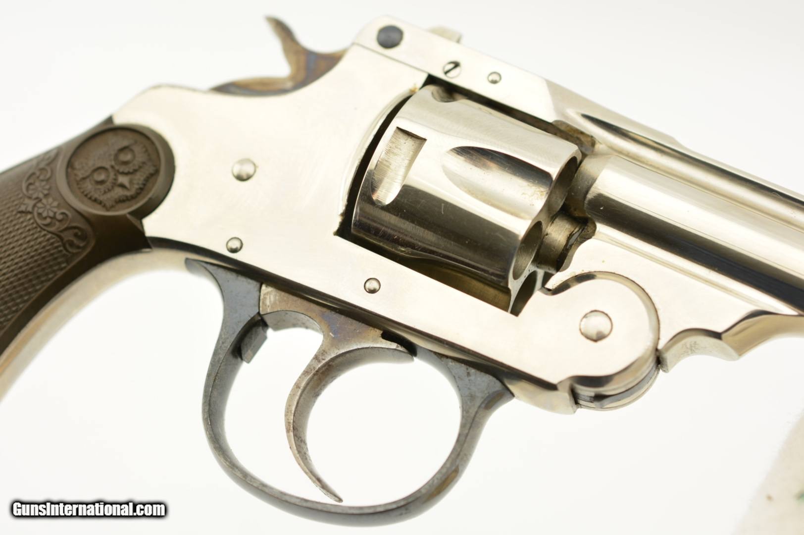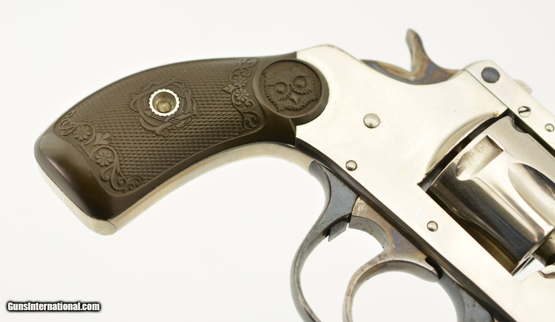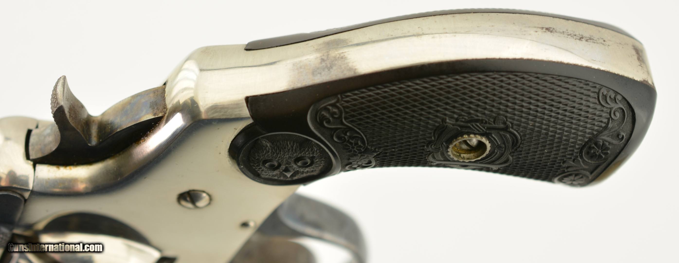 Description: Serial #2737, .32 S&W (blackpowder only), 3" barrel with a very good, bright bore that has a patch of dark freckling near the breech-end. This is a handsome little pre-1898 revolver that has retained 98-99% of the original nickel-plated finish throughout, as well as a commensurate amount of original blue on the latch and trigger guard. The hammer and trigger have retained most of their original color case-hardening as well. The checkered, hard rubber owl grips (one of which has faded to dark brown over time) are in excellent condition with very little wear or flattening of the points. The lock-up is tight and the action functions flawlessly. The revolver is housed in an original unnumbered brown cardboard box with intact paper end label. The box is in very good condition, with some edge damage and old tape repairs to two of the lid corners. This is an excellent example of an early Iver Johnson DA revolver, and would make a great addition to a collection. Antique; SOLD |