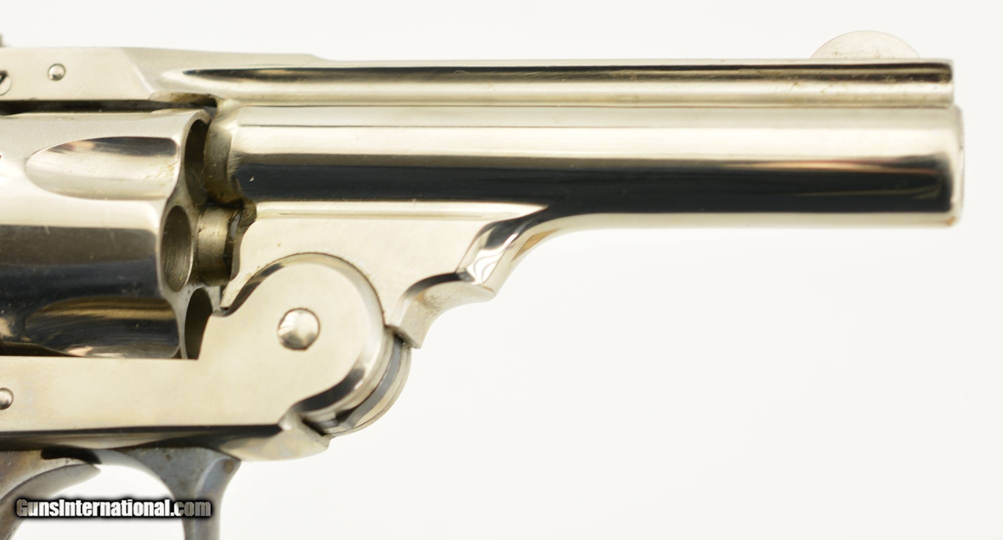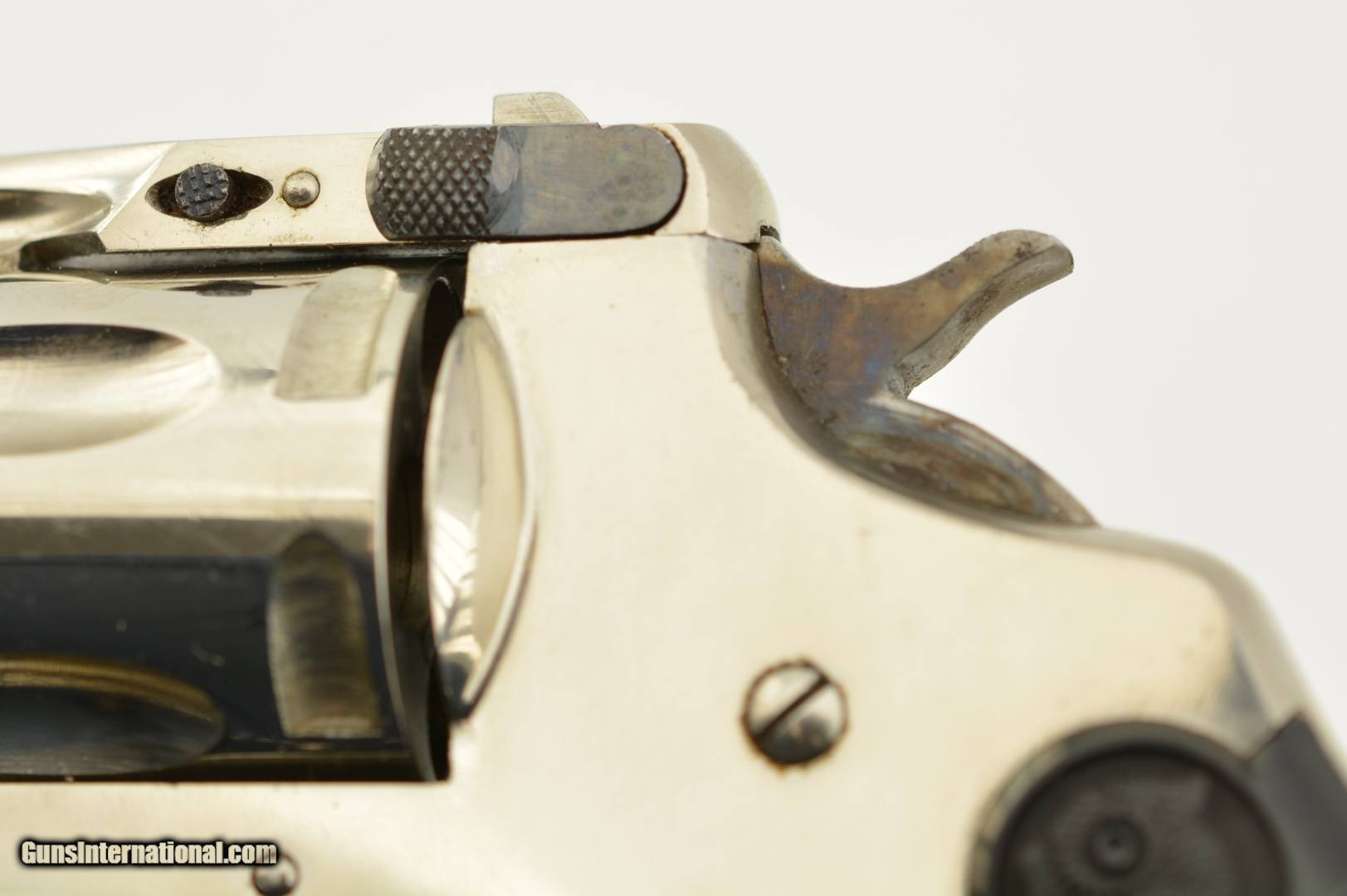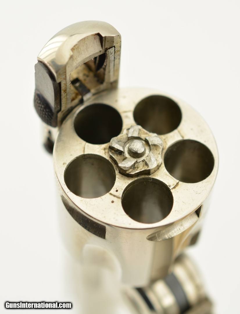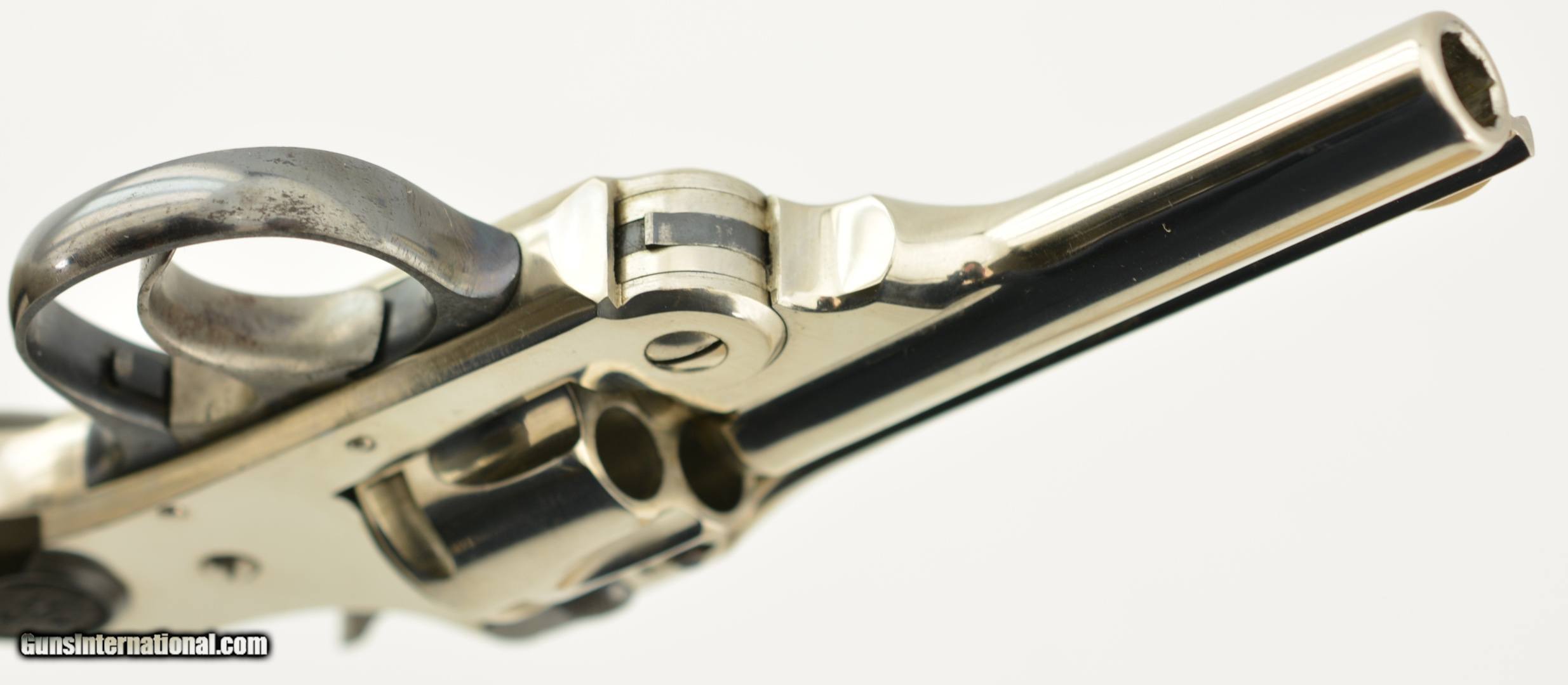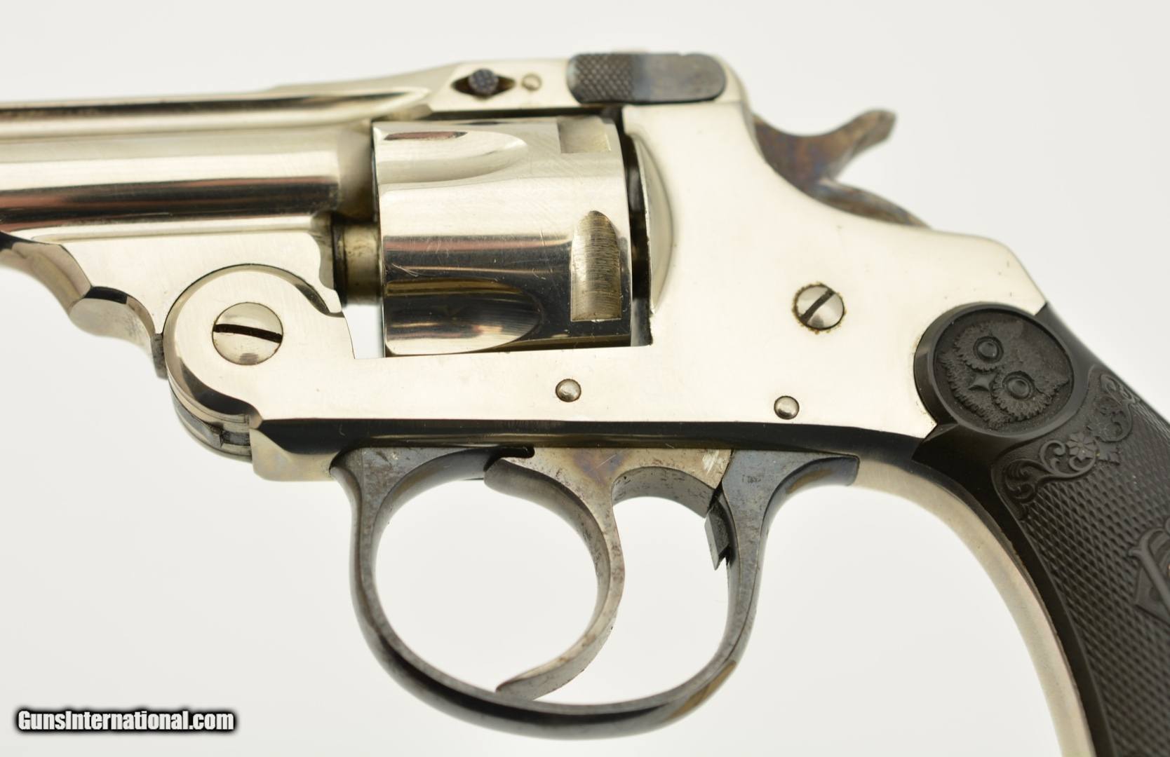 Description: Serial #2737, .32 S&W (blackpowder only), 3" barrel with a very good, bright bore that has a patch of dark freckling near the breech-end. This is a handsome little pre-1898 revolver that has retained 98-99% of the original nickel-plated finish throughout, as well as a commensurate amount of original blue on the latch and trigger guard. The hammer and trigger have retained most of their original color case-hardening as well. The checkered, hard rubber owl grips (one of which has faded to dark brown over time) are in excellent condition with very little wear or flattening of the points. The lock-up is tight and the action functions flawlessly. The revolver is housed in an original unnumbered brown cardboard box with intact paper end label. The box is in very good condition, with some edge damage and old tape repairs to two of the lid corners. This is an excellent example of an early Iver Johnson DA revolver, and would make a great addition to a collection. Antique; SOLD |