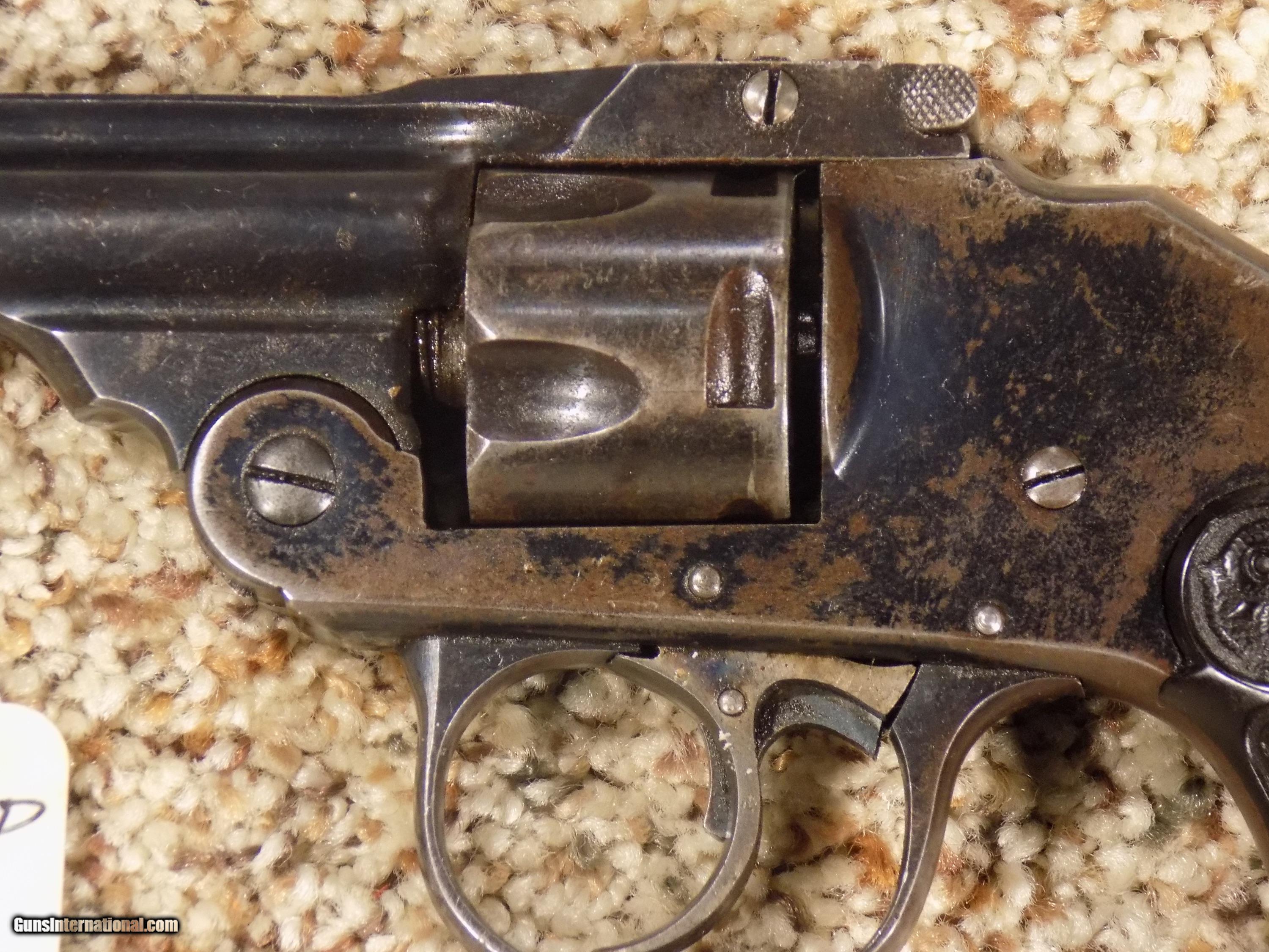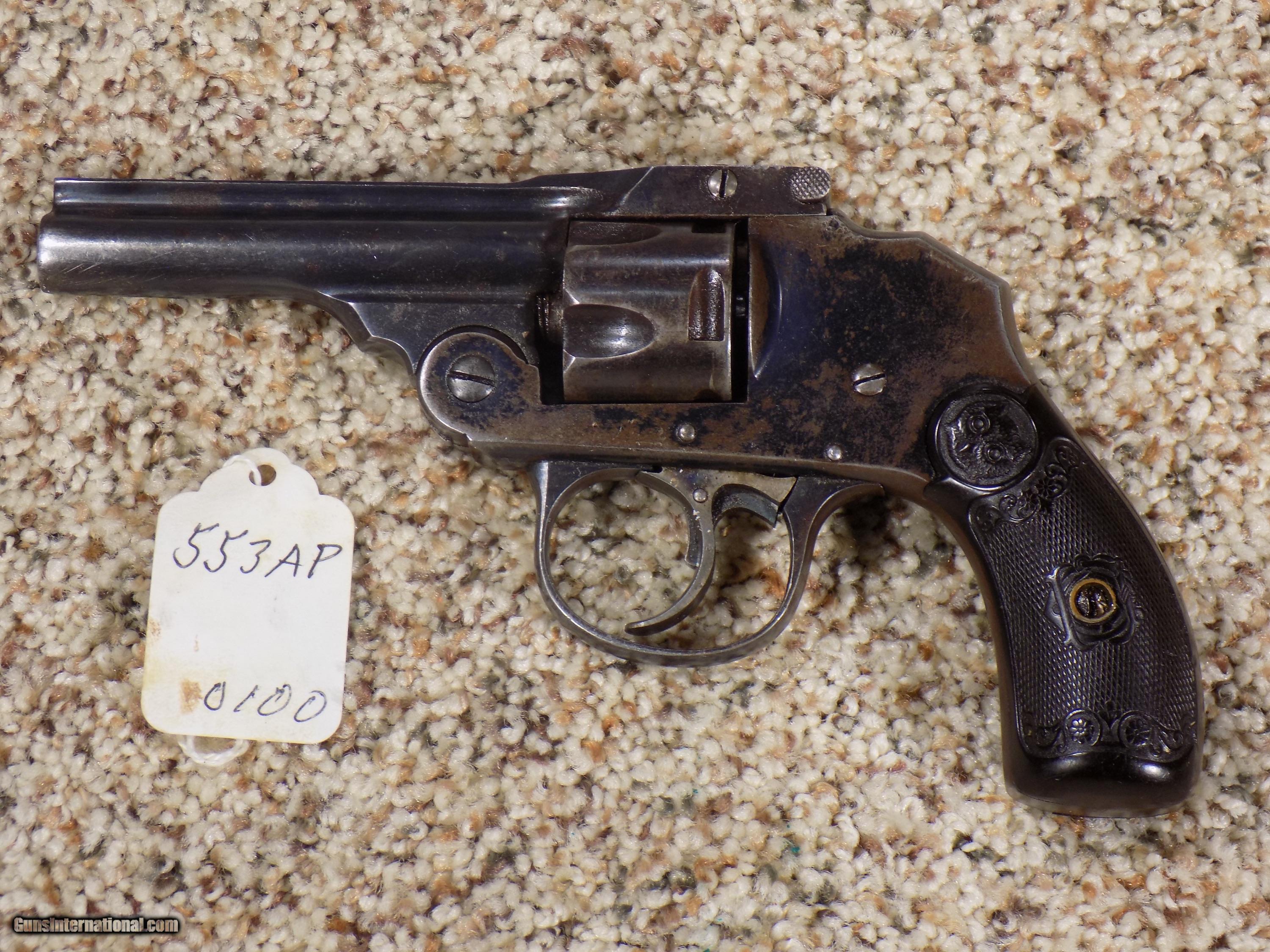Description: #553AP IVER JOHNSON 5 SHOT HAMMERLESS REVOLVER, 32 S&W CF, 3" bbl., 70% blue thinning, VG owls head grips, fair bore, safety lever in trigger. $135 SOLD Antique: Yes |