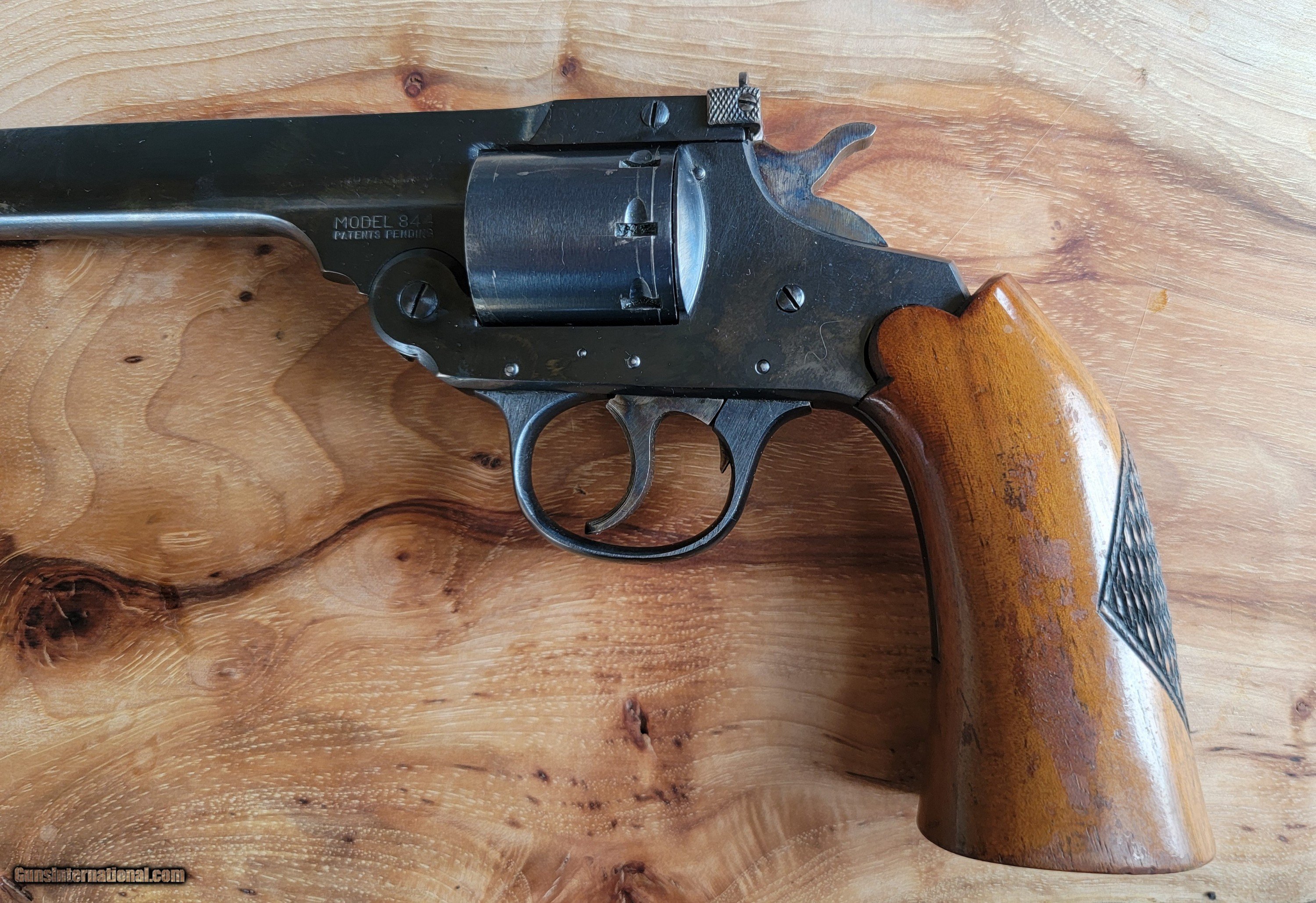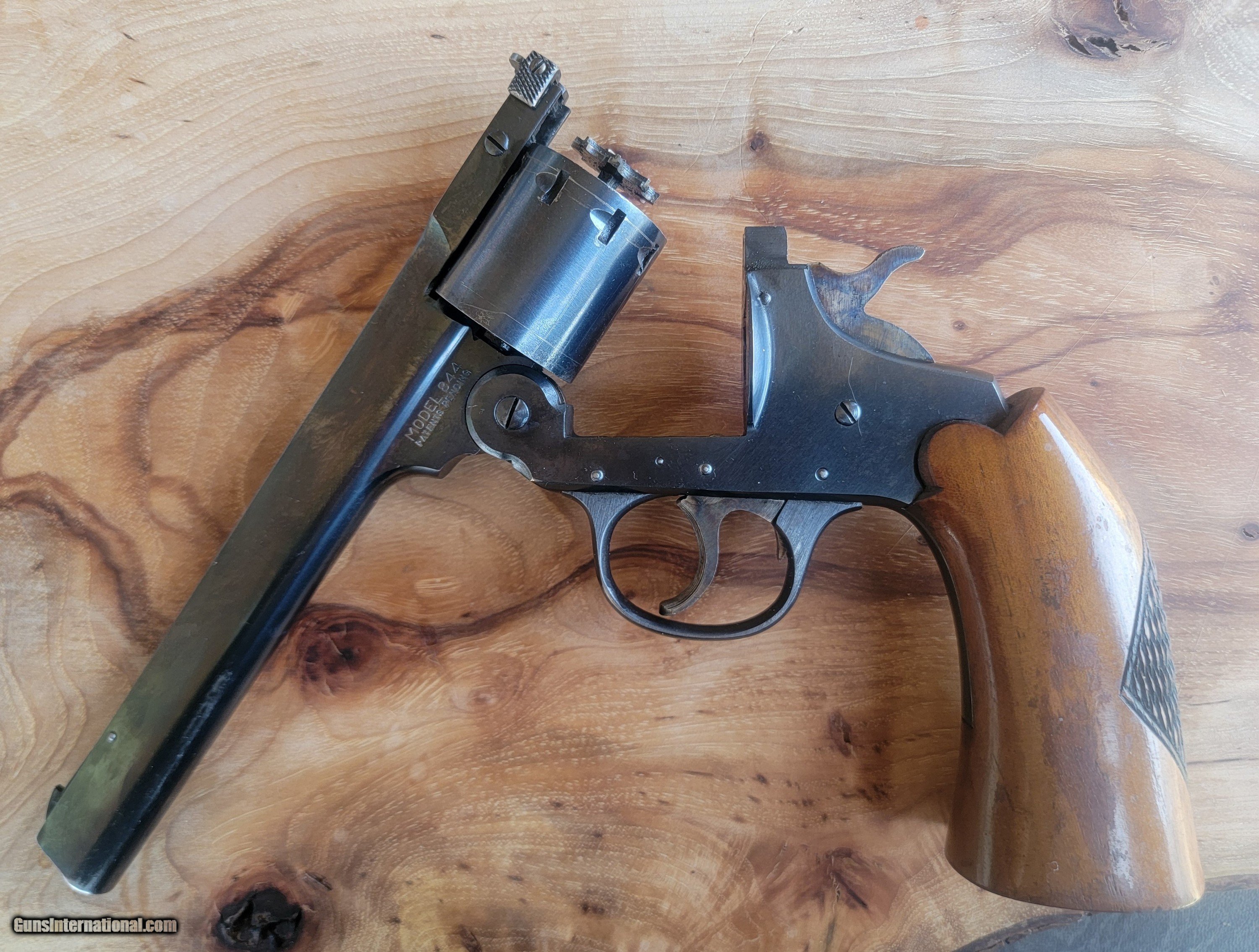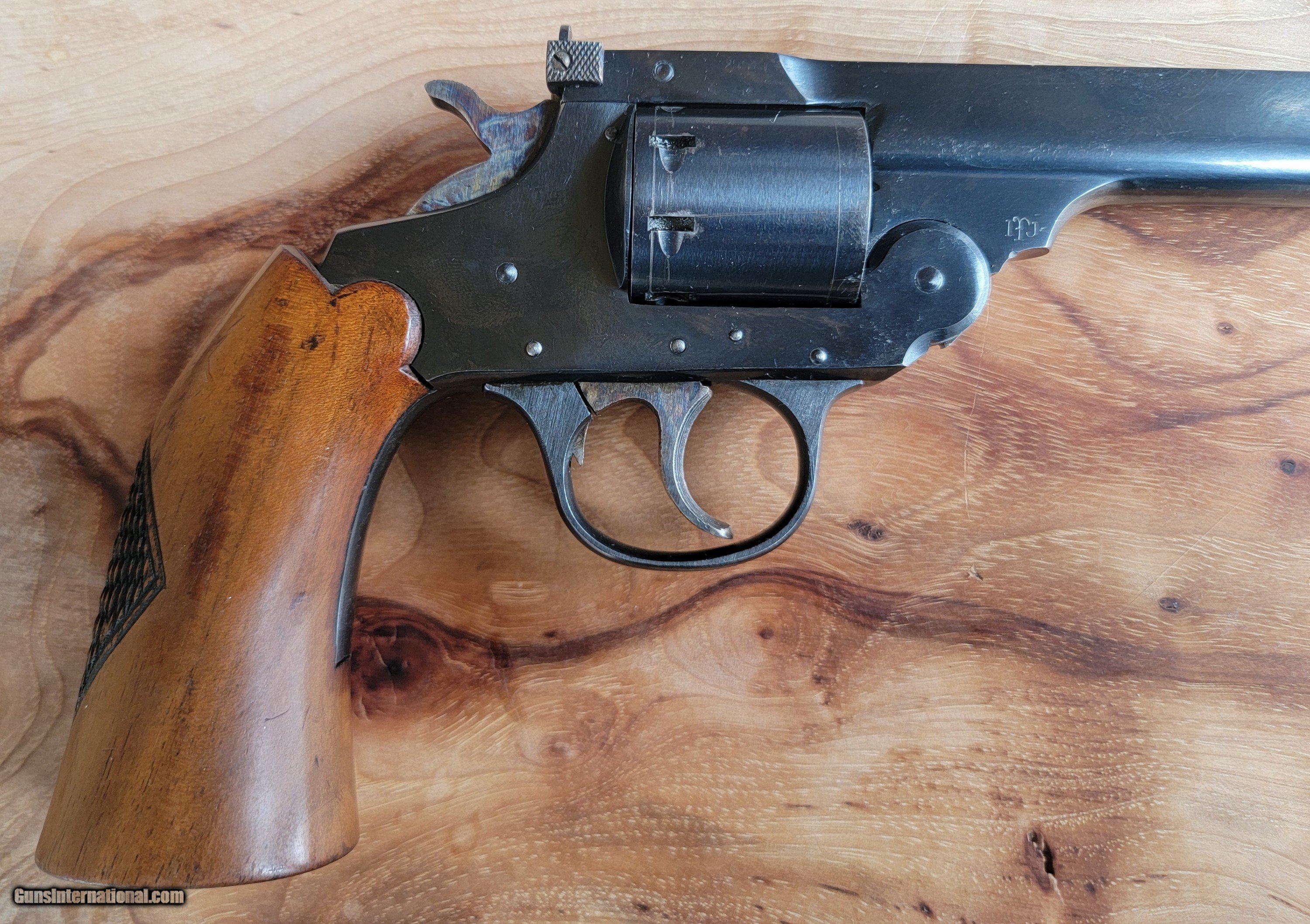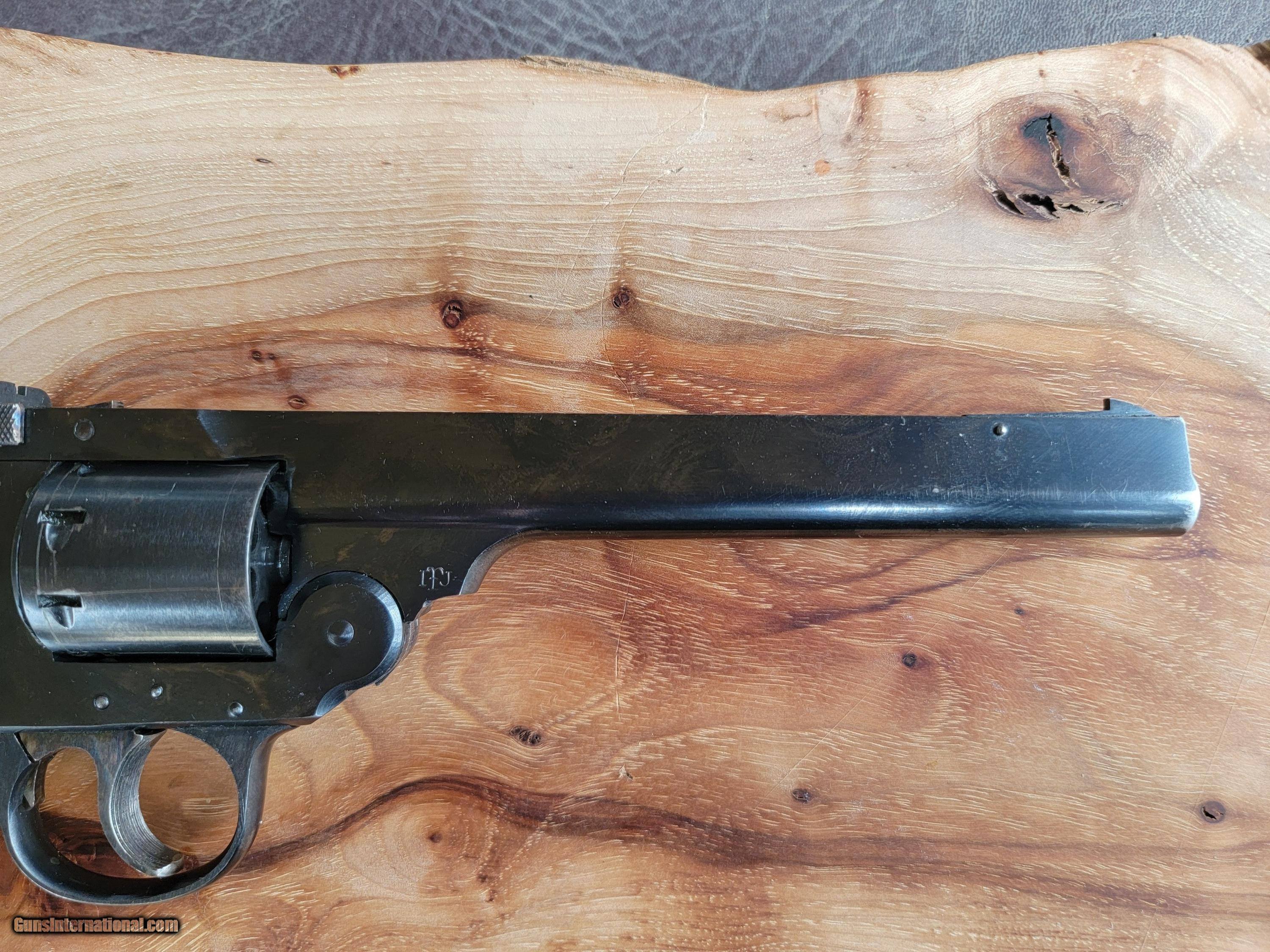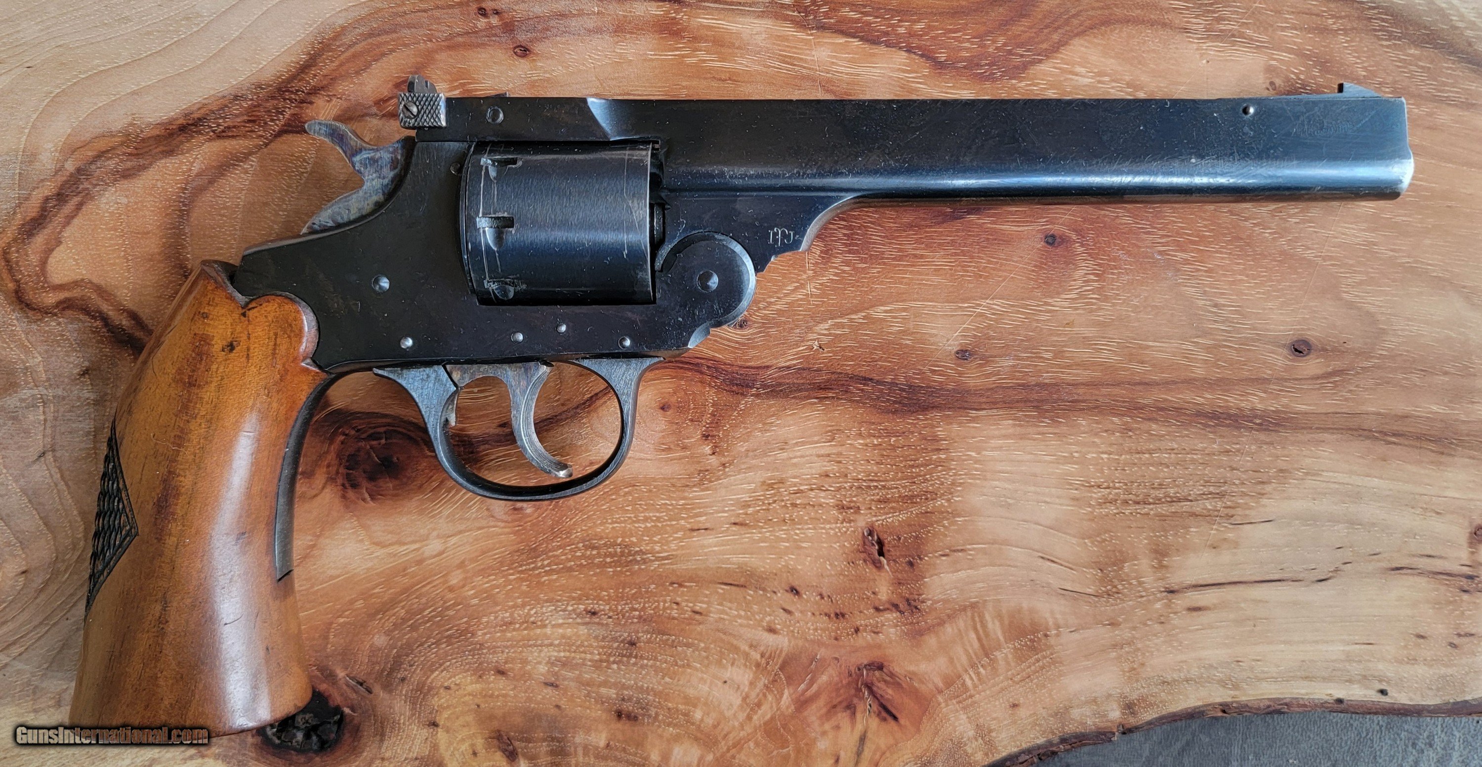 Description: SOLD IN ONE DAY This is a high-quality, well-made, well-finished 8-shot top break, large frame, double action .22 LR target revolver. Of course, being a revolver, you can also use .22 longs ( who uses these), shorts, and CBs.The Model 844 were made for only two years, with this one being made in 1956. It has a transfer bar to prevent accidental discharge if it is dropped. Iver Johnson came up with this in 1904, advertised as Hammer the Hammer. Ruger waited until 1973 to incorporate a transfer bar. Other innovative features include a cylinder sealing system that prevents escaping gas from the front of the cylinder from being directed only forward instead of to the sides. The rear of the cylinder is countersunk and notched to allow safe, non-damaging dry firing. It has a six-inch slab-side heavy barrel, weighs 30 oz, and is 10.75" long. It has a checkered one-piece black walnut grip, grooved trigger, checkered case-hardened hammer, adjustable rear sight for windage, and an adjustable front partridge sight for elevation. It is mechanically perfect, with 99+% % + intact bluing and no pitting or rust. It would be NRA-rated very good or close to excellent. It's fun to shoot and very accurate. A word about Iver Johnson. I never gave them much thought until I impulsively won aon a large-frame .32-long revolver (the last photo; no, it's not for sale). Many people think they are cheap and poorly made. They are wrong. They are very nice, accurate, and seriously undervalued. I'm selling it because I accidentally ended up with two because I thought I was on a Model 855, which is identical but single-action only. .SOLD TO ROGER SOLD Handgun Caliber: .22 Long Rifle Manufacturer: IVER JOHNSON Model: 844 Barrel Length: 6 Condition: VG-Excellent 99%+ Metal Condition: Excellent Wood Condition: Excellent Bore Condition: Excellent Stock: Checked one piece walnut Finish: Blued 99%+ Some faint scratch marks on cylinder Weight: 300z Sights: Adjustable Manufacture Date: 1956 Item Location: Dallas Texas |