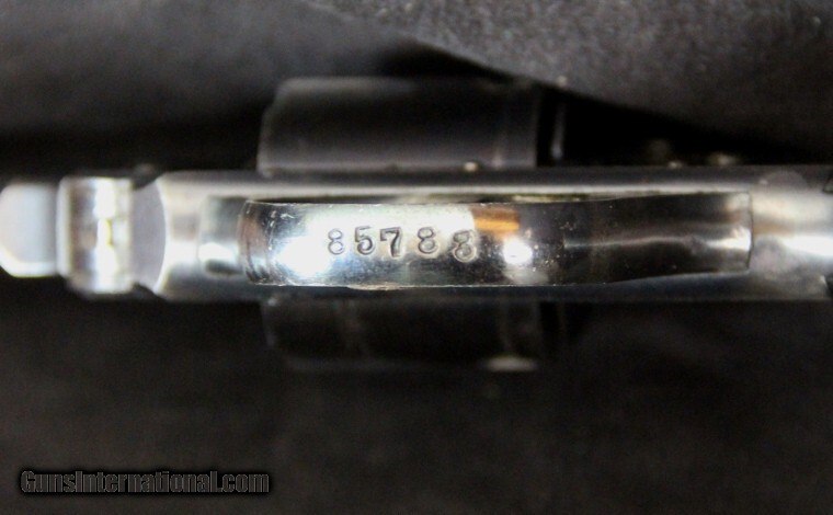 Description: .38s&w, #85783, 5 shot, 4 inch barrel, blue finish with case color hammer and trigger, 2 piece hard rubber grips, probably manufactured between 1909 and 1919. Condition: excellentt bore, 90% blue overall, 95% bright case colors, excellent grips, excellent mechanically, excellent marks. Curio/Relic: Yes Price: $250.00 Contact Seller |