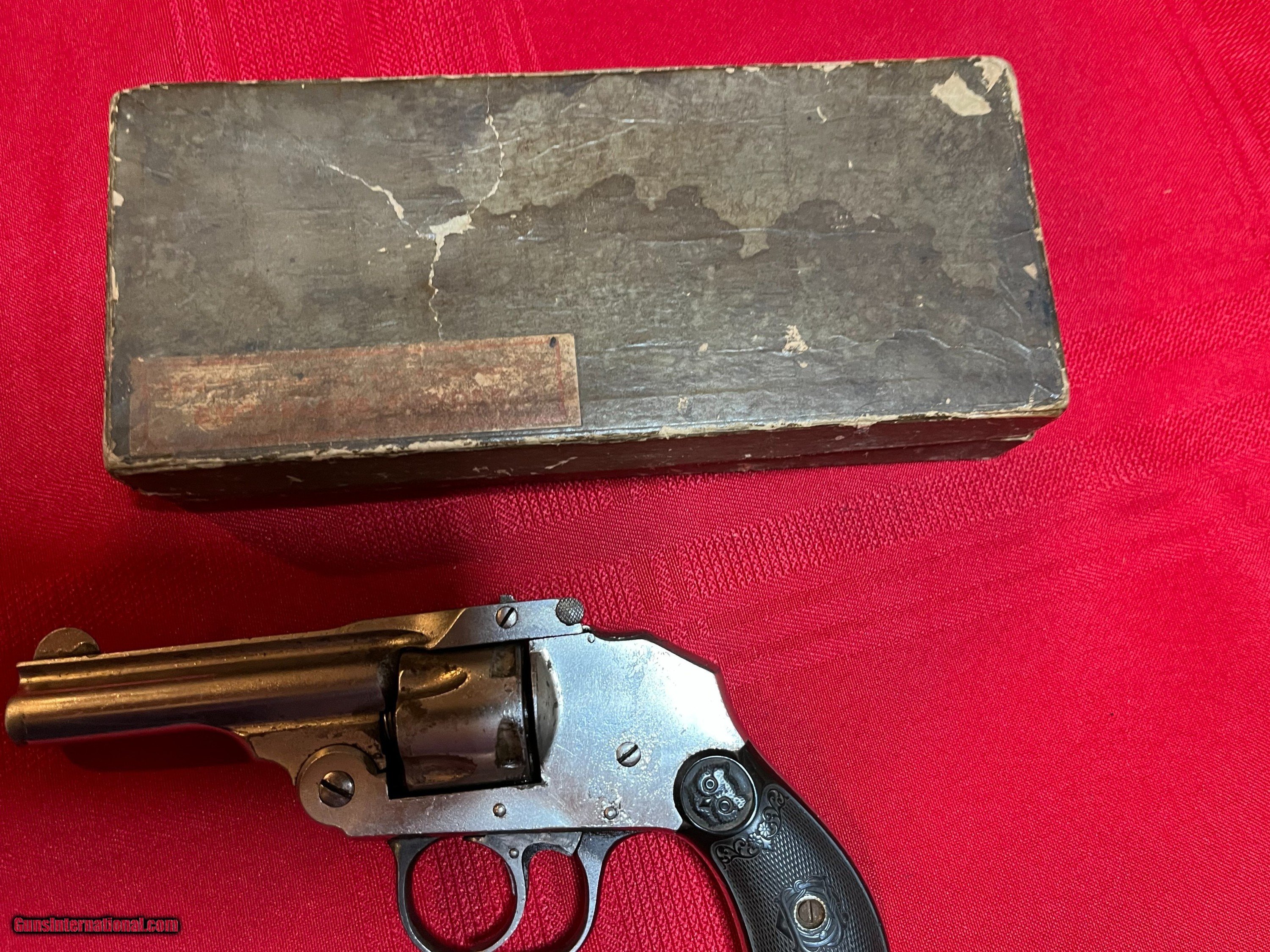 Description: In original box 32 caliber iver Johnson revolver. Nickeled with plastic grips. Nickel is dull, grips are perfect. Box is solid with some damage. Early black powder gun. SOLD Curio/Relic: Yes Handgun Caliber: .32 S&W |