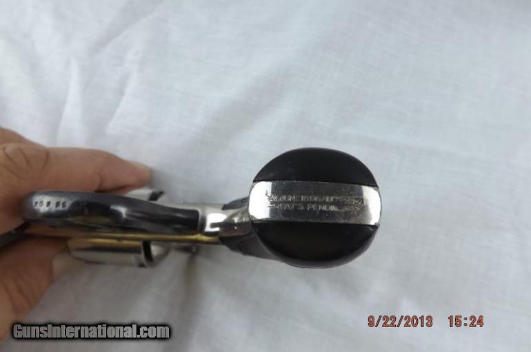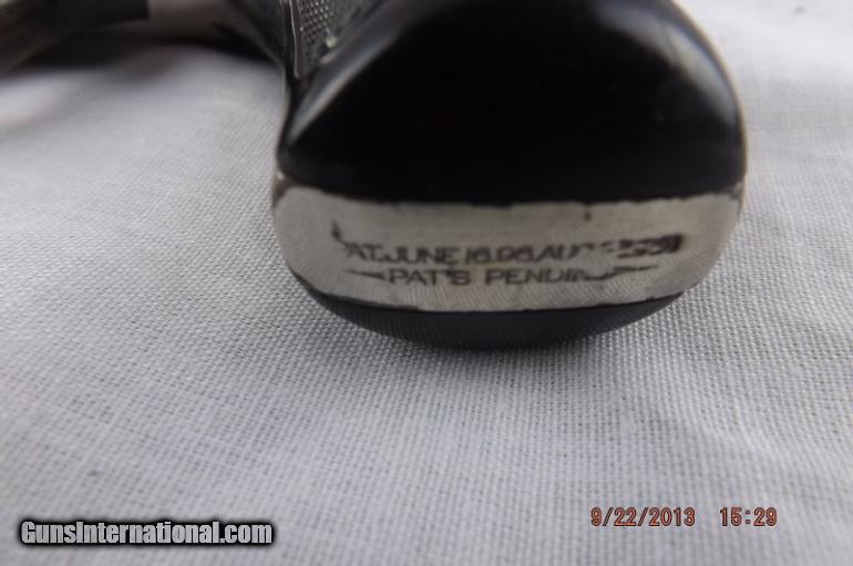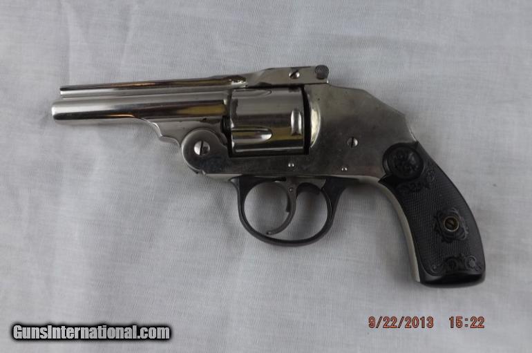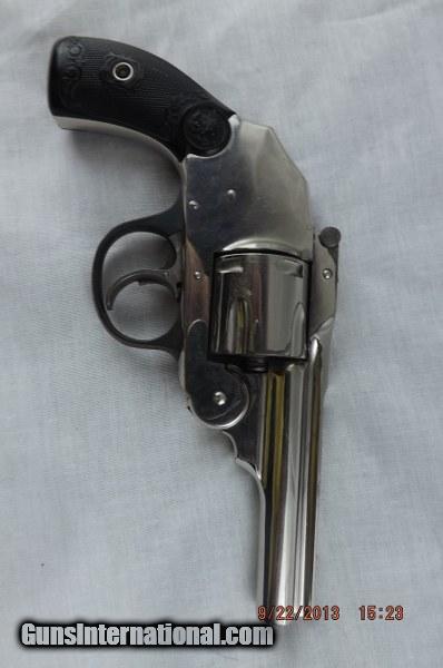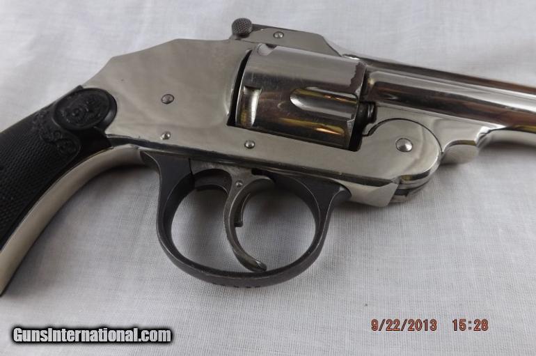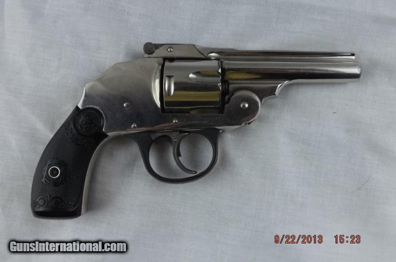This is the Second Model 6th Variation of the safety Hammerless. There is a small amount of nickel flaking at the front of the cylinder and a small flake missing from the frame in front of the cylinder. The trigger still retains the case coloring. The hard rubber grips are fine with no cracks or chips.