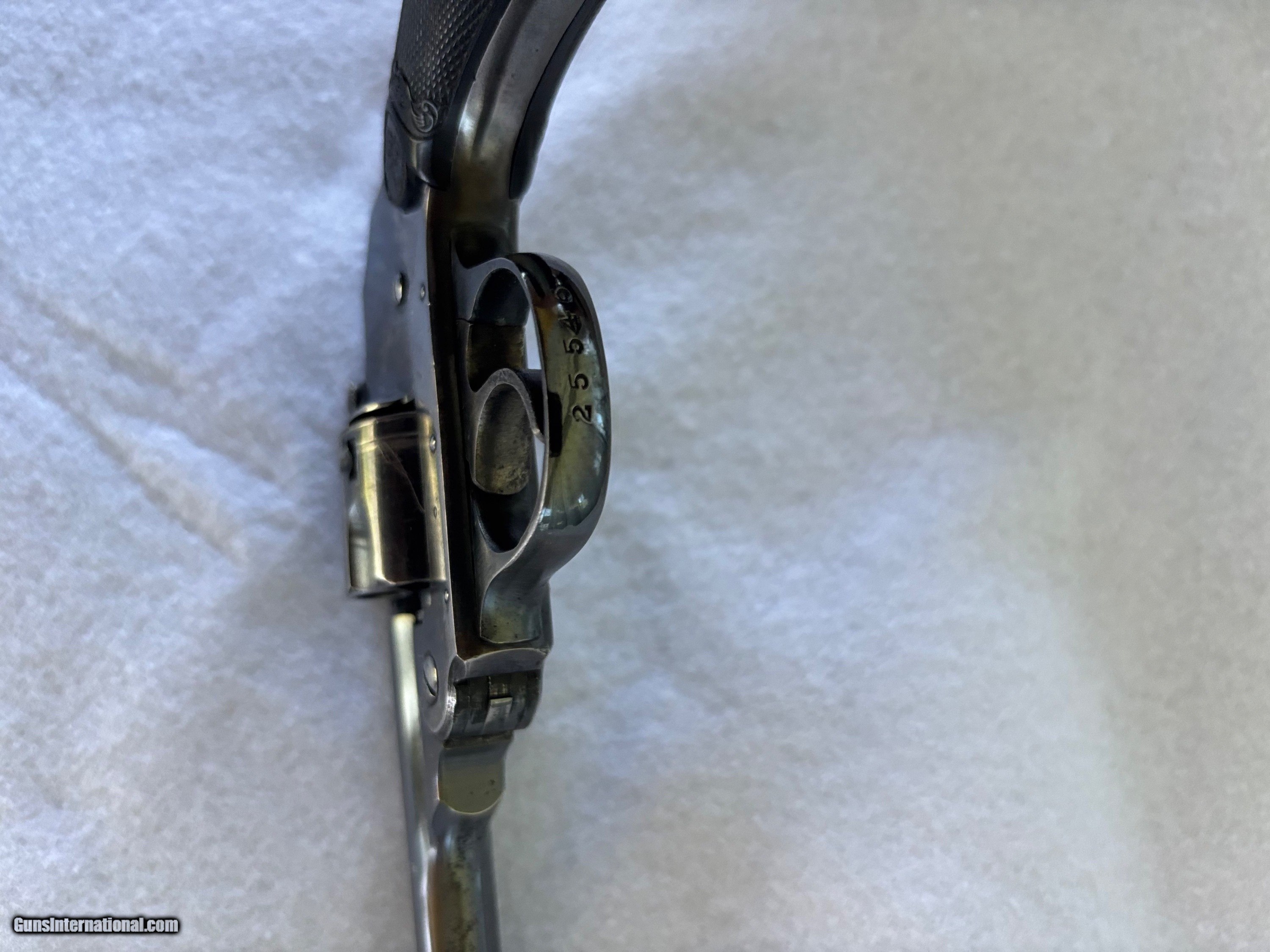 Description: Iver Johnson Third Model , 2nd Variation, small frame Safety Hammerless Revolver. Top Break , auto ejecting, double top post barrel latch, coil spring, 5 shot , 3” barrel in .32 S&W short . made in 1920. Blue finish. C&R OK Top of barrel reads : *IVER JOHNSON ARMS & CYCLE WORKS* FITCHBURG MASS U.S.A. Condition: 3” raised ribbed round barrel with a good bore showing just some minor traces of pitting in the rifling. The metal surfaces of the original blue are turning to an antique gu-metal gray patina. The trigger and hammer retain much of their case-hardened finish All markings are crisp with the barrel and trigger guard serialized to the frame. Very good looking black checkered hard rubber grips with the owl logo. Mechanically works very well in double action with good timing and lock-up. A good example of a fine Iver Johnson .32 S&W Third model. The 1st and 2nd models were made for black powder or lower pressure loads . The 3rd models changed over to a coil hammer spring which allowed stronger pressure smokeless loads to be used. This model uses a .32 S&W smokeless powder This revolver is a complete ORIGINAL , matching numbers. Nice example of a Iver Johnson Third Model small frame .32 and would make a nice addition to any top break collection This firearm may ship to a C&R or FFL who will accept my C&R license. FREE USPS priority shipping. This gun is sold "as-is" as a collectible with no refund and no return. Payment can be made with bank check, postal , money order, or personal check. For instant payment and shipping i can take Venmo, Zelle or Cash App. Gun Tab is available for credit card options at check out SOLD Curio/Relic: Yes Handgun Caliber: .32 S&W Manufacturer: Iver Johnson Model: 3rd Serial Number: 25546 Barrel Length: 3 |