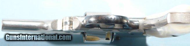 Description: IVER JOHNSON U.S. REVOLVER CO. BREAK TOP .32S&W NICKEL REVOLVER WITH PEARL GRIPS. Serial number "11XX". 3" barrel. 97% original factory nickel remaining. Very good bore and chambers. Working order. Mother of pearl factory grips. Pre WW2 manufacture. Probably factory gold wash in the cylinder stops and flutes. Blue triggerguard with crisp serial number. 1910-1935. SOLD Curio/Relic: Yes |