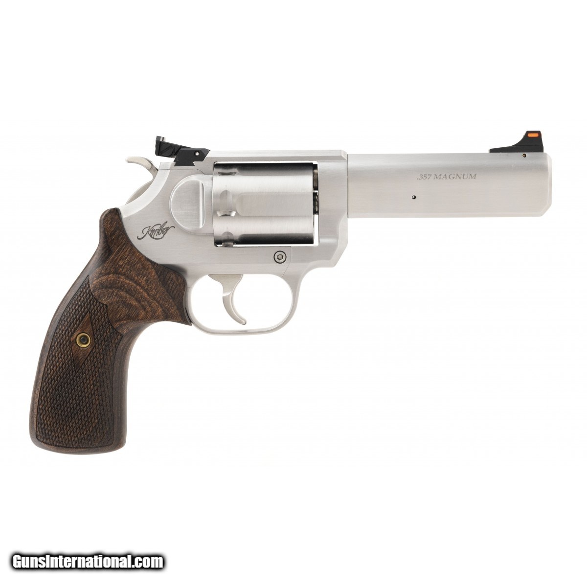 Stainless snub-nose revolver with checkered walnut grips, 4"" barrel and adjustable rear sight with fiber optic front sight. New. UPC: 669278376219.