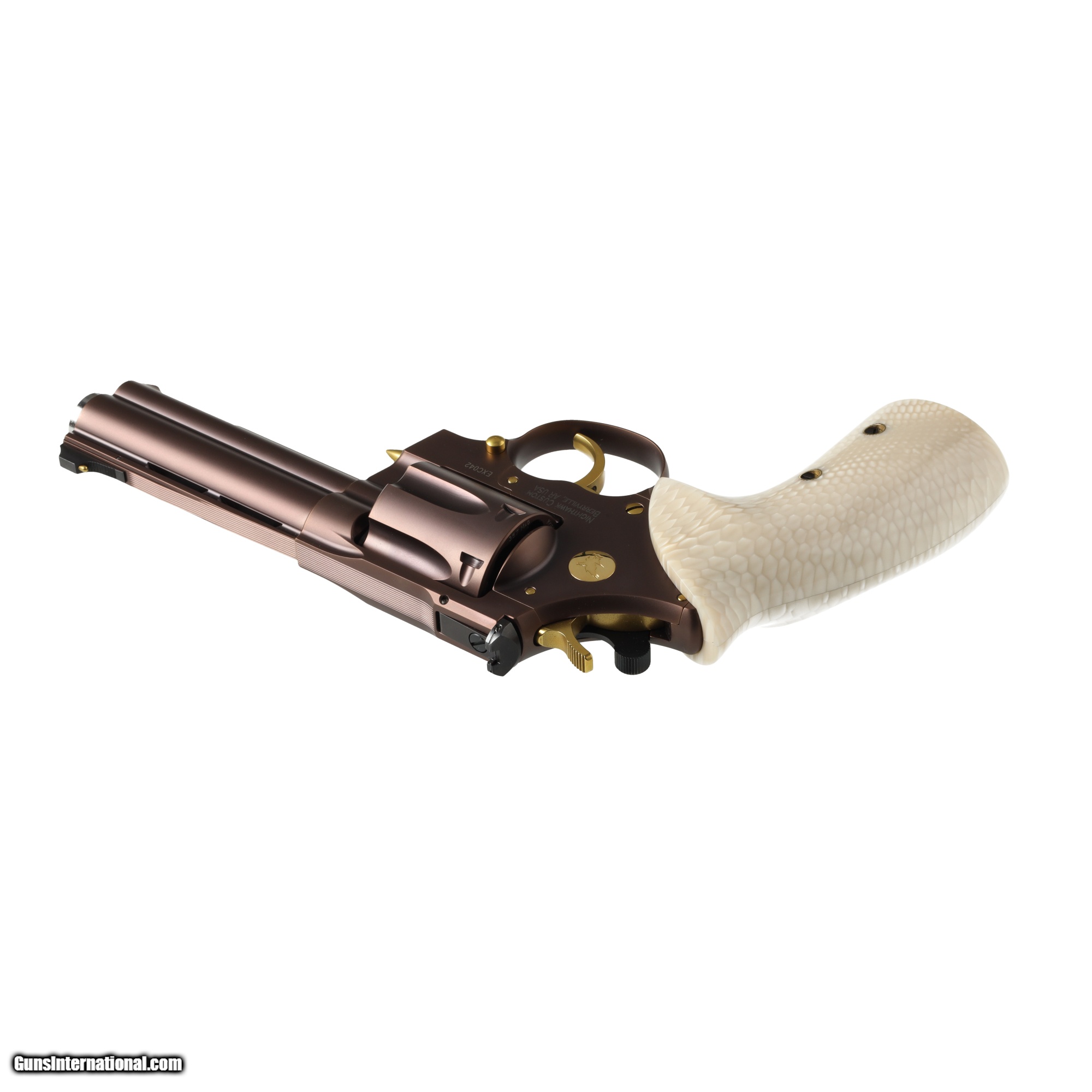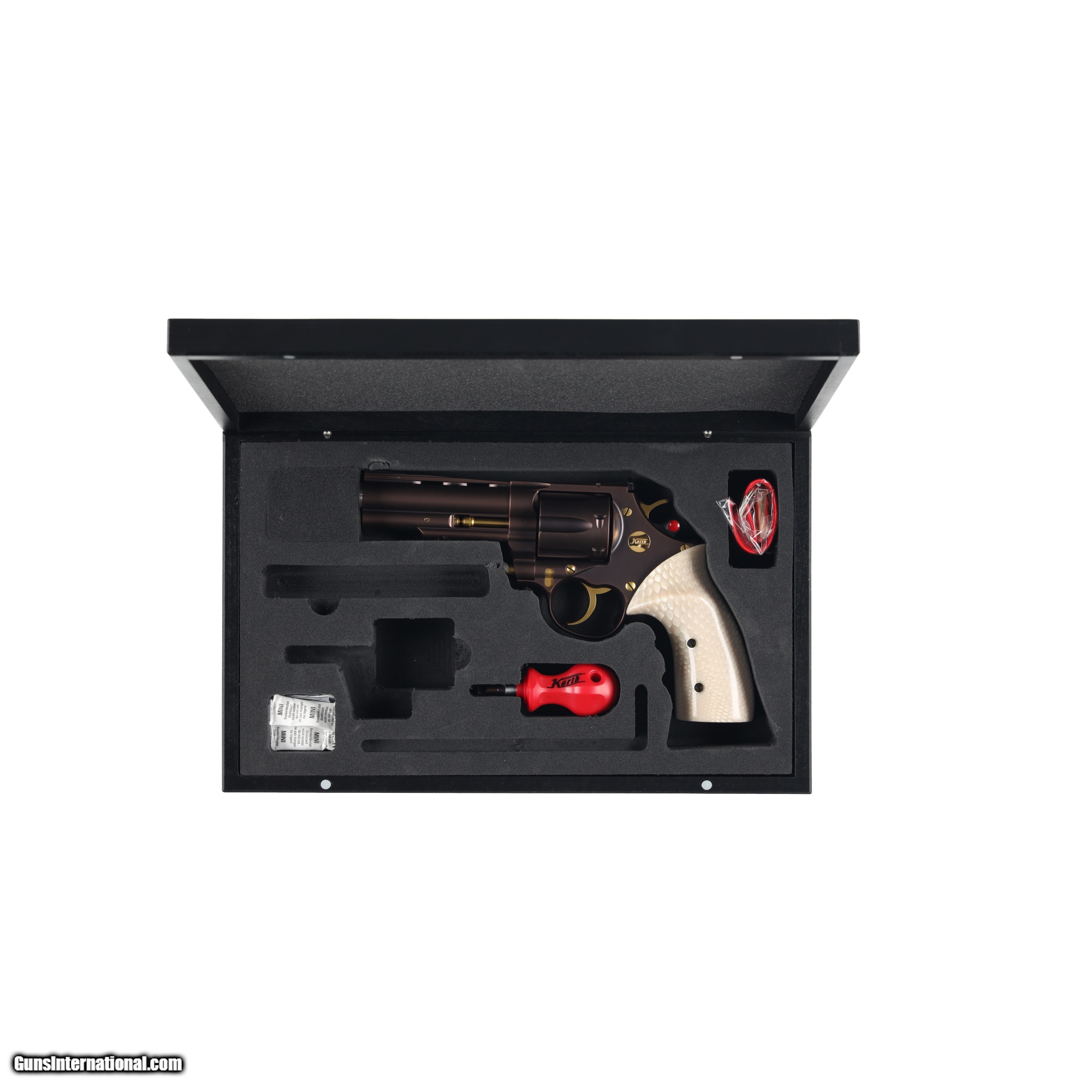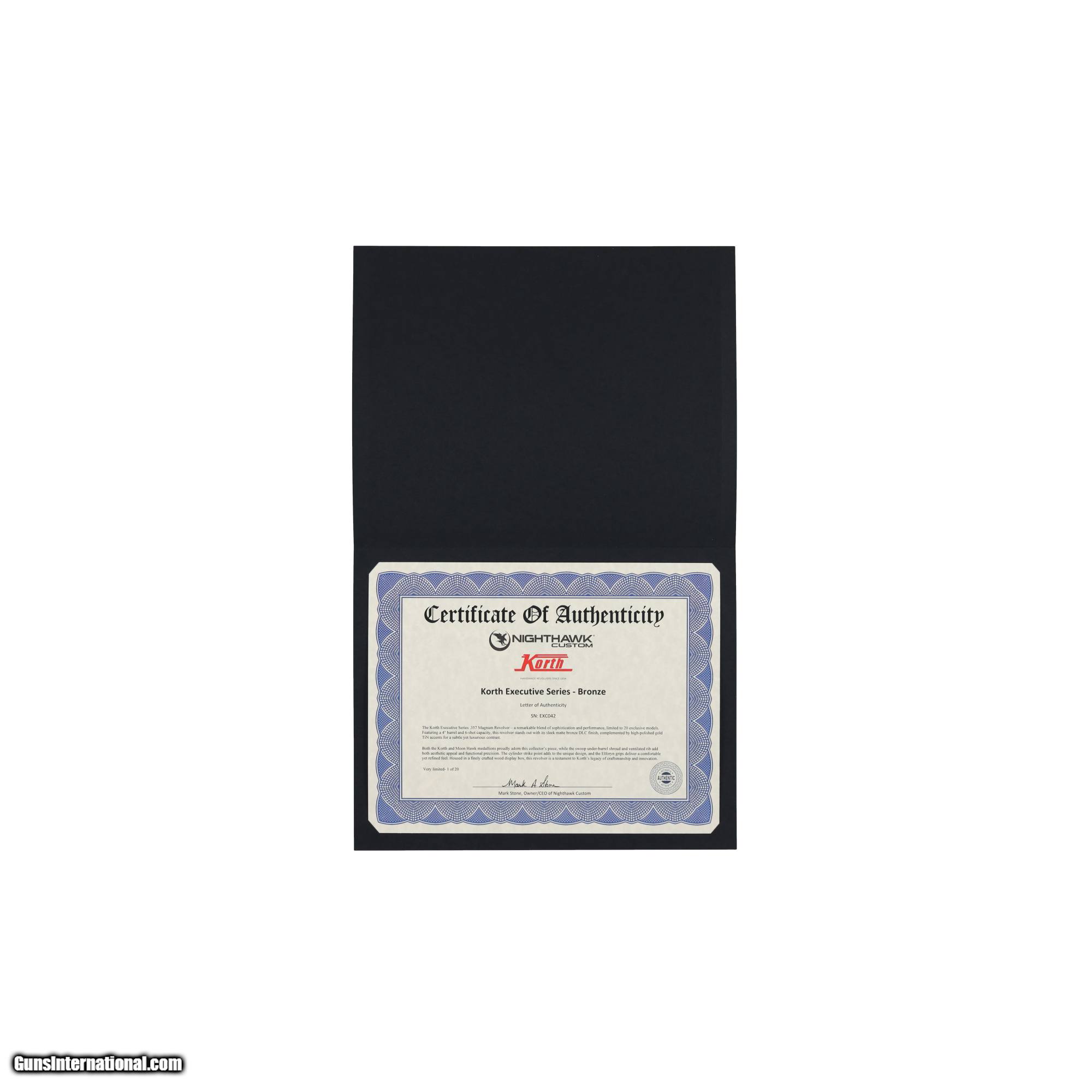 Description: The Korth Executive Series .357 Magnum revolver is a remarkable blend of sophistication and performance, limited to 20 models. Featuring a 4" Barrel and 6 shot Capacity, this revolver stands out with its sleek matte bronze DLC finish, complemented by High polished gold TiN accents for a subtle yet luxurious contrast. Both the Korth and Moon Hawk medallions proudly adorn this collector's piece, while the swoop under-barrel shroud and ventilated rib add both aesthetic appeal and functional precision. The cylinder strike point adds to the unique design, and the Elforyn grips deliver a comfortable yet refined feel. Housed in a finely crafted wood display box, this revolver is a testament to Korth's legacy of craftsmanship and innovation. Manufactured in: Germany Hand: Right Hand Action Finish: Bronse DLC Action Description: Revolver Metal Finish: Original Barrel Length: 4 Inches Barrel Condition: New Stock Finish: Original Stock Condition: New Grip: Pistol Extra Barrels: No. SOLD Manufacturer: Korth Model: Executive Caliber Info: .357 Magnum Condition: New Metal Condition: New Action: Revolver Triggers: Single Rib: Ventilated Finish: Original Weight: 2.6 lbs Extras: No. Case: Maker's Wood Case |