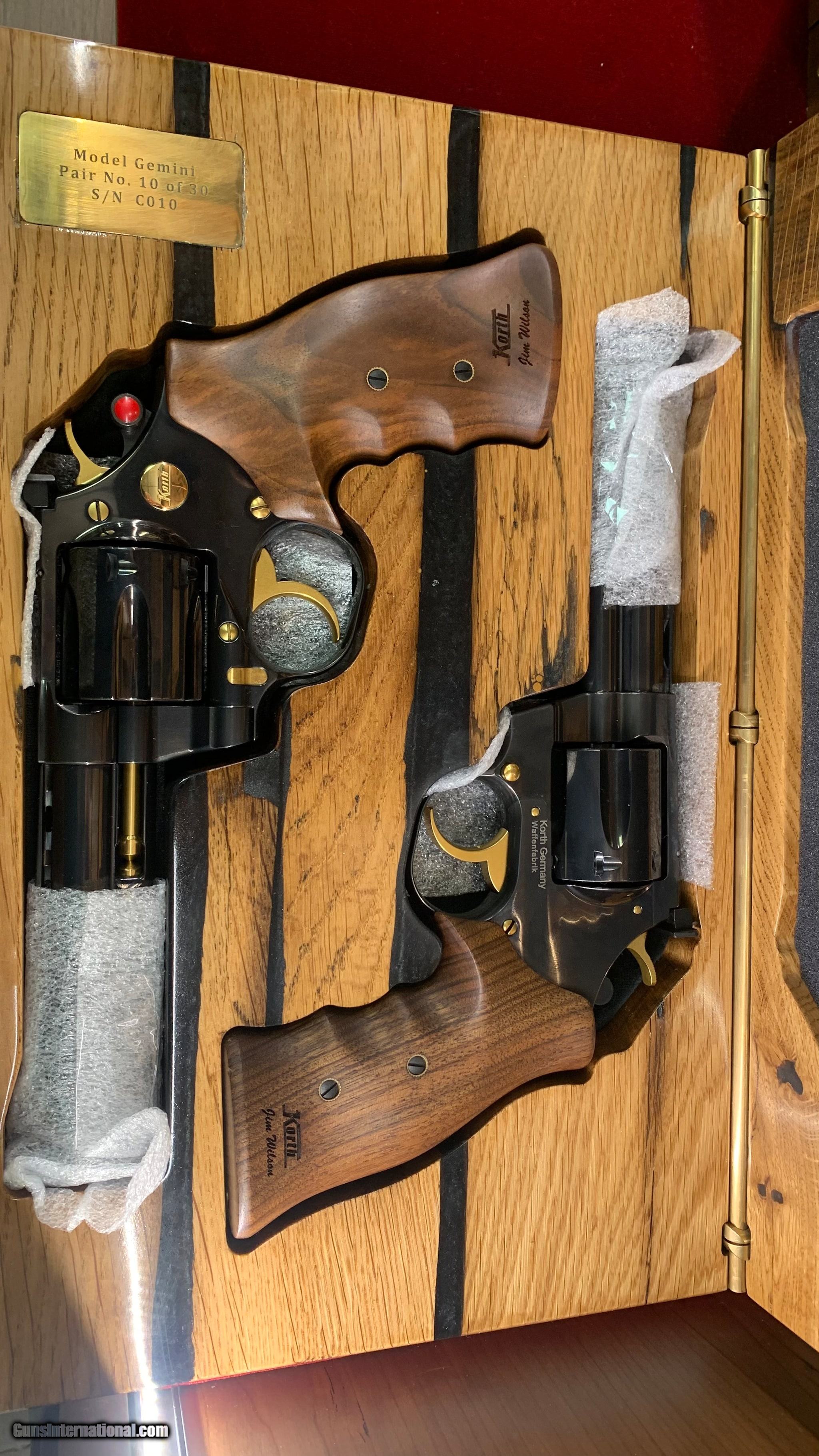 Description: Guns Listing ID: 397087 **New** Korth Germany/ Nighthawk Customs Gemini 2 revolver set in wooden case #10 of 30 SOLD Manufacturer: KORTH Model: GEMINI 2 GUN SET Caliber Info: .357 MAG Condition: Used - Non-Certified Barrels: 5 BARREL Finish: BLACK AND GOLD |