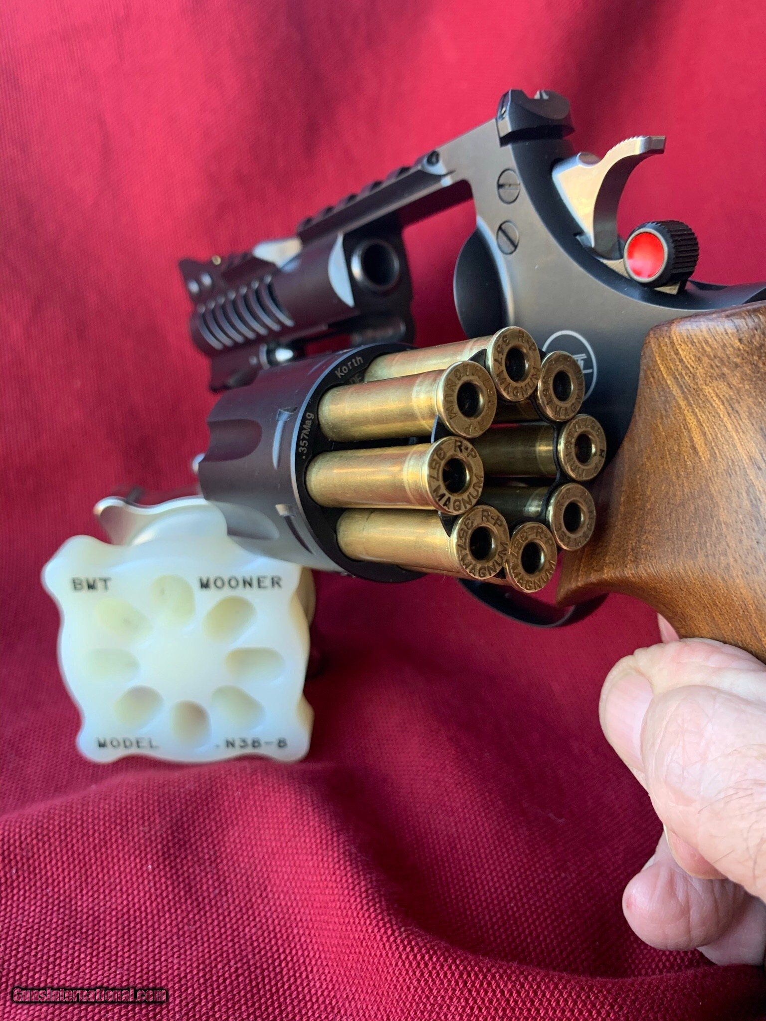 Description: Korth NXS 8shot 357mag, pristine condition, not a mark anywhere. If it looks like a scratch it's lint! Cylinder is cut for moon clips. Shoots all ammo with or without using moonclips. Moonclips allow for a more rapid reload (ref. Jerry Miculek world record video). Barrel is of a polygonal design. Accurate and easier to clean with no lands and grooves to collect lead or copper residue. Picatinny rail above and below barrel for red dot sight and light if desired. Everything else is standard Korth excellence. Having said all that, my hands are just too small to properly handle this weapon double action. Been to the range twice with both stock and Hogue grips. No luck, my loss, your opportunity to acquire this like new "gem" $500 off the MSRP. Have shot 250 rounds of 38 special ammo. INCLUDES: BMT mooner / demooner device (way cool!) Worth buying the gun just to have the mooner to play with. ALSO included are the Hogue grips (fancy wood). Maybe better for smaller hands $4799.00 SOLD Handgun Caliber: .357 Magnum Manufacturer: KORTH Model: Nxs Barrel Length: 4” Condition: Like new Barrel Type: Polygonal Weight: 50 oz Sights: Optics ready Manufacture Date: Nov 11, 2020 |