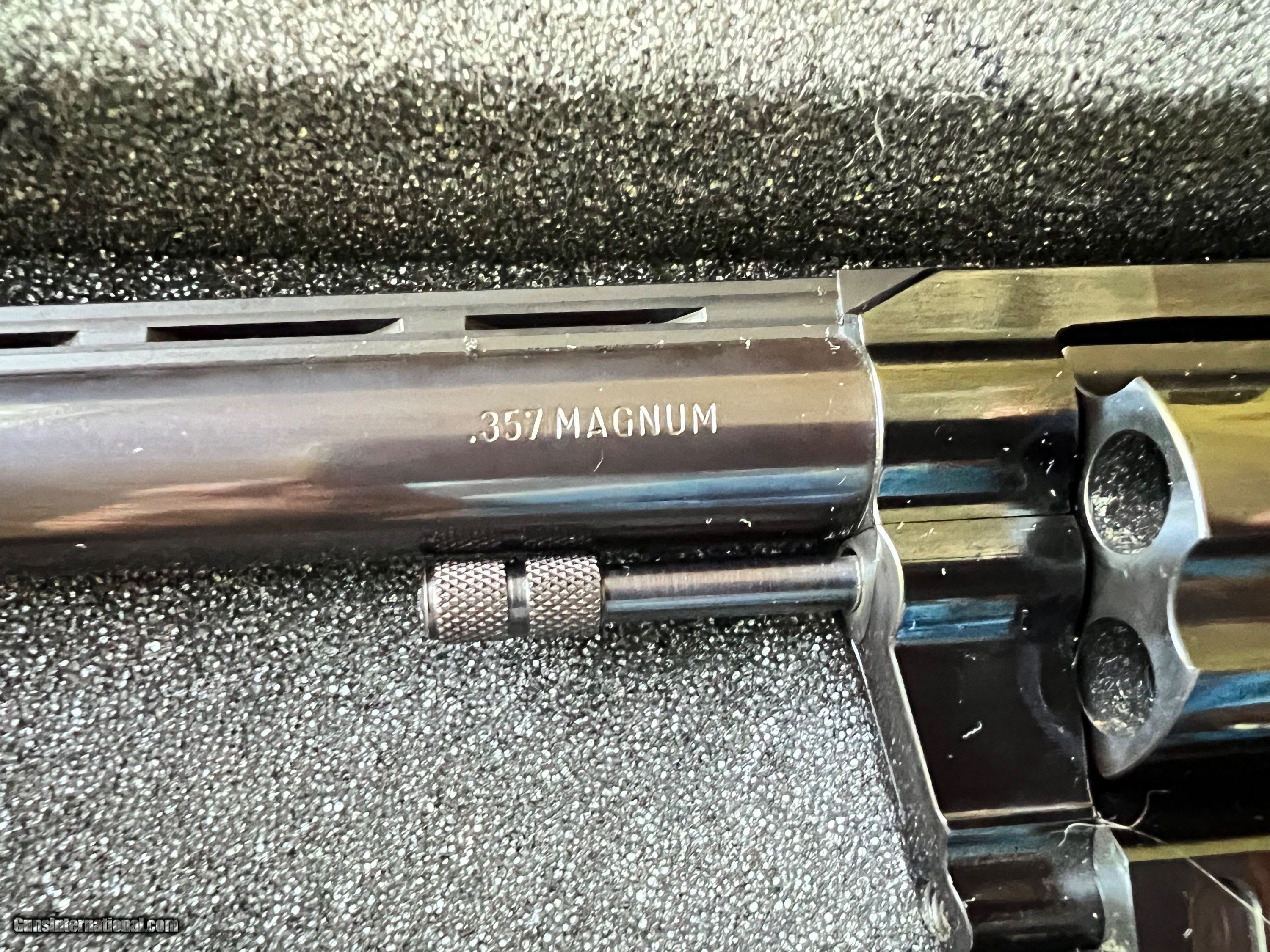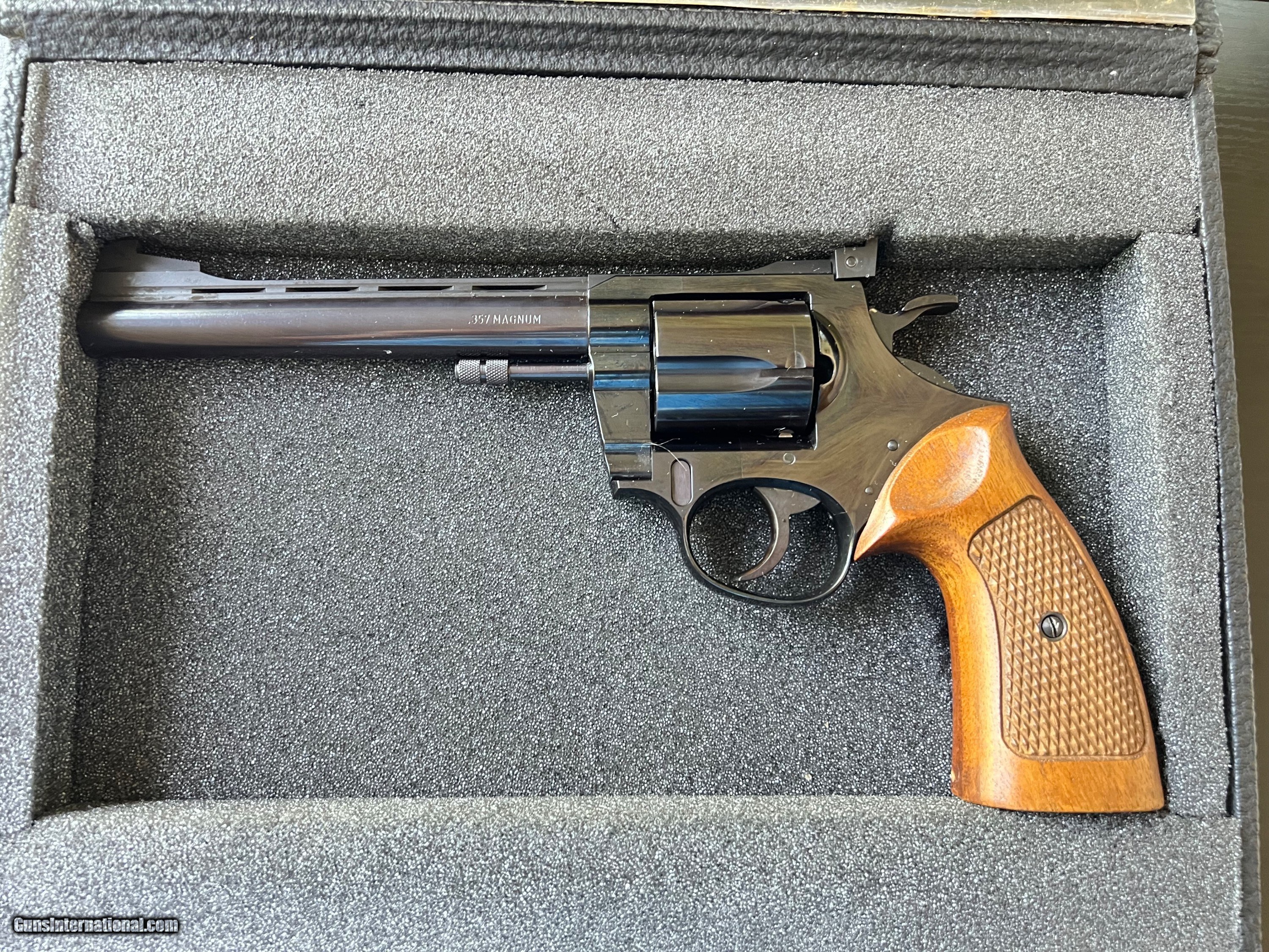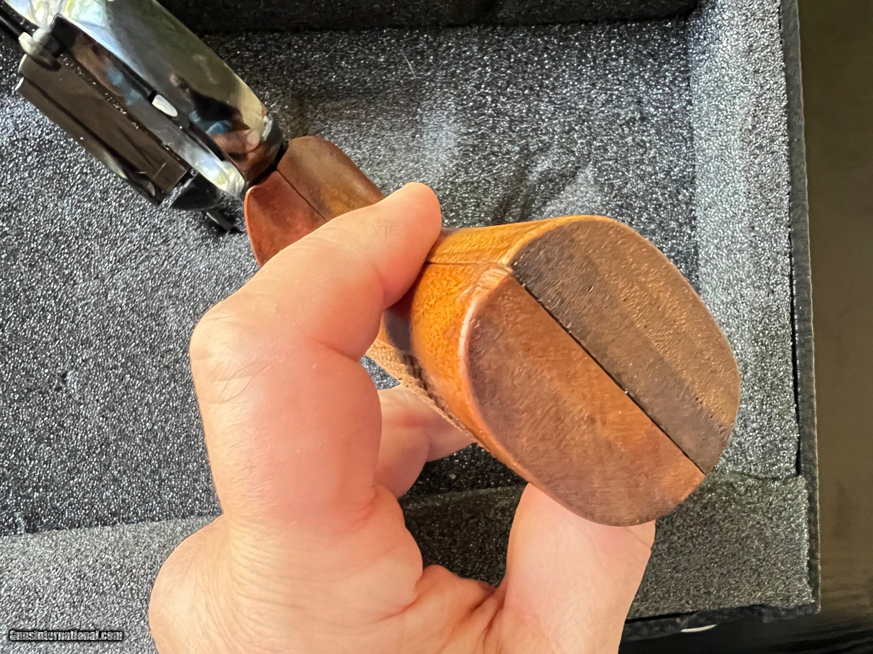 Description: This is a mint example of an early Korth .357 magnum revolver, made in 1966. It is in near new condition, with mint bore, with just a hint of turn line on the cylinder, a tiny spot of wear on the rear strap towards the bottom and a tiny nick on the front lower corner of one grip. The gun is NOT import marked and has a mint bore and a superb deep blueing throughout. It has an adjustable rear sight and unbelievably smooth action. It is West German proofed and dated 1966 on the right side of the barrel. Revolves made by Willie Korth in 1960s and 1970s were unmatched in quality by any other contemporary manufacturer. The guns were made from a solid steel forging and had a patented cylinder release. They are considered to be a pinnacle of modem revolver design. Any wear that you might see on the finish is just light reflection and oil. There is no wear other than whta was mentioned in the description. Enclosed in a period (factory?)leatherette carry case, this gun would be impossible to upgrade. 3-day inspection. FFL or C&R(where allowed) $75 insured shipping in CONUS. SOLD Curio/Relic: Yes |