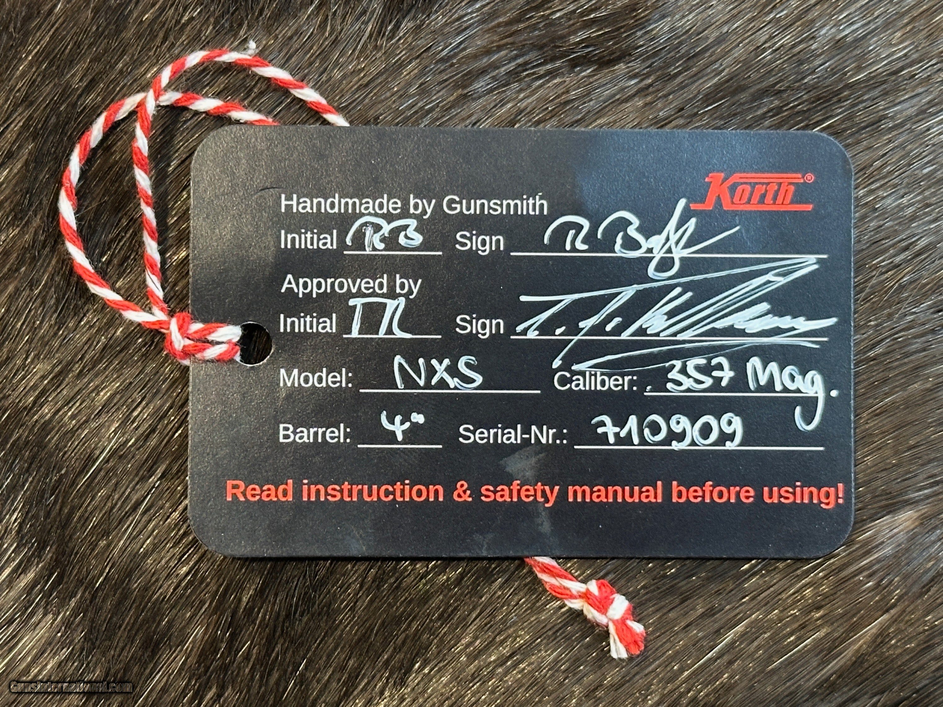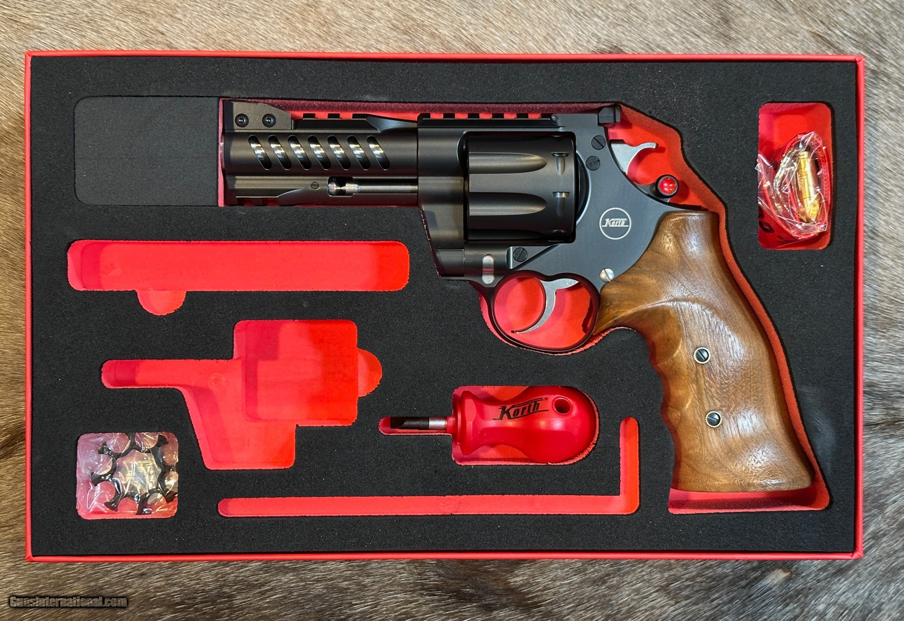 Description: NEW KORTH NXS 4" 8-SHOT 357 MAGNUM REVOLVER, WOOD GRIPS LAYAWAY AVAILABLE: $1,000 DOWN AND 6-MONTHS TO PAY OUT - TO BEGIN THE LAYAWAY, CONTACT JD AT 405/822.1564. The Korth NXS exemplifies the pinnacle of German engineering combined with high capacity. Its modern design features a ventilated barrel shroud for enhanced cooling and striking aesthetics. The frame includes a Picatinny rail, offering the versatility to mount a scope or red dot sight. Remarkably, the NXS introduces Korth's first 8-shot cylinder, designed to accommodate moon clips for unparalleled reloading speed. This NXS revolver comes with a 4" hammer-forged precision barrel and integrates Picatinny rails on both the top and bottom, enhancing its adaptability. Since 1954, Korth has been synonymous with the world’s finest revolvers, and the NXS continues this legacy. Its DLC finish ensures exceptional durability and complements the elegant Turkish walnut grips. The NXS features an adjustable rear sight paired with a 14k gold bead front sight for superior accuracy. For added versatility, it can be upgraded with an optional 9mm interchangeable cylinder (purchased separately). This revolver seamlessly blends functionality, durability, and aesthetic appeal, making it a standout choice for discerning enthusiasts. FEATURES OF THIS GREAT CUSTOM REVOLVER INCLUDE: