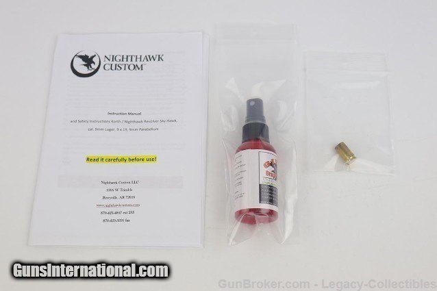 Description: This is one of the most desirable Korth revolvers to come to market in the last 20 years - a Korth-Nighthawk Skyhawk revolver chambered in 9mm Para. The biggest challenge in designing a revolver in 9mm Para is the difficulty in devising an extraction system that would work without the use of moon clips, as the 9mm Para cartridge is a rimless cartridge that sits completely inside the chamber. Korth of Germany was up to task and came up with a proprietary system of small individual extractors, that work in concert to extract all 6 chambers of the cylinder. Korth teamed up with Nighthawk industries to import these Sky Hawk revolvers into the US in the last 2 years. However the demand was so high that there was a 3 year order backlog at Nighthawk and now a total of 486 of these guns have been imported and sold in US with no more of these incredible revolvers to be imported in the future! Designed as an ultimate carry revolver, it has a 2 inch barrel and soft rounded lines to prevent snagging on the holster or clothes. The revolver is extremely light weight at 19.4 oz. The double action is like no other revolver action, thanks to the Korth proprietary trigger action and is apparently almost as crisp as the single action. The gun is brand new and unfired in original case, with paperwork and a test target. This is the most diminutive Korth made and is already a collector item with just a few hundred in existence in US. FFL required. Please read below for our FAQs and terms. If you require further information, please email all questions or comments, C&Rs / FFLs to: infolegacy-collectibles We accept all major credit cards (and don't charge for credit card fees), money orders, checks, and PayPal (for non-gun sales ONLY. Our PayPal email: infolegacy-collectibles) Call 610-981-6041 to speak to a sales representative for questions or payment information. Please email or call us if you have any special shipping/checkout requests or updates! Please note, it is YOUR responsibility to contact your FFL (license holder) and have them send us (email or fax) a copy of their license. -Items have a 3 day inspection period. This period is non-firing. If the item you ordered is not what you expected, please call us and arrange to send it back. We will refund the purchase cost plus the shipping to you via company check. You pay for shipping back to us for the return. -We do not fire the weapons we have listed for , and we generally have no way of knowing how many rounds have been through them. Once an has a bid, we cannot alter it in any way. This means that there are no 'buy now' price options, and you will have to win the to obtain the item. -LAYAWAY: We do offer a 90-day layaway option on purchases over $500. To take advantage of this feature, you must place 20% down of the final price, which is non-refundable. The remainder can be paid off any time within the 90-day period, though we ask for at least one payment per month. -OTHER INFORMATION: Additional pictures are available upon request, please specify areas of interest. There is no sales tax except for Pennsylvania residents. We do not charge extra for credit card purchases. All items represented in photos and/or mentioned in description are the only items being ed, thus if a box is not mentioned/pictured, then the pistol does not come with a box. SOLD Manufacturer: Korth Model: Skyhawk Caliber Info: 9mm Bore: Mint Condition: Mint |