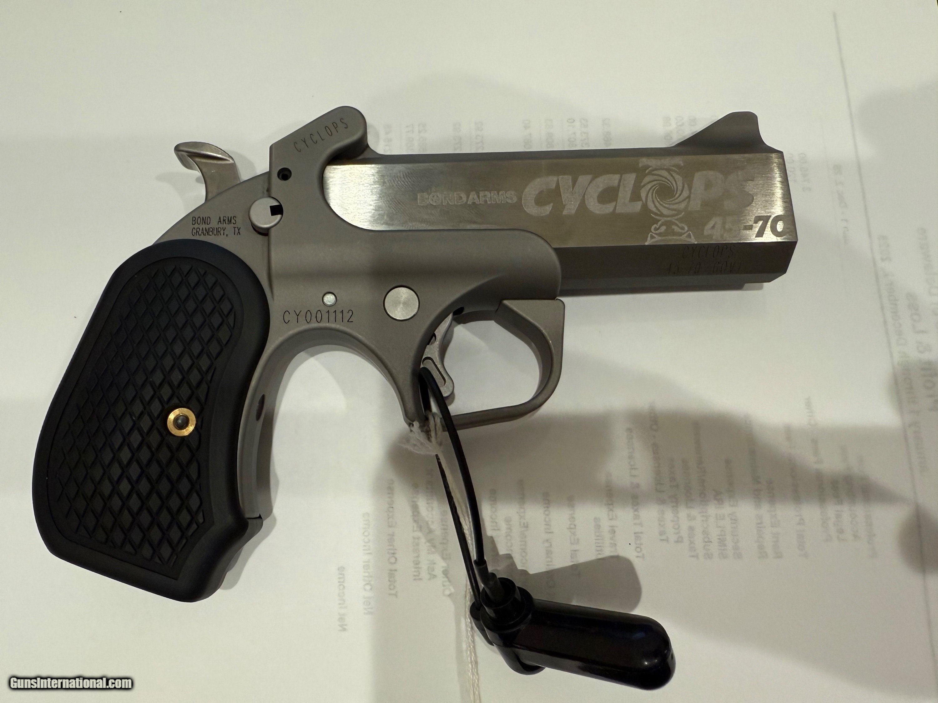 Description: Bond Arms Cyclops 45-70 Single Shot! New in Box. 399.99 plus 20.00 to ship. Only FSFA aka The GunShop! Handgun Caliber: .45-70 Manufacturer: Bond Arms Model: Cyclops Condition: New Price: $399.99 Shipping: $20.00 Contact Seller |