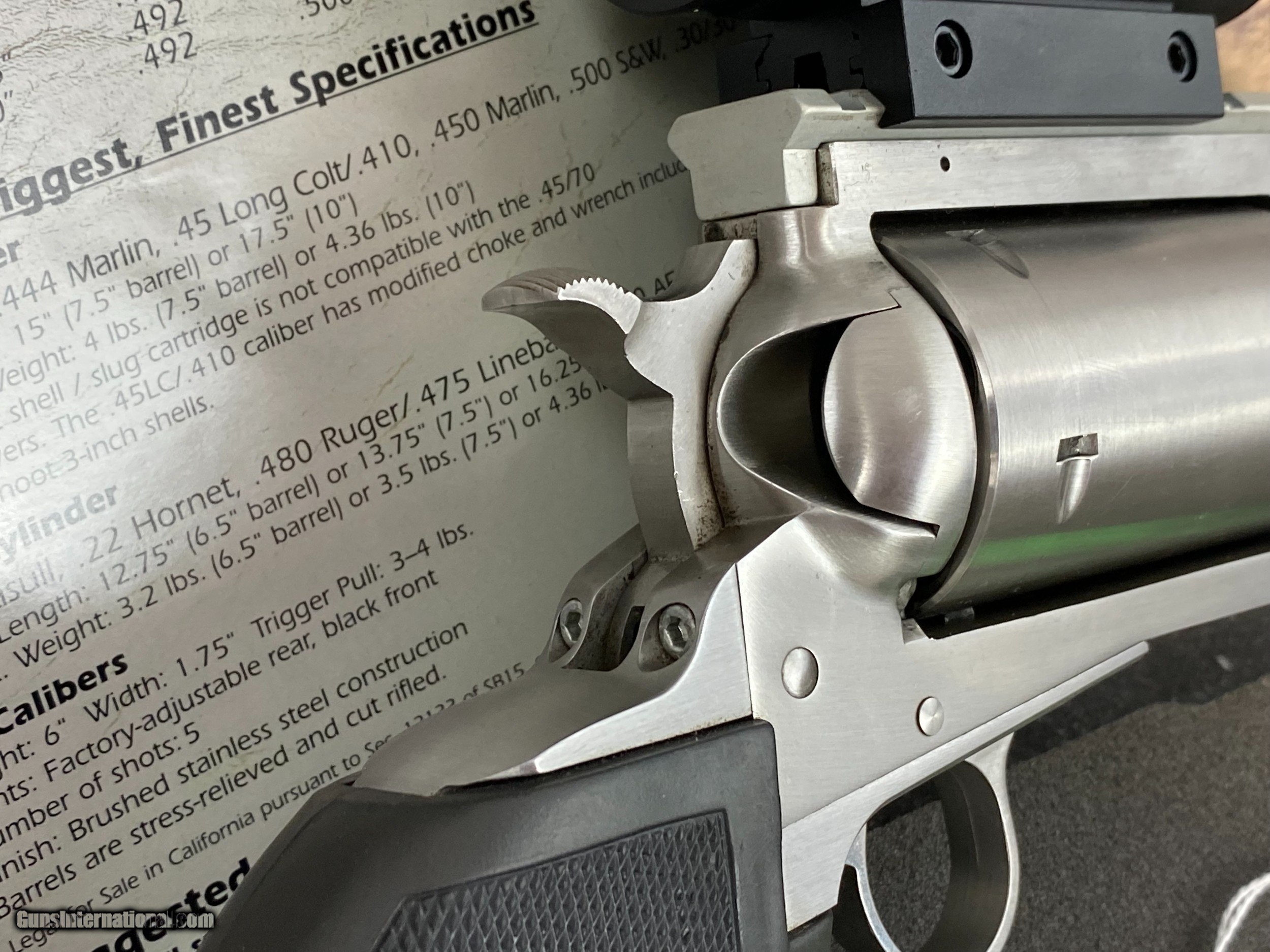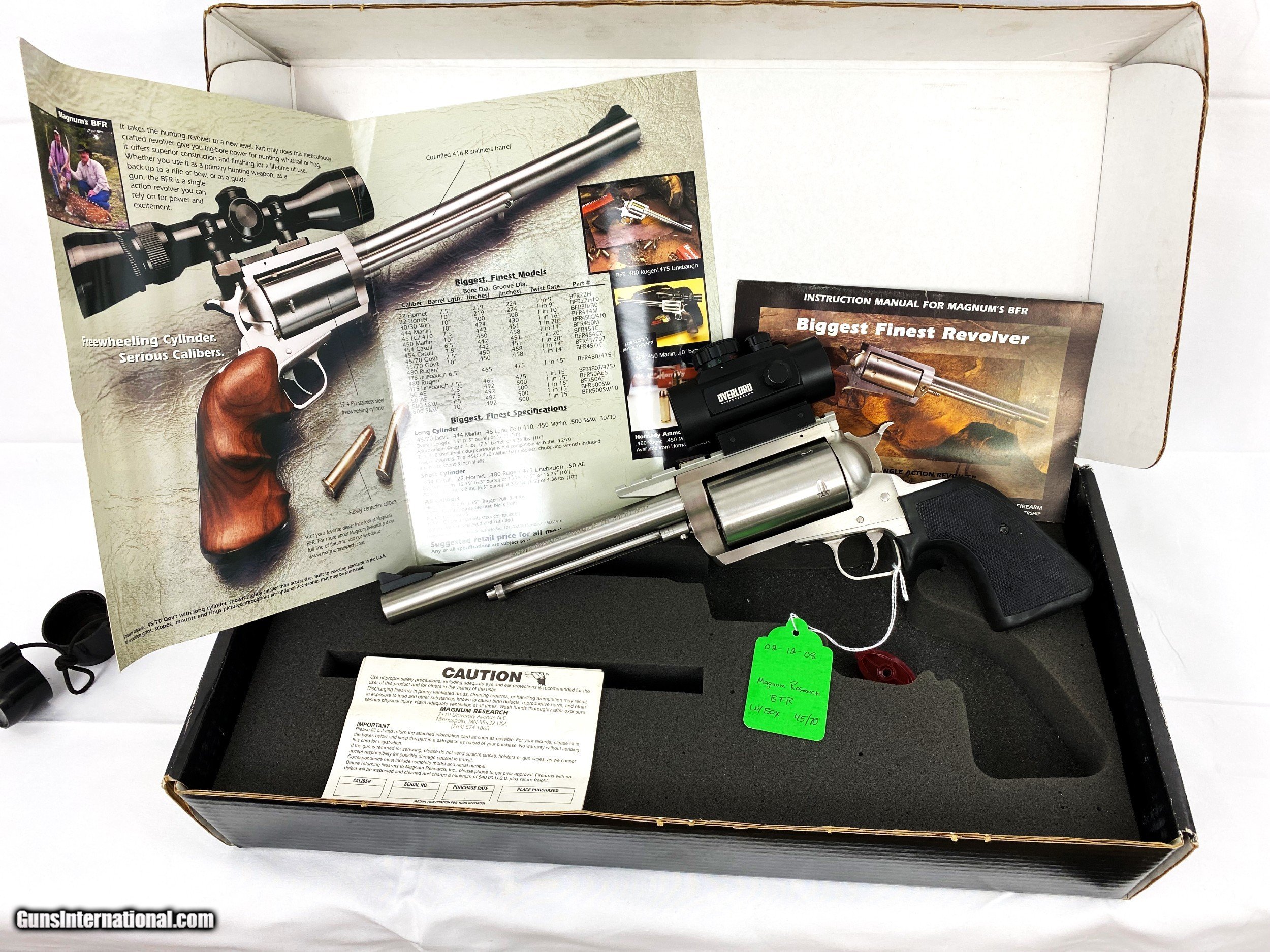 Description: Magnum Research BFR (Biggest Finest Revolver) chambered in the impressive 45-70 gov round. Comes with scope rail installed and an Overlord Red / Green dot sight. This revolver is slightly used it comes with the original box and paperwork shown. This has the smothest cylender I have seen on a revolver to date. Nice crisp trigger pull. Guaranteed to be a handful of fun. Maine Residents add 5.5% Sales Tax Price reflects a cash discount of 3.5% SOLD Manufacturer: Magnum Research Model: BFR Serial Number: 45/70 gov Barrel Length: 8-1/4 Condition: excellent Metal Condition: Excellent Wood Condition: Excellent Bore Condition: Excellent Action: Single action Finish: Stainless Item Location: Buxton Maine |