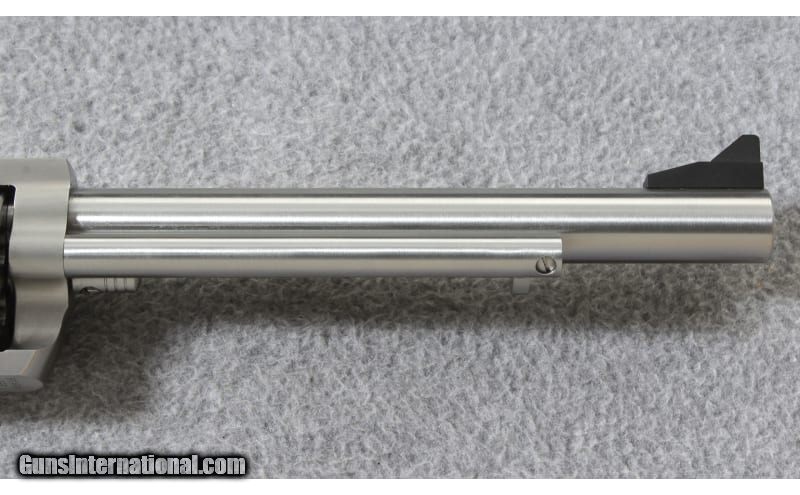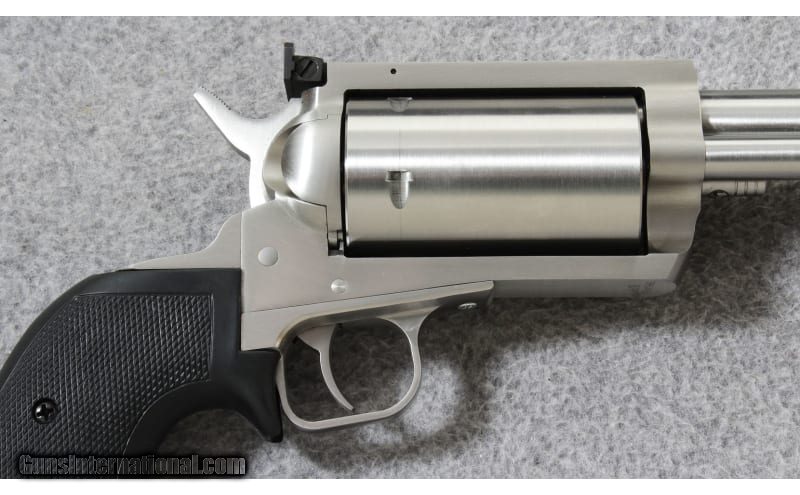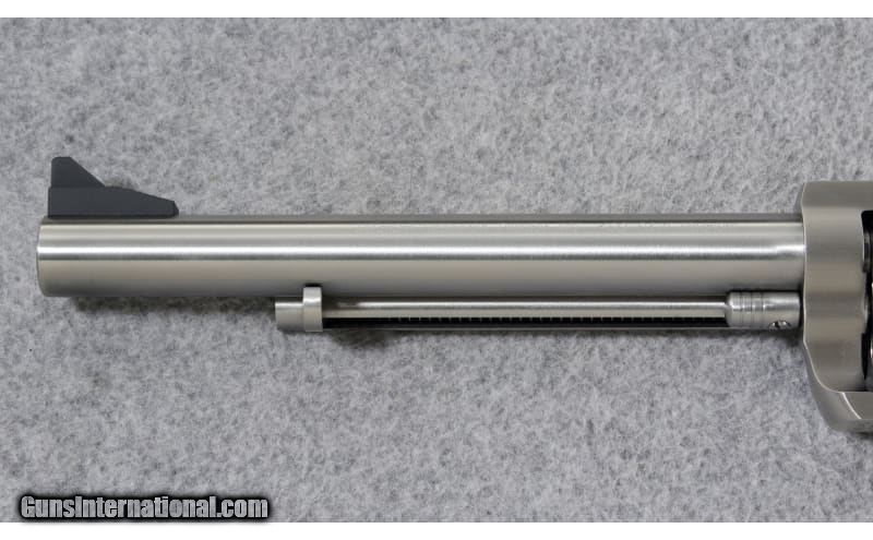 Description: The Magnum Research® BFR Single-Action Revolver with Long Cylinder delivers robust firepower from an ultrareliable, single-action revolver. The entire BFR is constructed out of stainless steel, except for the rubber grips. The barrel has cut rifling, which is compatible with either jacketed or lead-cast bullets. The counter-bored, unfluted, 5-shot cylinder features a free-spin pawl and unlocks by opening the loading gate. A transfer bar safety system allows safe carry in the field with all 5 cylinders loaded. A ramp front sight and adjustable rear sight furnish a fine sight picture for accurate shooting, yet do not interfere when drawing the gun from a holster. The beefy top strap comes drilled and tapped for a scope base. The Magnum Research BFR Single-Action Revolver is a great handgun for hunting big game, long-range shooting, or for carry in the backcountry. .460 S&W Magnum SOLD Metal Condition: Excellent with a turn line on the barrel Bore Condition: Excellent Barrels: 8 inch barrel Triggers: Single Action Weight: 72 Oz. Sights: Adjustable rear sight with blade front Item Location: Lehi, UT |