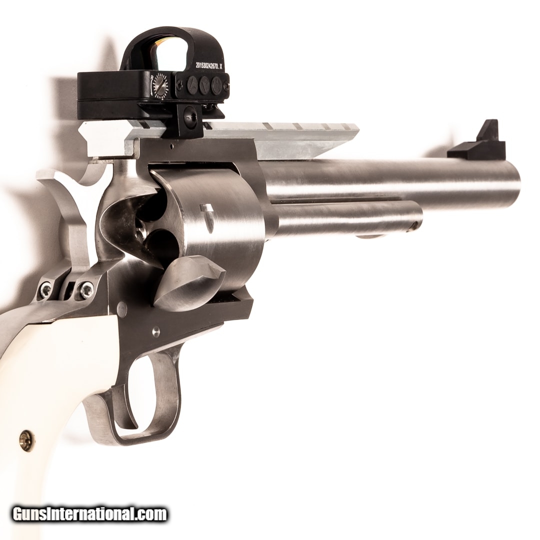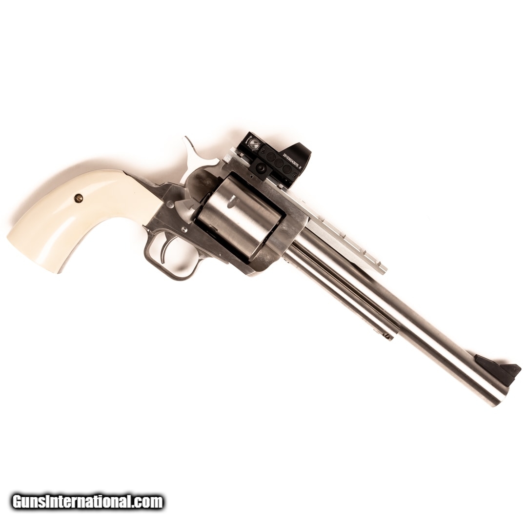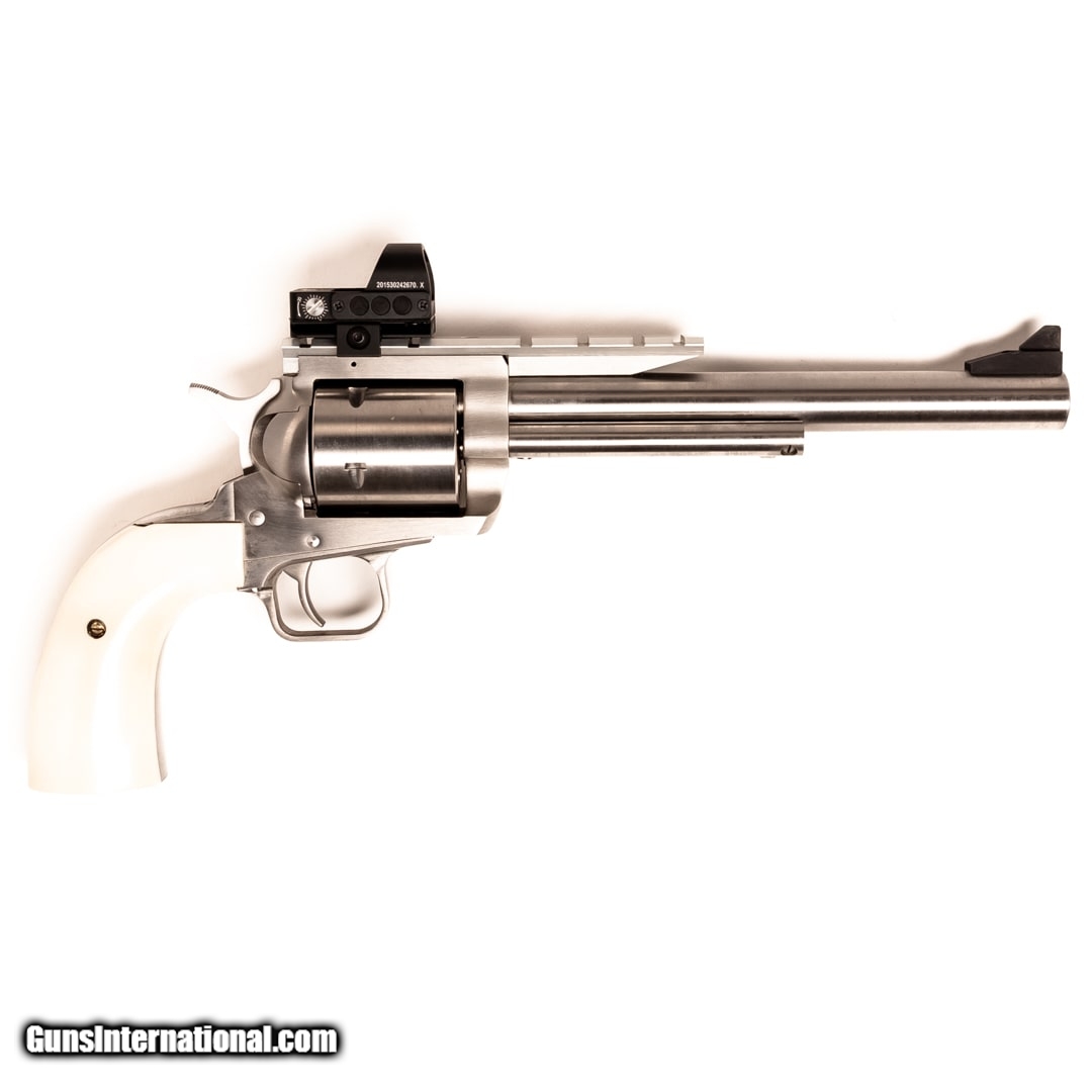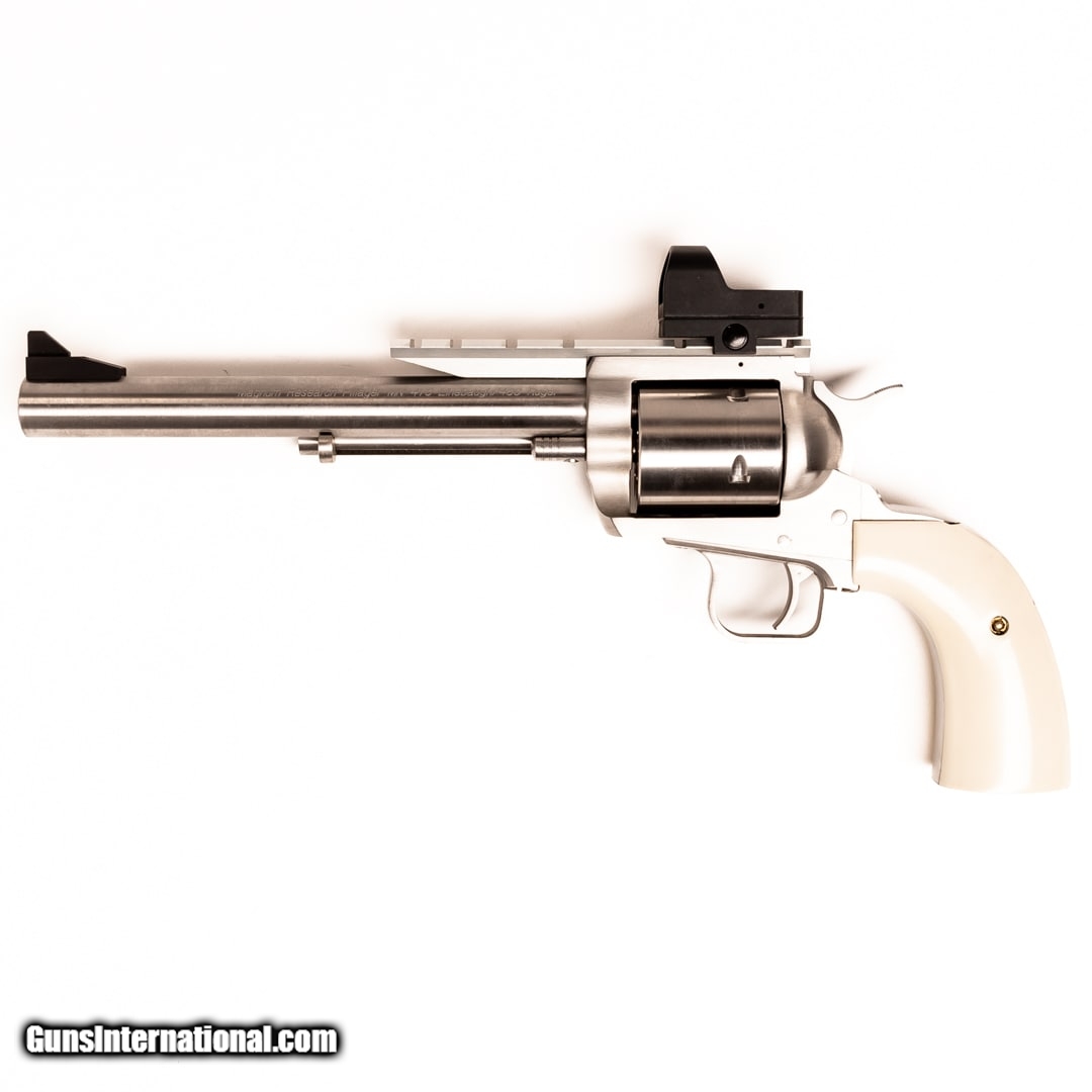 Description: Guns Listing ID: 651413 The Magnum Research BFR is a large caliber revolver. While the acronym is often thought to be “Big Freaking Revolver”, it actually stands for “Biggest Finest Revolver”. Capable of handling large rifle calibers, this revolver offers more power than any other revolver on the market. There is a mini red dot included. SOLD Manufacturer: MAGNUM RESEARCH Model: BFR Caliber Info: .480 RUGER Condition: Used - Certified Barrels: 8.1 barrel Finish: STAINLESS |