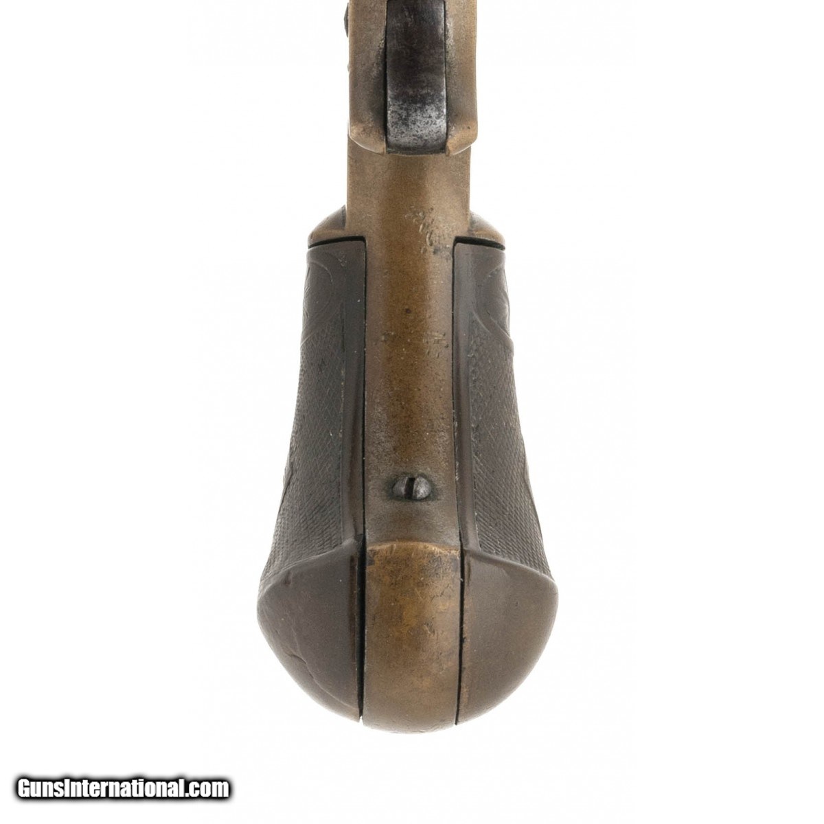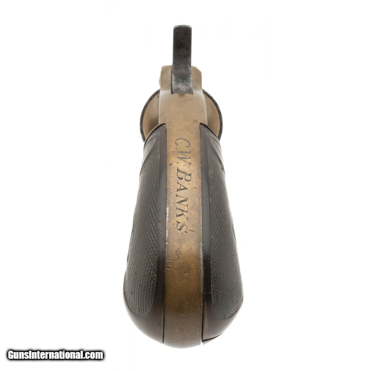 Description: "Serial number 9538. Made circa 1873-1876. 30RF caliber with a 3" barrel. The metal has a mottled gray patina with some pitting. The left hand side of the plate has a spurious Wells Fargo inscription. The back strap is inscribed “C. W. Banks" which is a correct period inscription. SOLD Antique: Yes |