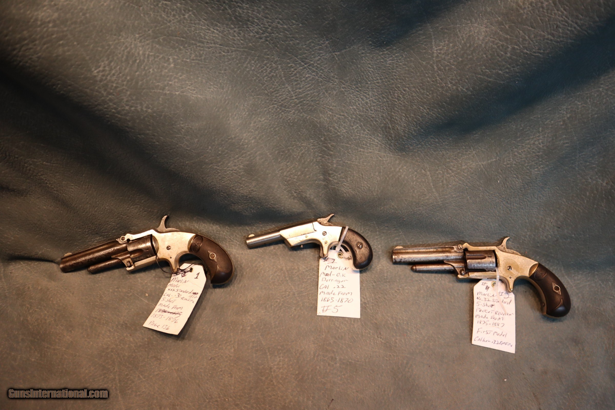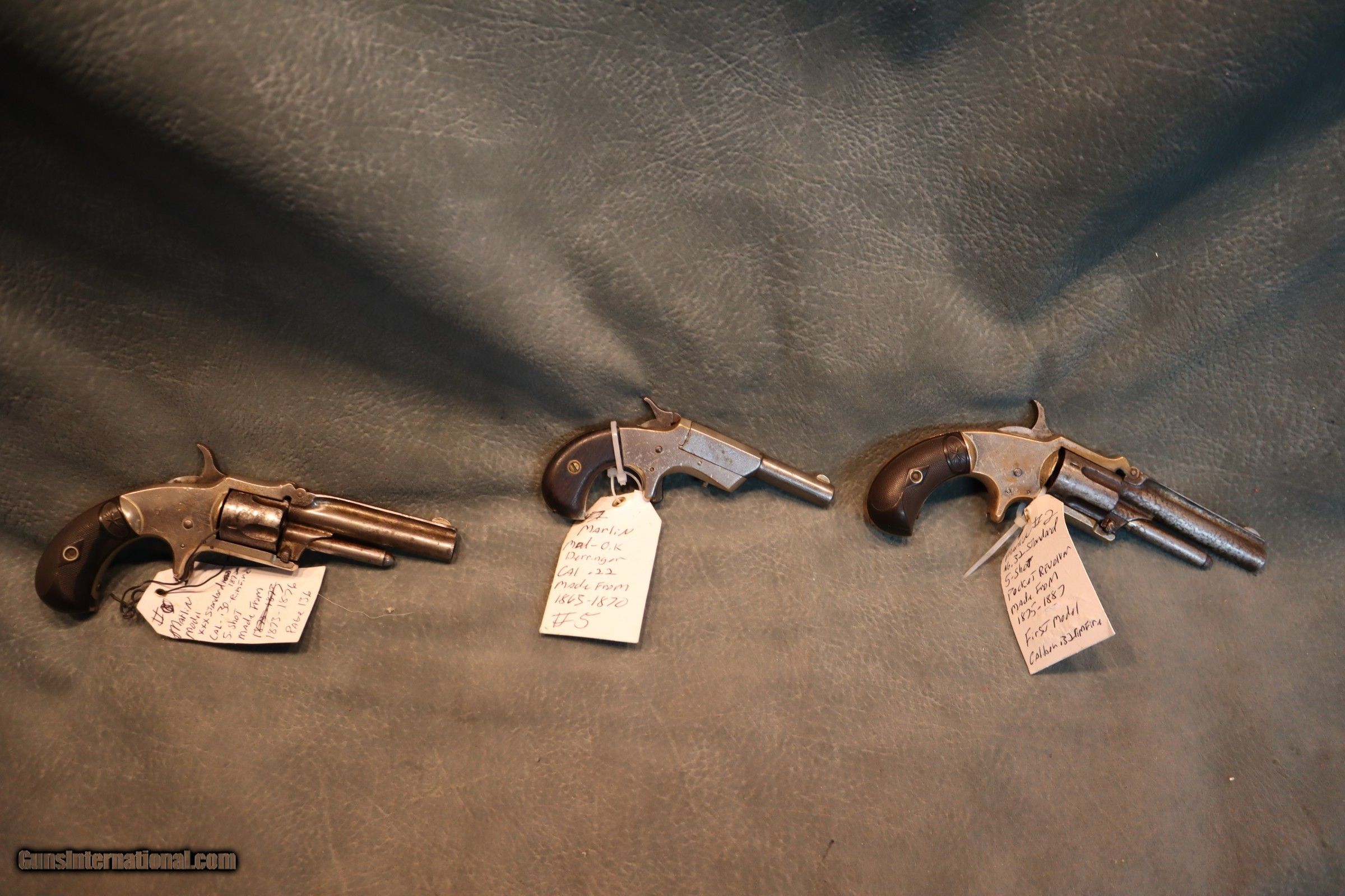 Description: 3 Antique Marlin Pistols XXX Standard,32 Standard pocket revolver,Gem OK Derringer,$795 for all 3. GUN COLLECTIONS WANTED FOR CASH! We buy, sell, consign and trade new and used firearms.We will pay finders fees and travel for large collections. This is our 47th year in business. We offer 90 day layaways with 20% down. No return on layaways. Firearms will need to be transferred through a FFL dealer. Prices reflect a cash discount. There will be 3% added to credit card sales. We trade for gold and silver. THANK YOU! SOLD |