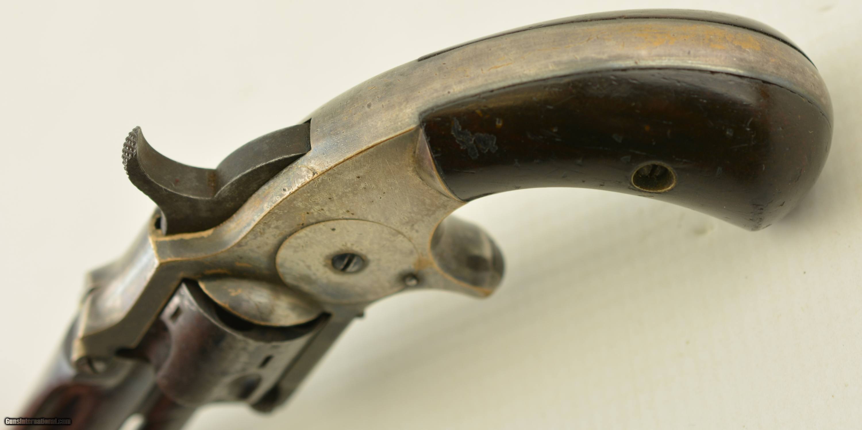 Description: Serial #9799, .30 RF, 3" barrel with a fair bore that has dark freckling within the grooves. This revolver has matching numbers on the frame, cylinder, and barrel with about 30-40% of the bright original blue on the barrel and traces remaining on the cylinder. The balance of the metal has turned to a mild plum-brown patina and there is some gray fading along the exposed edges and projections. The frame retains about 90% of the original silver plate that was cleaned at some point but is starting to reacquire a mellow blue-black patina. The rosewood grips are numbered to the gun on the interior and are in fine shape with only some minor handling marks and small blemishes on either side. The lock-up is tight, there is no lateral play in the barrel, and the mechanism is fully functional. Antique SOLD Antique: Yes Manufacturer: Marlin Model: 1872 Serial Number: 9799 Caliber Info: .30RF Gauge Info: .30RF |