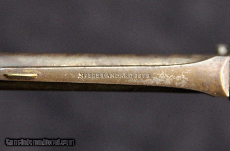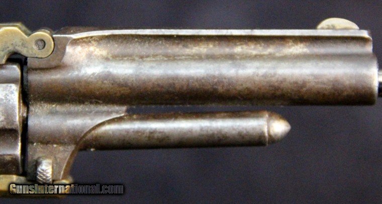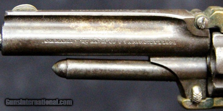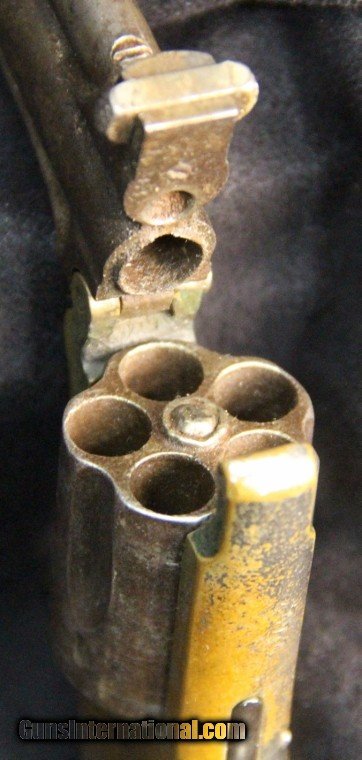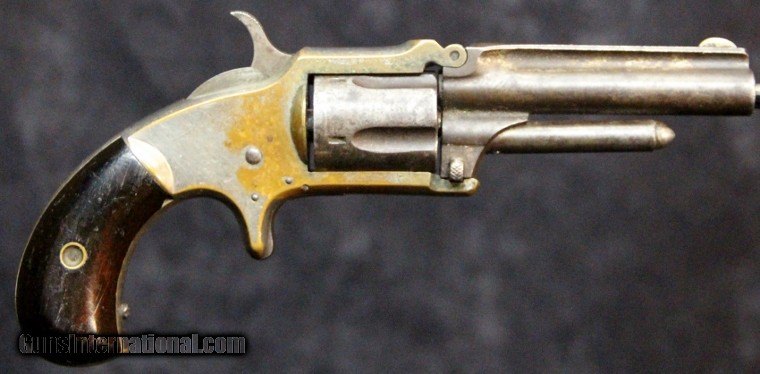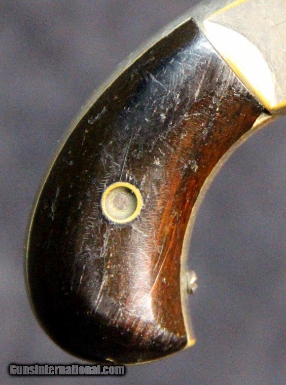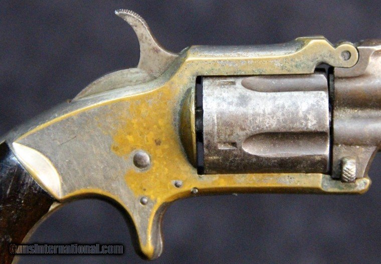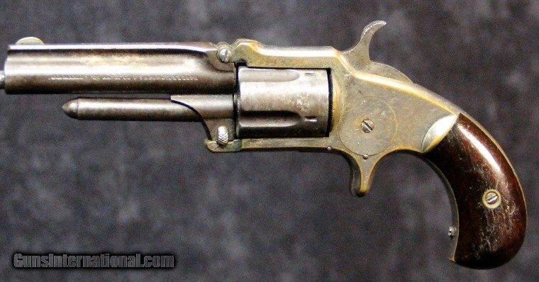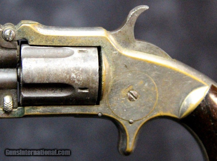 Description: .32rf, long, NVSN, 3 inch barrel, blue barrel, silver plated brass frame, 2 piece rosewood grips, circa late 1870's. Condition: good bore, barrel and cylinder mottled silver/plum, 60% silver plate on frame, excellent grips, hinge is loose, mechanically very good, very good marks. SOLD Antique: Yes |