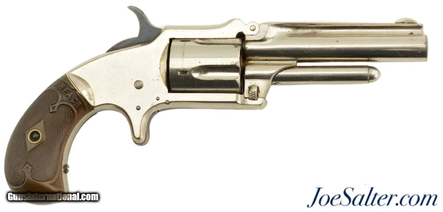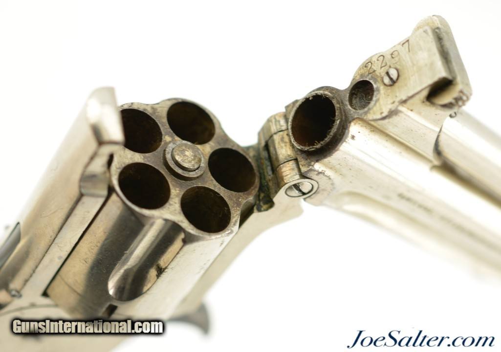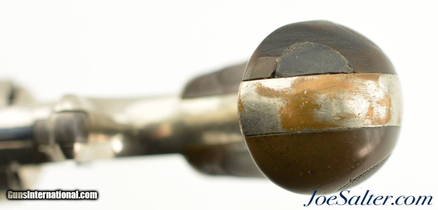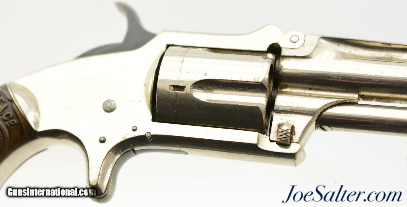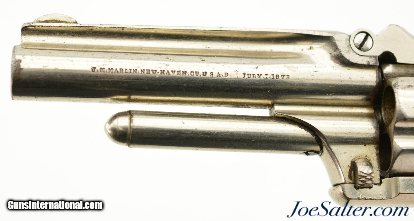 Description: Serial #2297, .32 RF Long, 3" barrel with a very good, bright bore that has a few spots of dark freckling along its length. This is a 2nd type revolver, with matching numbers on the frame, barrel, and cylinder, and the later type hard rubber grips. The metal retains 90-95% of the original nickel plate finish that has a few tiny dark spots scattered about, as well as some exposed underlying brass at the butt of the grip. The hammer and spur trigger retain some of their original blue finish, with the balance turned to a blue-brown patina with some mild freckling present as well. The "M.F.A. Co." marked hard rubber grips are in good shape with minor surface wear, and a chip at the butt on the left panel that has been filled. The barrel lock-up is still tight, and there is a tiny amount of lateral play, but the action is fully functional. This is a very nice, well-preserved example of a scarce Marlin revolver, and would make a great addition to any collection. Antique; SOLD Antique: Yes |