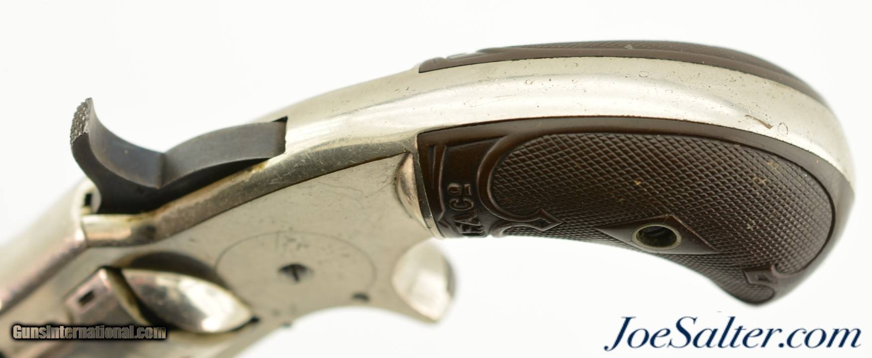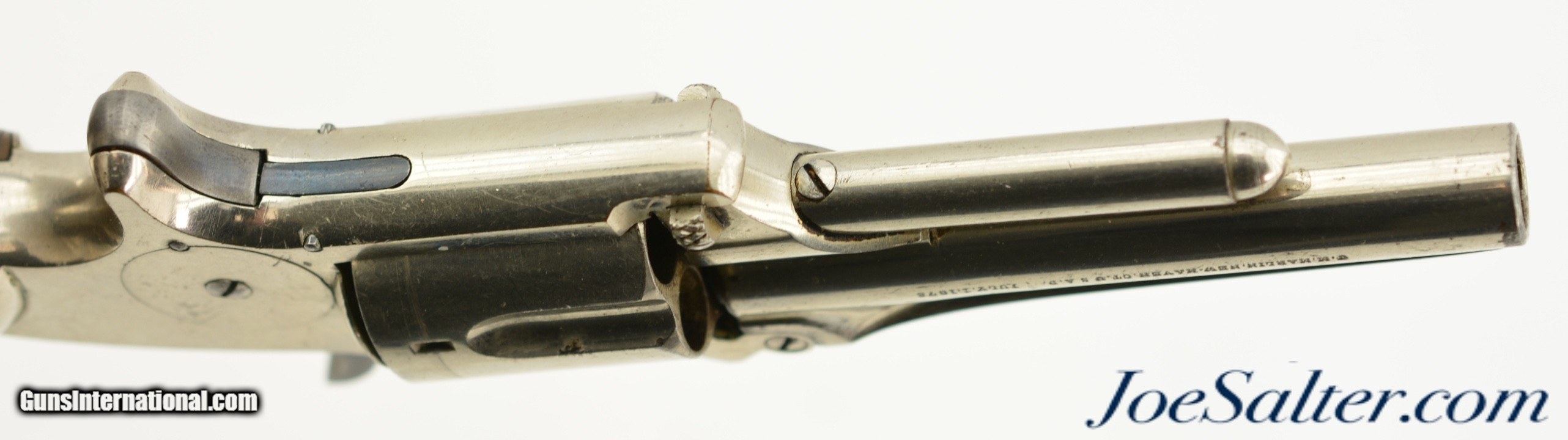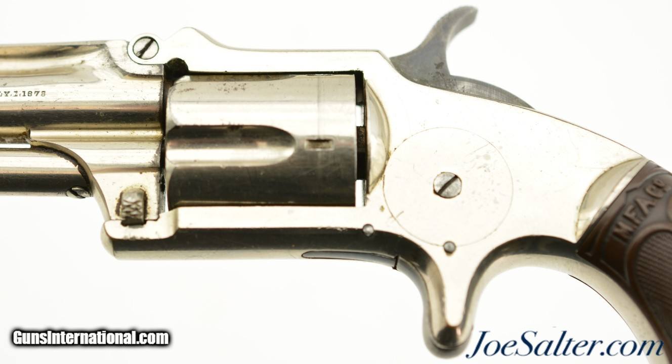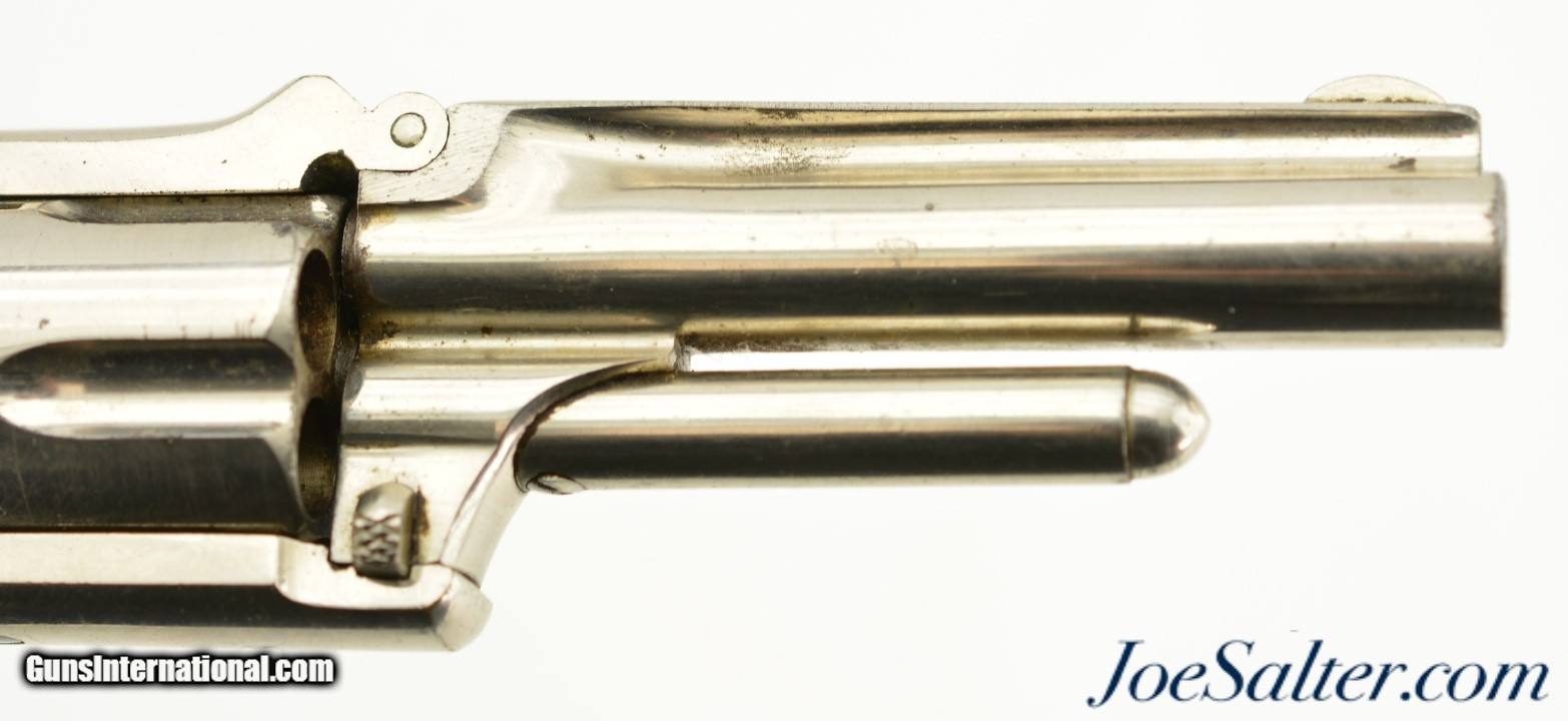 Description: Serial #2297, .32 RF Long, 3" barrel with a very good, bright bore that has a few spots of dark freckling along its length. This is a 2nd type revolver, with matching numbers on the frame, barrel, and cylinder, and the later type hard rubber grips. The metal retains 90-95% of the original nickel plate finish that has a few tiny dark spots scattered about, as well as some exposed underlying brass at the butt of the grip. The hammer and spur trigger retain some of their original blue finish, with the balance turned to a blue-brown patina with some mild freckling present as well. The "M.F.A. Co." marked hard rubber grips are in good shape with minor surface wear, and a chip at the butt on the left panel that has been filled. The barrel lock-up is still tight, and there is a tiny amount of lateral play, but the action is fully functional. This is a very nice, well-preserved example of a scarce Marlin revolver, and would make a great addition to any collection. Antique; SOLD Antique: Yes |