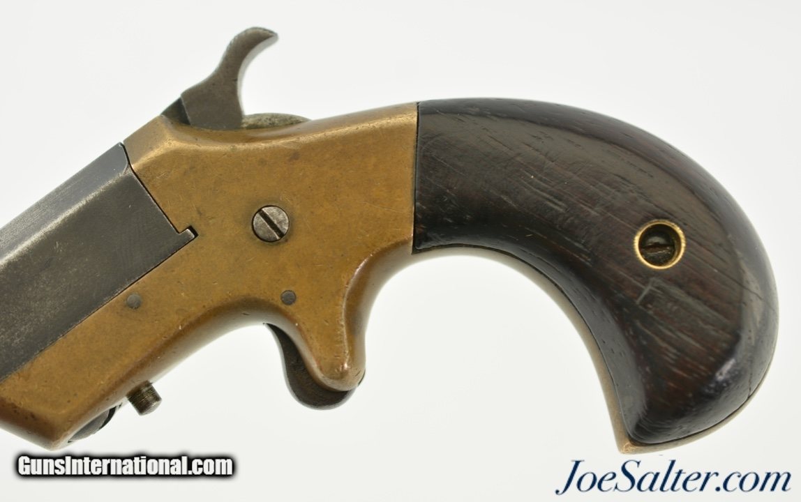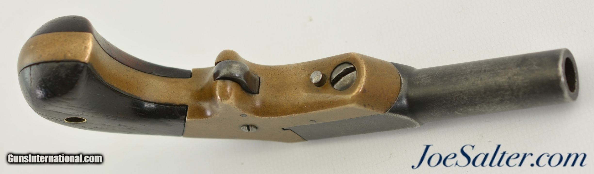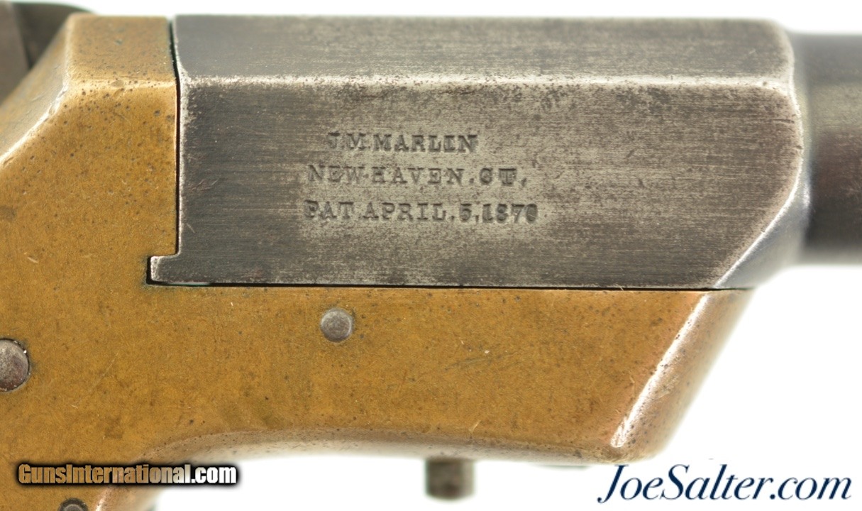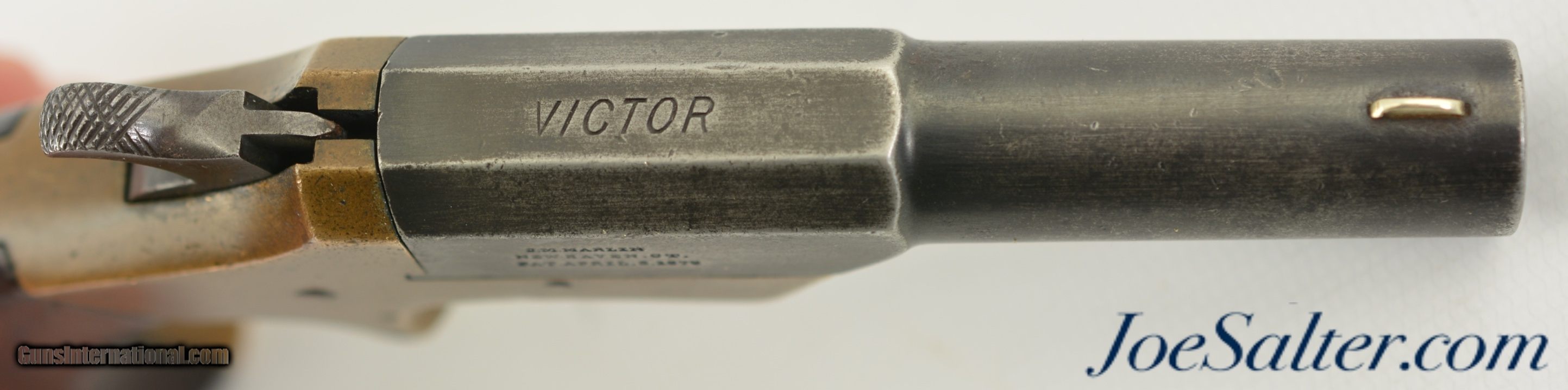 Description: Serial #13898, 3 1/4" barrel with a dark, lightly pitted bore with rifling still visible. This is a rare Victor model manufactured by Marlin between 1870-1881 with a part octagon / part round barrel that swings sideways for loading. Flayderman's guide and Brophy's Marlin book only list this model with 2 & 11/16" barrel making this an unusual longer barrel model. A rare gun to begin with, estimated total production was under 2000, this one has an uncataloged longer barrel. The gun is in fine to near excellent condition with over half of the original blue finish on the barrel that has faded to a mottled pewter gray with sharp lettering "J.M. MARLIN/NEW HAVEN. CT./PAT. APRIL.5. 1870" on the side and "VICTOR" on the top with several small nicks and use marks. The brass frame has a pleasing dark patina also with small scattered use marks and nicks and the original rosewood grips are excellent with several small hairline cracks running with the grain. Mechanically the functions properly with only a slight bit of lateral play in the barrel when locked into position. A really nice example of a very rare gun. Antique; SOLD Antique: Yes |