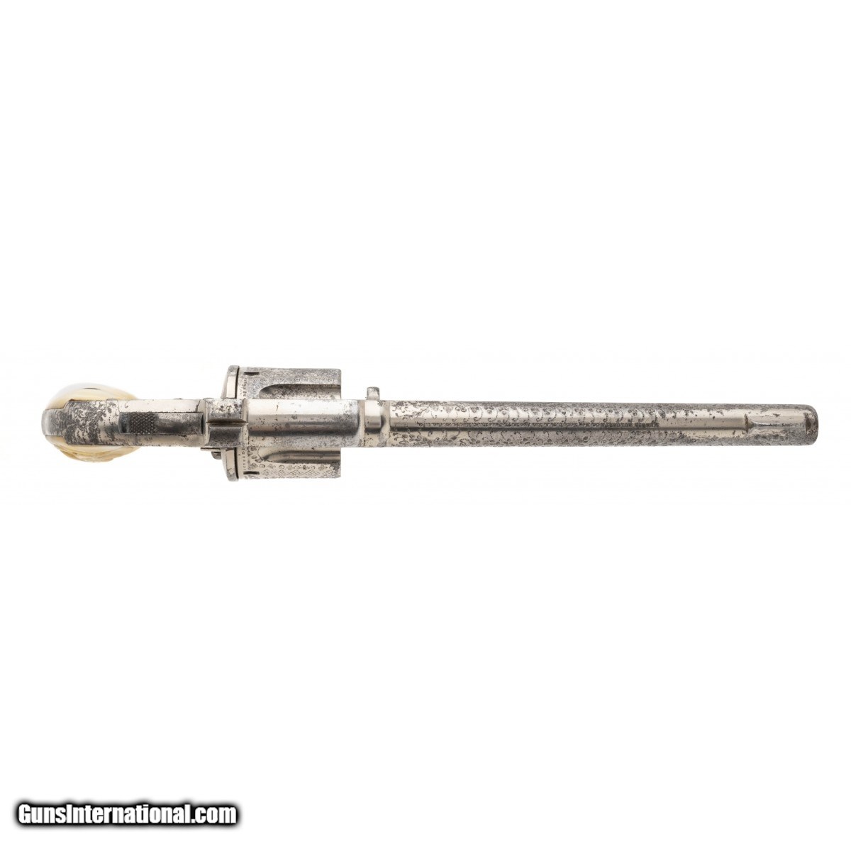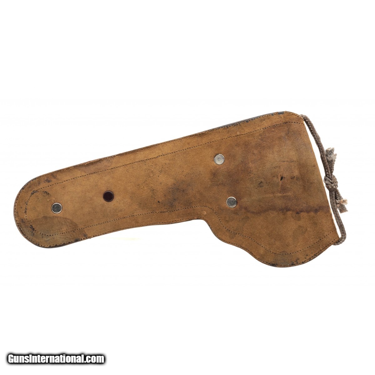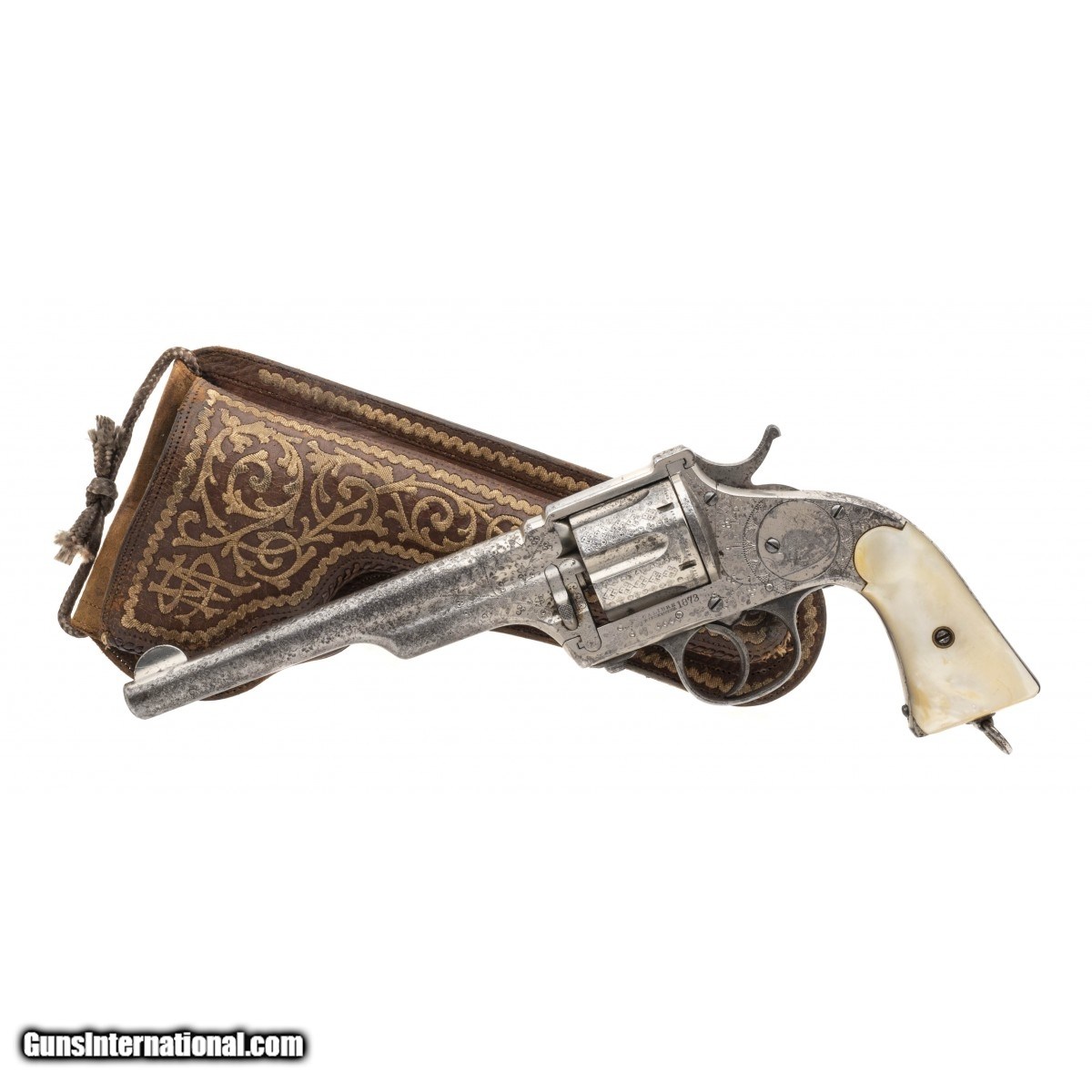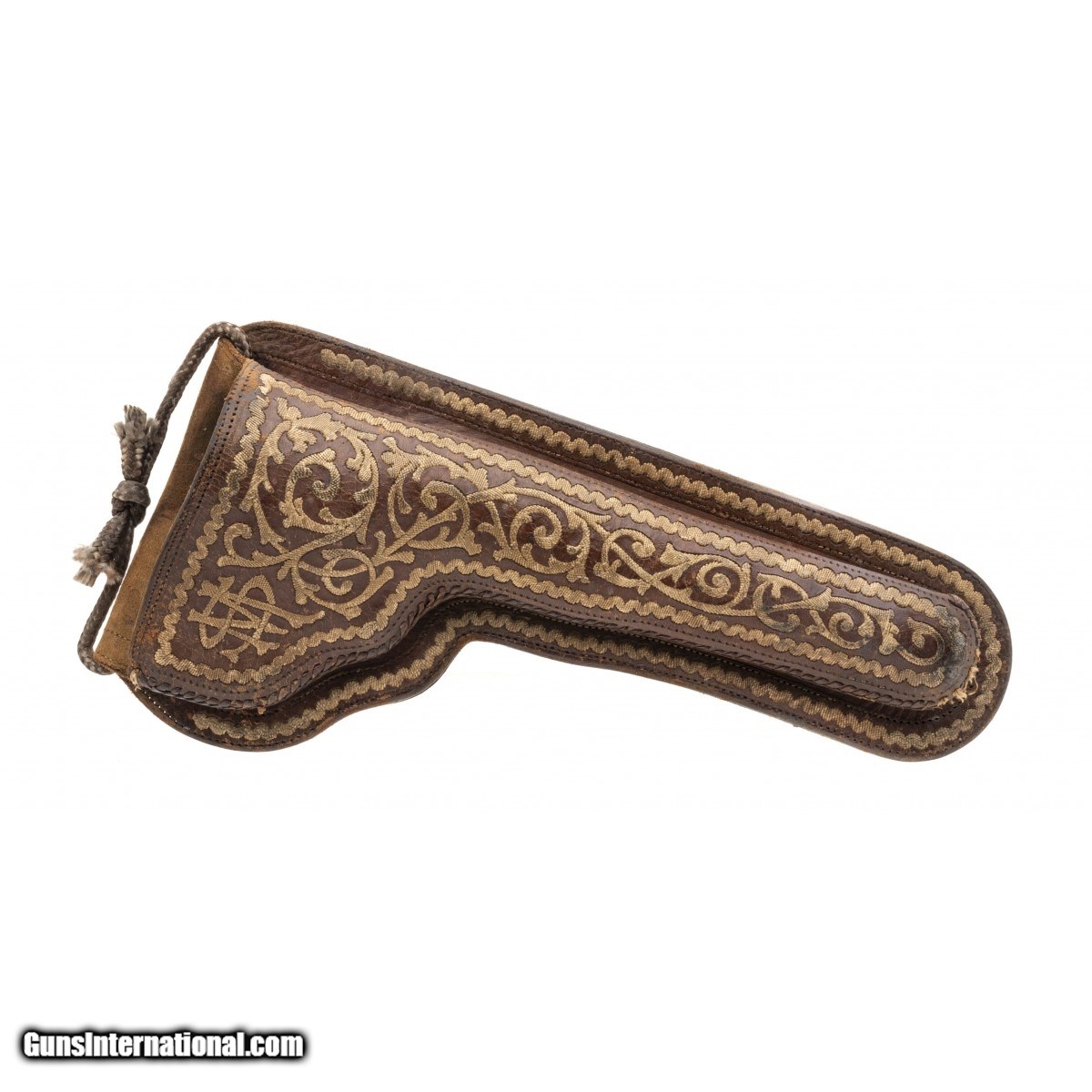 Description: "Serial number 19254. Made circa 1870s. 44-40 caliber with a 7" barrel. This gun is in very fine condition with over 50% of the original finish. The left hand side of the frame has a vignette of a bull. The grips are two piece pearls with a Mexican eagle and snake on the right hand side. The piteado holster is very fine. (Consignment) SOLD Antique: Yes |
