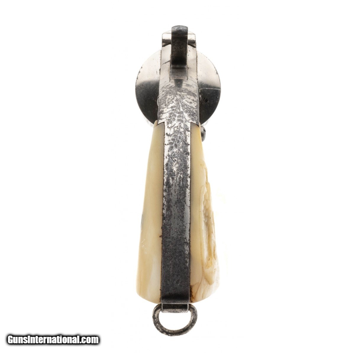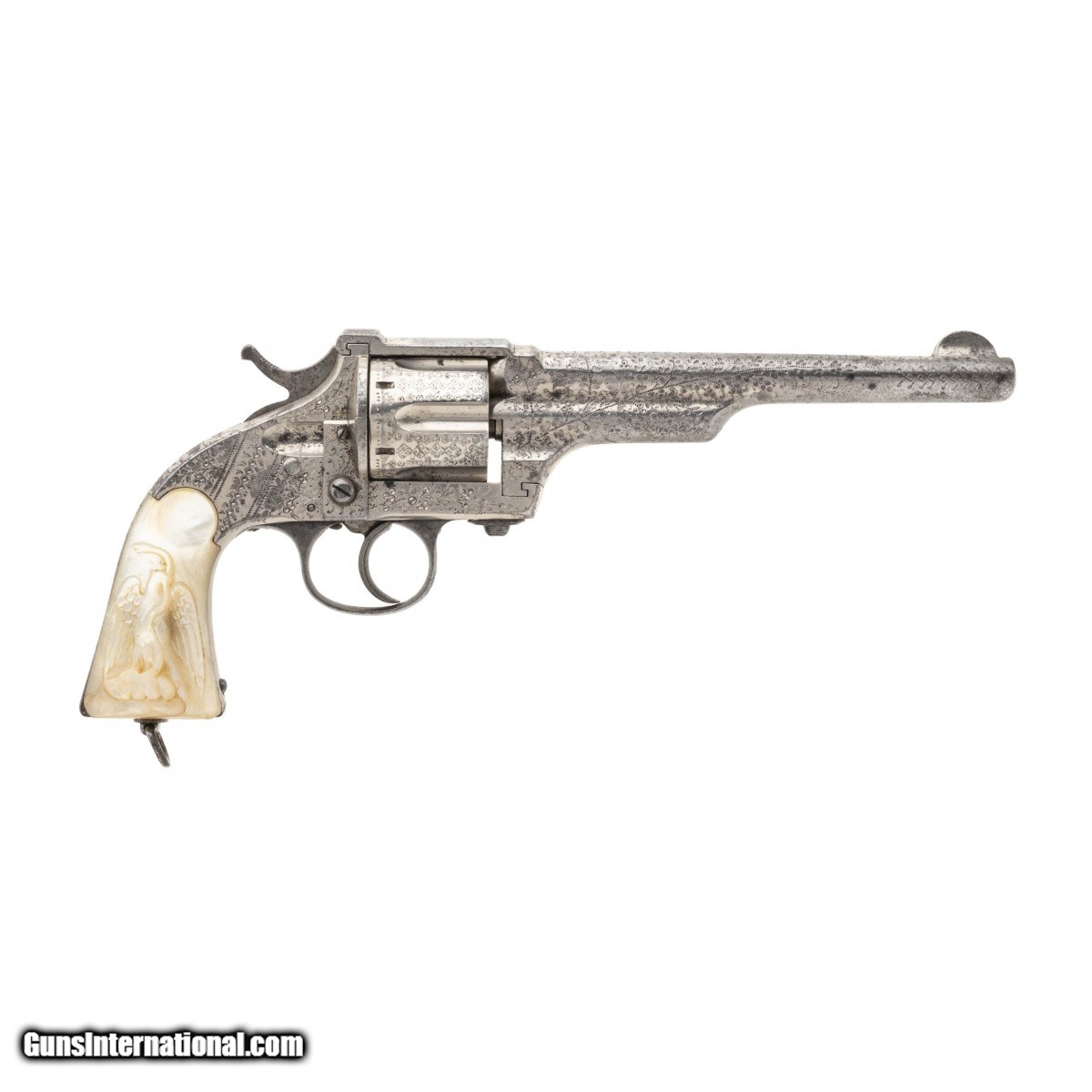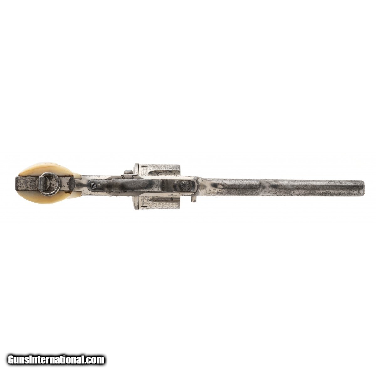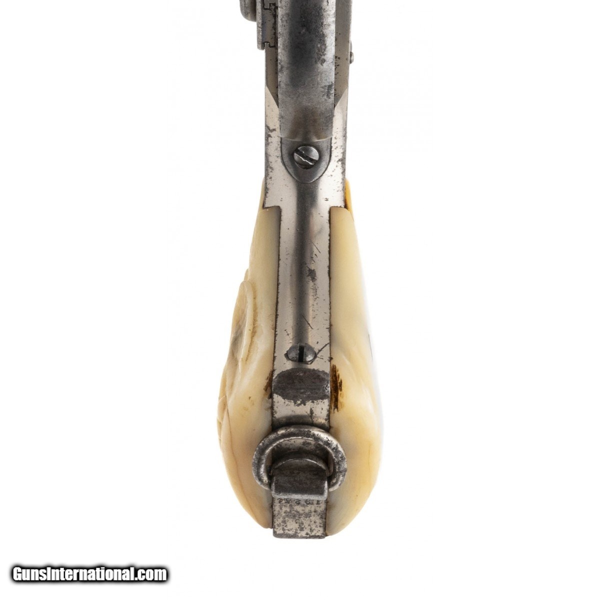 Description: "Serial number 19254. Made circa 1870s. 44-40 caliber with a 7" barrel. This gun is in very fine condition with over 50% of the original finish. The left hand side of the frame has a vignette of a bull. The grips are two piece pearls with a Mexican eagle and snake on the right hand side. The piteado holster is very fine. (Consignment) SOLD Antique: Yes |