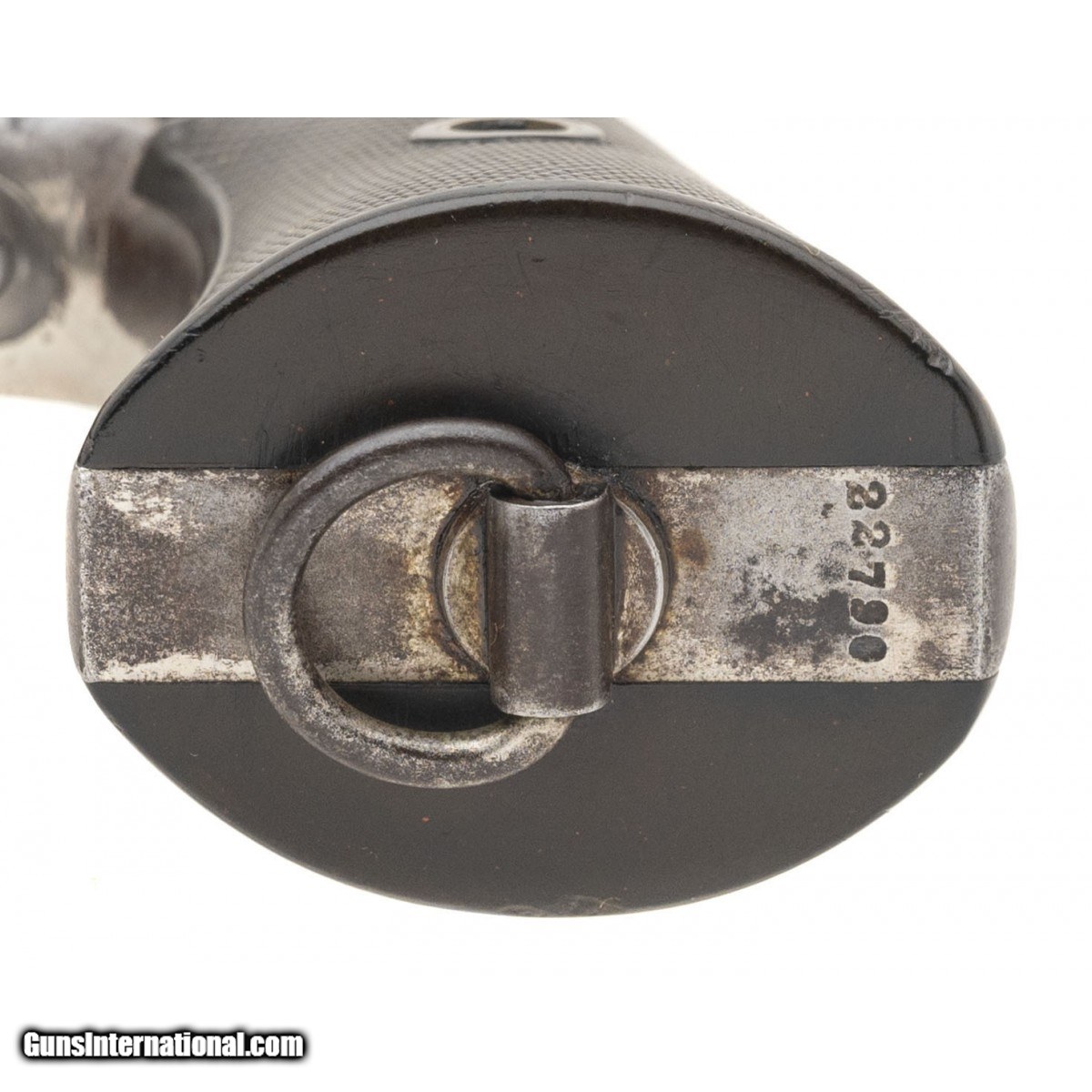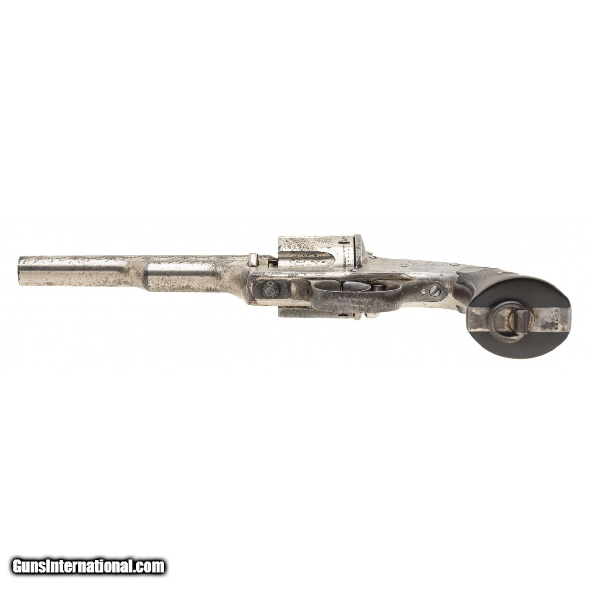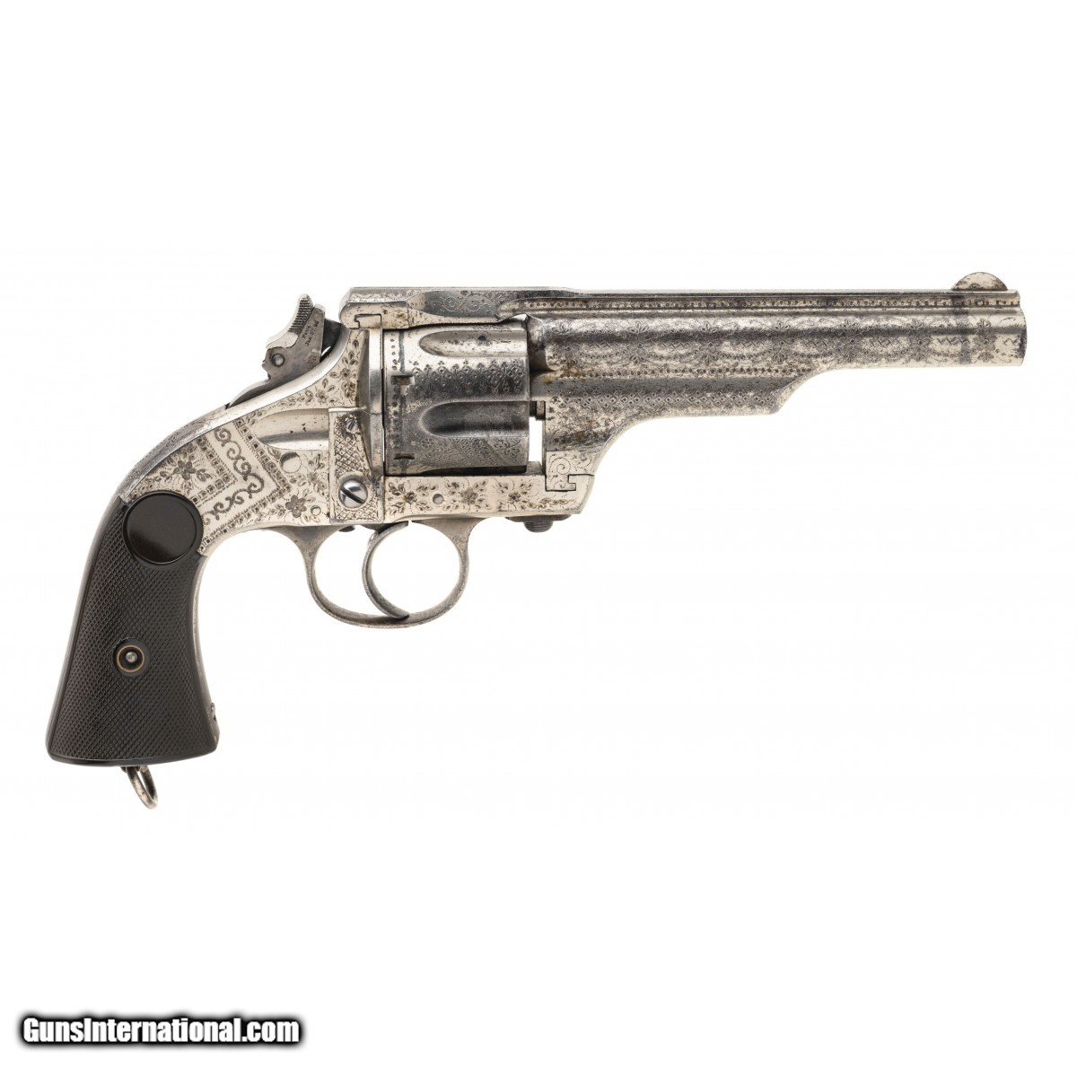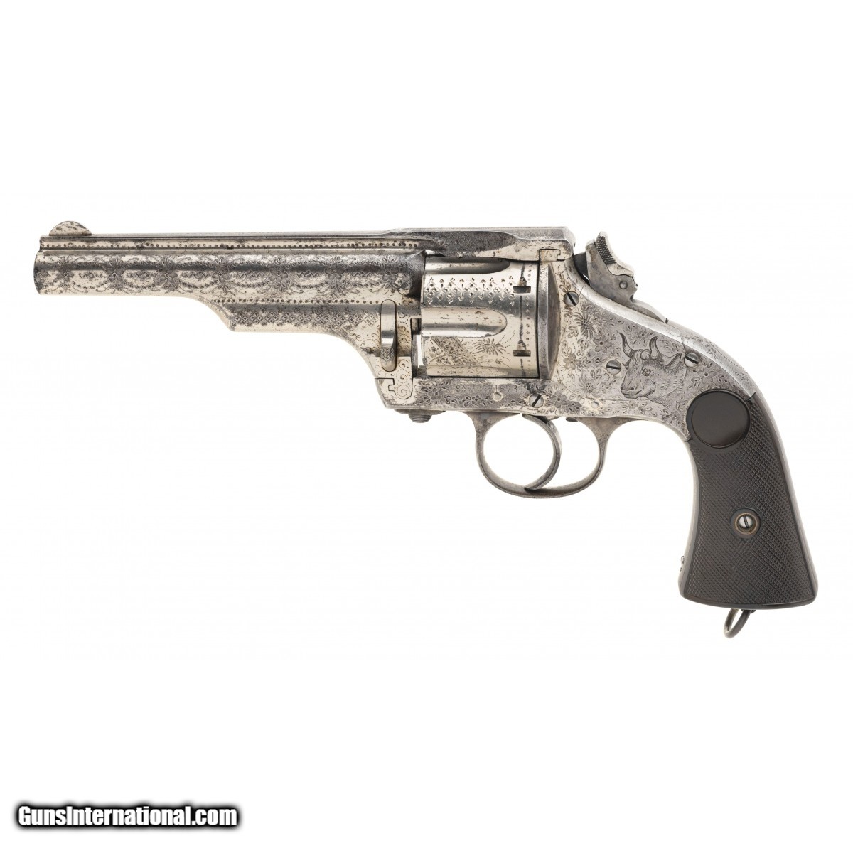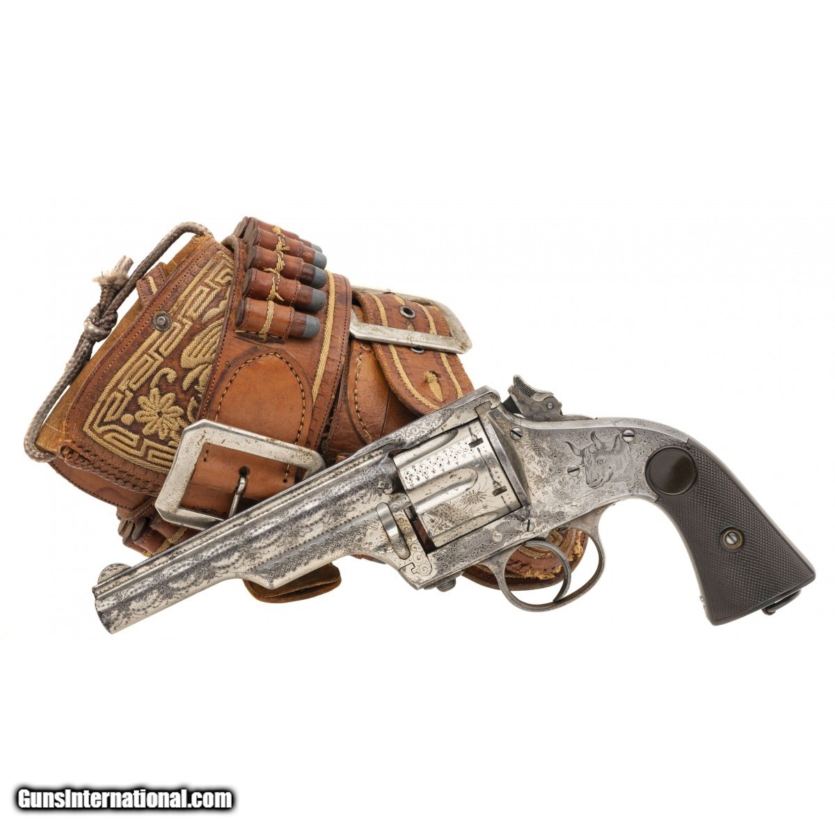 Description: "Serial number 22790. Made circa 1880s. 44-40 caliber with a 5 ½"barrel. This gun has 60% of the original nickel finish. This gun is very nicely factory engraved with a Bull’s head vignette on the left hand side of the frame. Grips are very good. This is a 4th model large frame with the squared butt, top strap and folding hammer. Along with this gun comes a Piteado Holster that has the Mexican snake and eagle. The Belt has a leather buckle that also has the Mexican eagle and snake. Piteado holsters and belts were almost always made in Mexico. SOLD Antique: Yes |