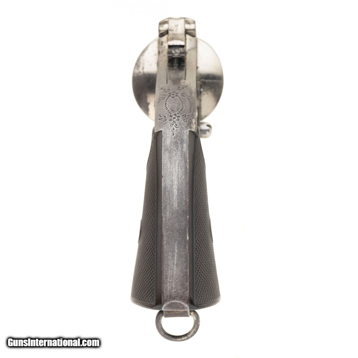 Description: "Serial number 22790. Made circa 1880s. 44-40 caliber with a 5 ½"barrel. This gun has 60% of the original nickel finish. This gun is very nicely factory engraved with a Bull’s head vignette on the left hand side of the frame. Grips are very good. This is a 4th model large frame with the squared butt, top strap and folding hammer. Along with this gun comes a Piteado Holster that has the Mexican snake and eagle. The Belt has a leather buckle that also has the Mexican eagle and snake. Piteado holsters and belts were almost always made in Mexico. SOLD Antique: Yes |