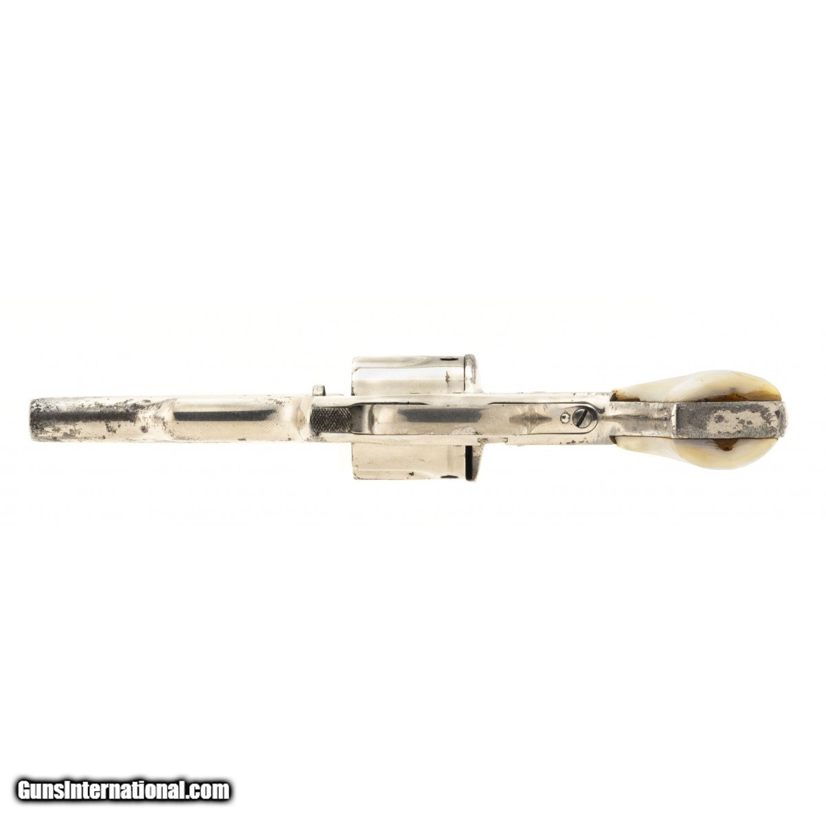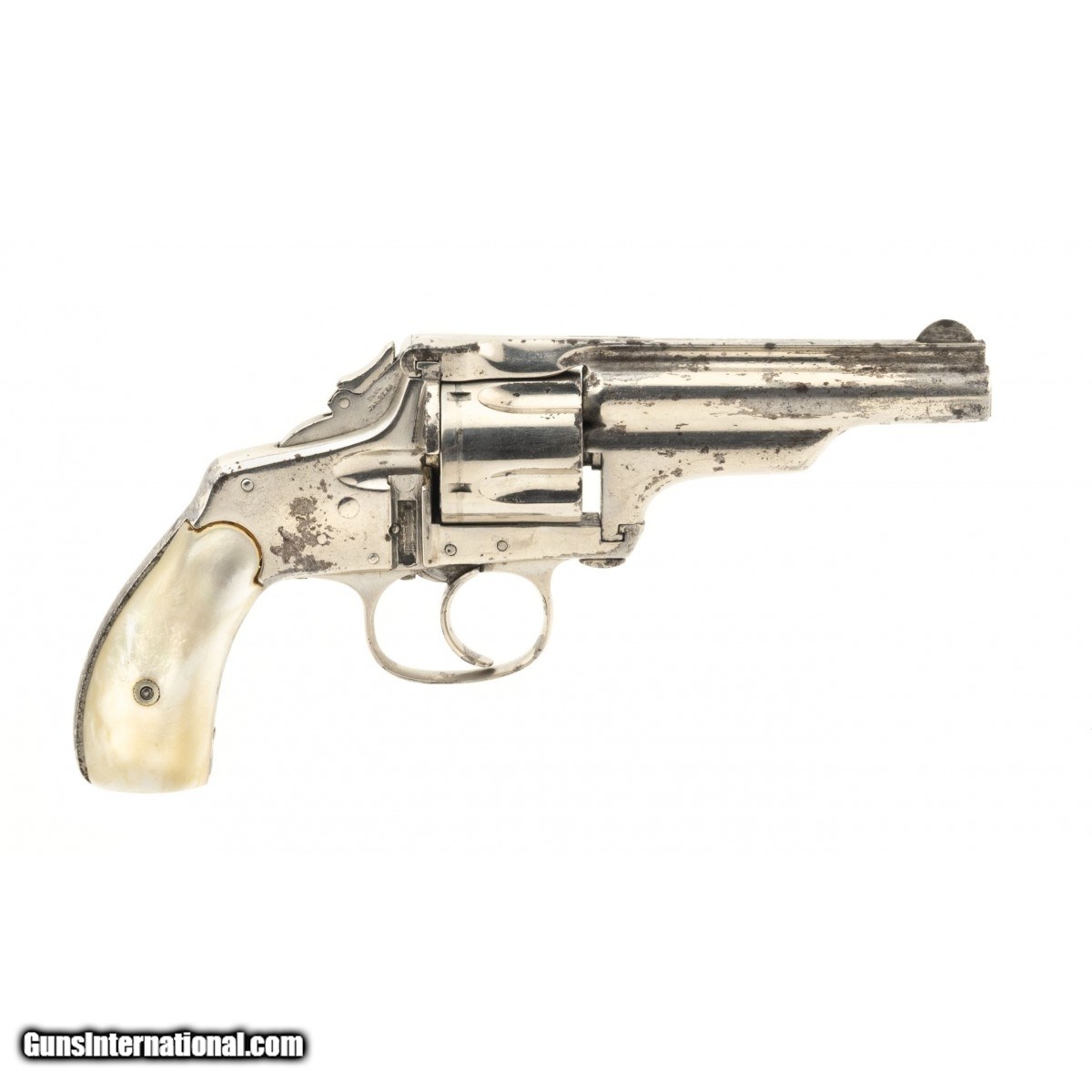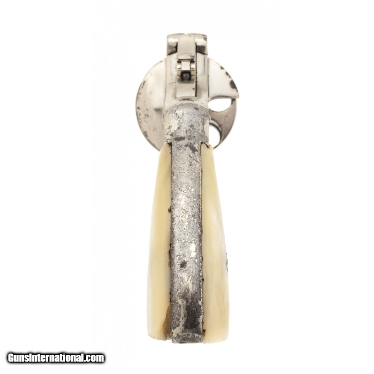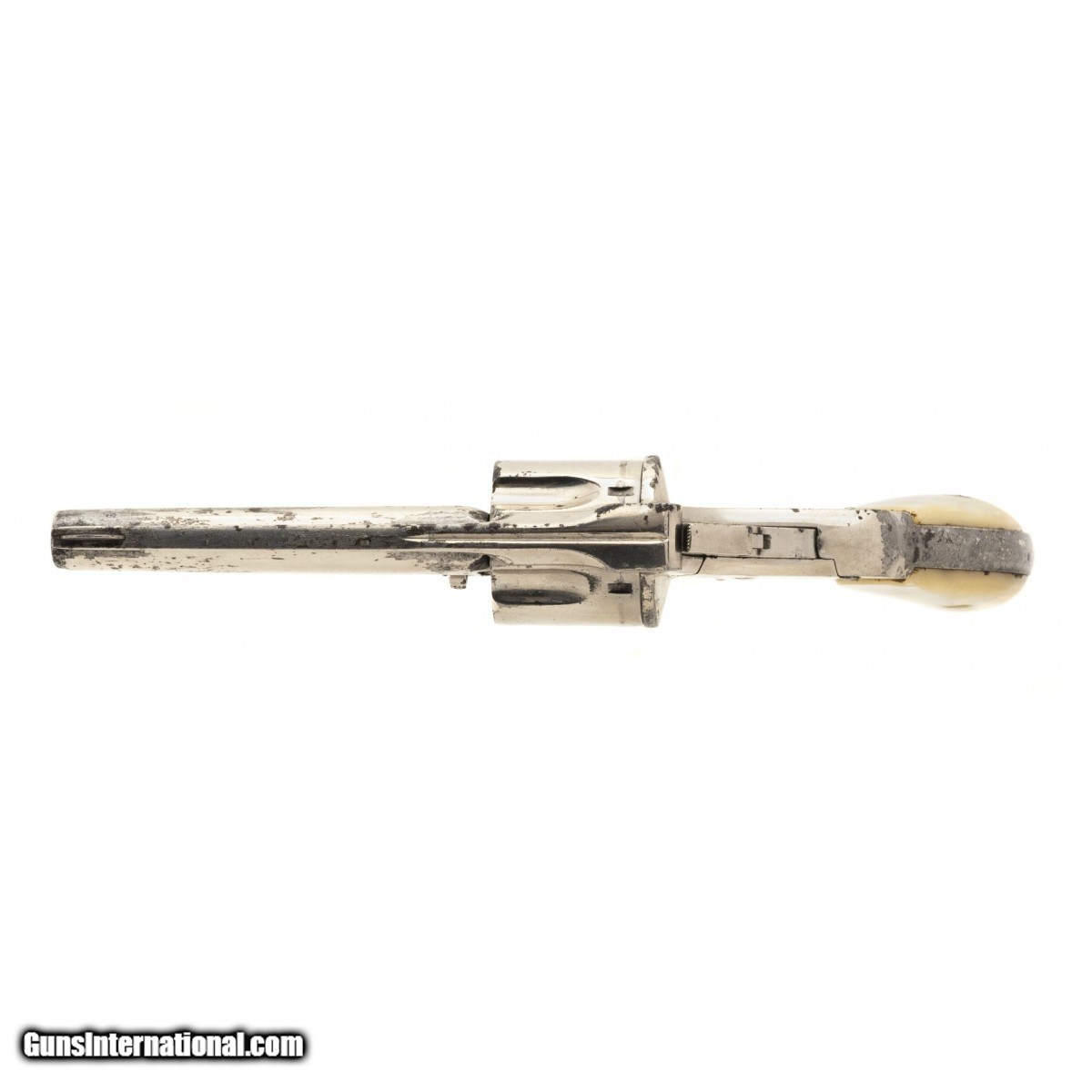Description: " Circa 1880s. Metal has an old replanting that has some flaking. Revolver is missing gate. Action works properly and locks up tight. Grips are mother of pearl; left grip has a chip at heel. Good overall condition. SOLD Antique: Yes |