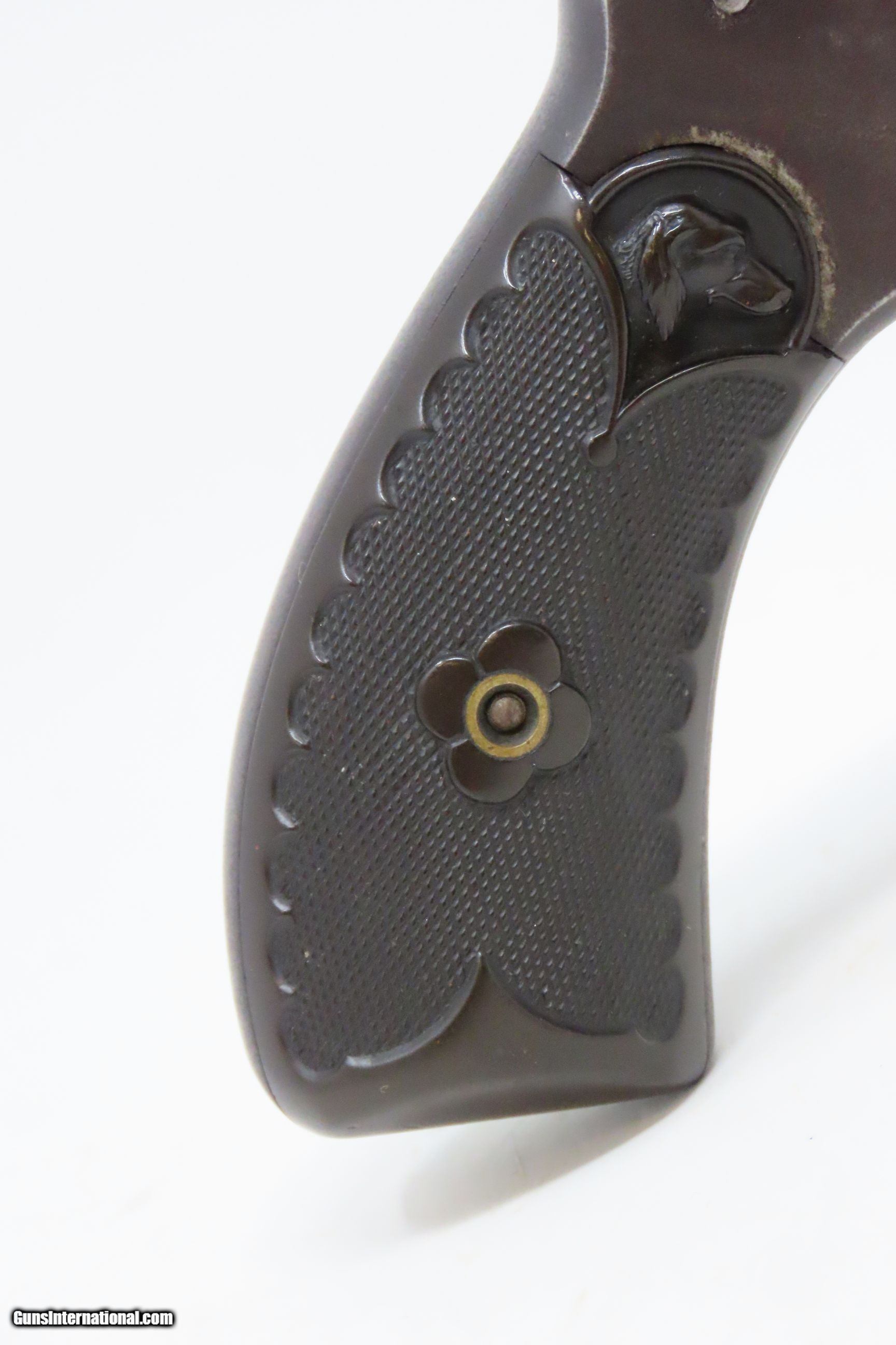 Description: c1870s Early Antique MERWIN HULBERT .38 S&W Single Action Pocket Revolver 5-Shot .38 Spur Trigger Revolver Here we present an antique Merwin, Hulbert & Co. Single Action Revolver, made circa the 1870s by Hopkins & Allen in Norwich, Connecticut. Only a few thousand were produced. These revolvers are considered today to be some of the best made of the late 19th Century and the Wild West, even better in some minds than similar Colts and Smith & Wessons. These pistols certainly tended to have very well-thought and different features than their competition, and they were extremely well-made. One such feature was the method of ejection. Loading was achieved by placing the hammer at half-cock and being able to revolve the cylinder to single feed cartridges. These early guns had a pierced recoil shield, as this one does, rather than the more common sliding loading gate. The aperture is set so that it will not let the cartridges fall out when the hammer is either at rest or fully cocked. It will only line up with the chambers when in the half-cocked position. If one wanted to unload the gun, they could simply push the latch back on the bottom of the gun, twist the barrel and cylinder assembly and pull forward. Only the empty brass would come out as the space created was shorter than a loaded cartridge, enabling the shooter to top of his gun and keep rounds available. An ingenious method was designed to achieve this that included a machined cut on the cylinder axis pin and a ledge on the breech face that kept the cartridge rims underneath. This system was also advantageous for forcefully removing stuck cartridges, providing lots of mechanical advantage. The overall condition is very good. Original nickel finish/patina. The action remains strong, though there is a chamber on which the hammer will not stay cocked. The bore is in good shape for age with good rifling. The trademark dog’s head grips are in nice condition. A nice example of this neat little alternative to the Colts and Smith & Wessons that were far more prolific! Own the original! This is a legitimate antique and not a reproduction. Barrel is 3-1/2 inches. Caliber: .38 S&W Overall condition as seen in photos. Very Fast. Very Safe. FREE SHIPPING WORLDWIDE. Delivered directly to your door by express mail! Guaranteed AUTHENTIC & Includes CERTIFICATE OF AUTHENTICITY. ancestryguns $1500 #217425 SOLD Antique: Yes |